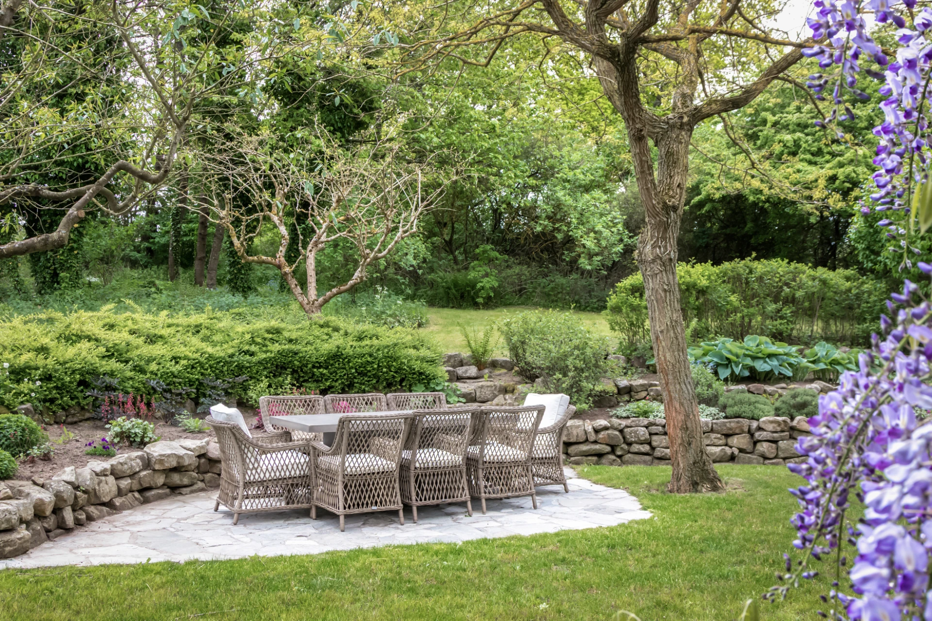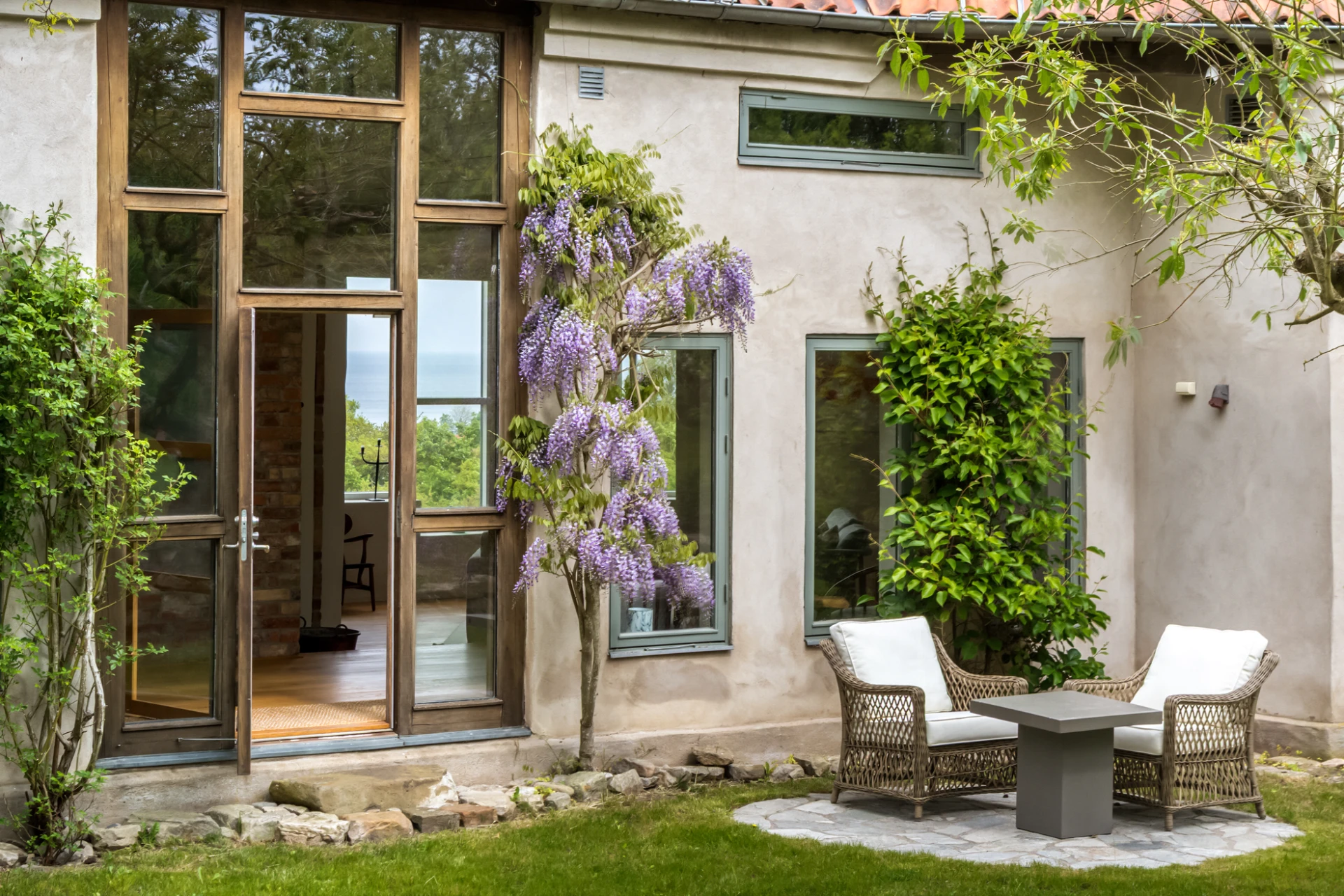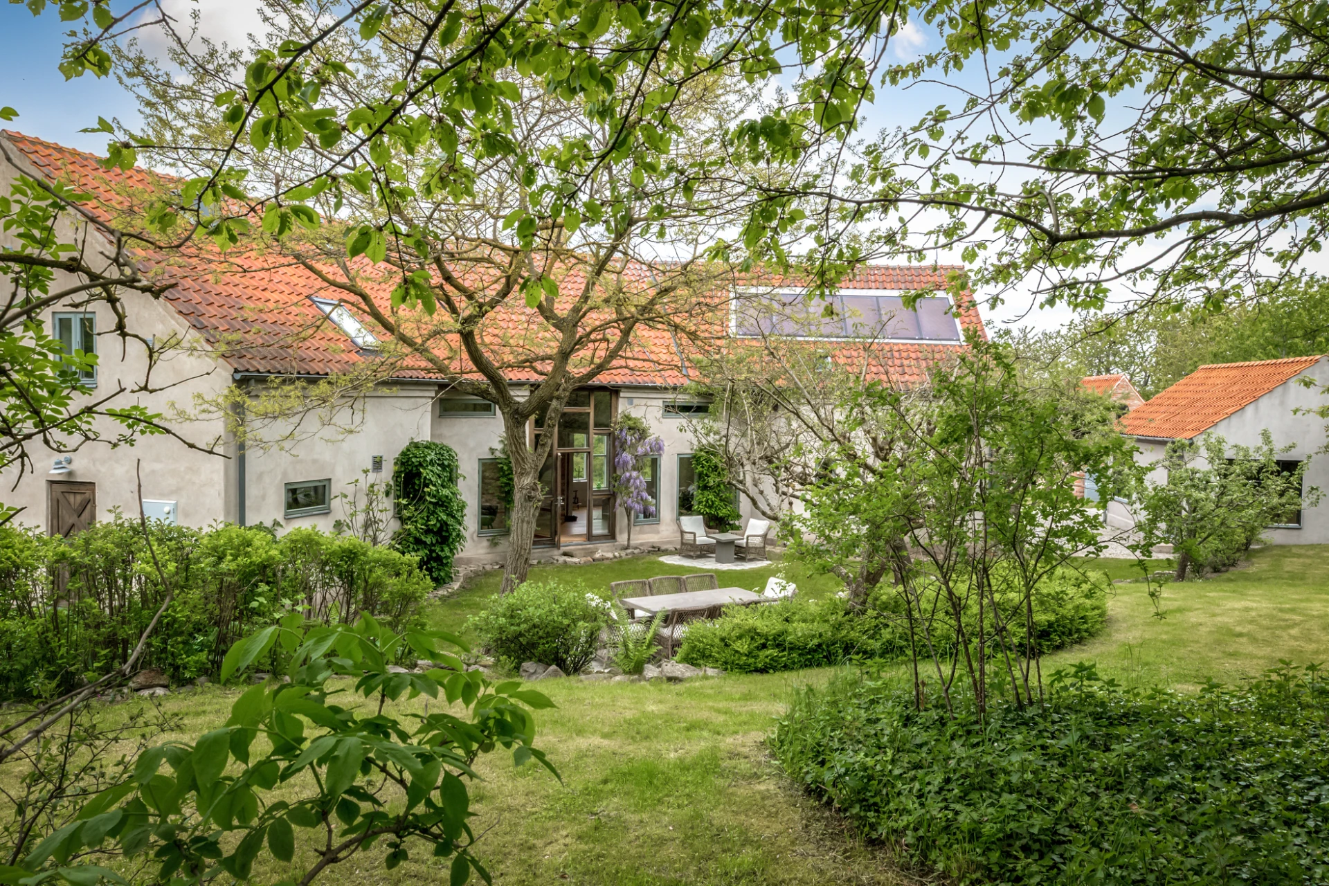 Innergårdens trädgård för tankarna till Medelhavet. Med sina omfamnande stenterrasser och med alla växter har det skapats en lummig oas med skyddat klimat. Här finns exotiska träd och buskar som kiwi, persika, vinrankor och fikon. Det finns även två stora vårdträd, ett mandelträd och en robinia som ger skön skugga under heta soliga sommardagar. Det är också ett väldigt rikt fågelliv med bland annat näktergal som sjunger vackert. På kvällarna kommer lövgrodor och syrsor igång och då är det lätt att tro att man är vid sydligare breddgrader. På framsidan av huset sluttar trädgården ner mot byn och havet. Här prunkar rosor i en härlig mångfald och ger på sina ställen plats åt lavendel, örter, bärbuskar, äppelträd och mycket mer. Den stora tomten ramas in av en stengärdsgård åt söder och öster och på andra sidan stengärdsgården går fåren och betar.