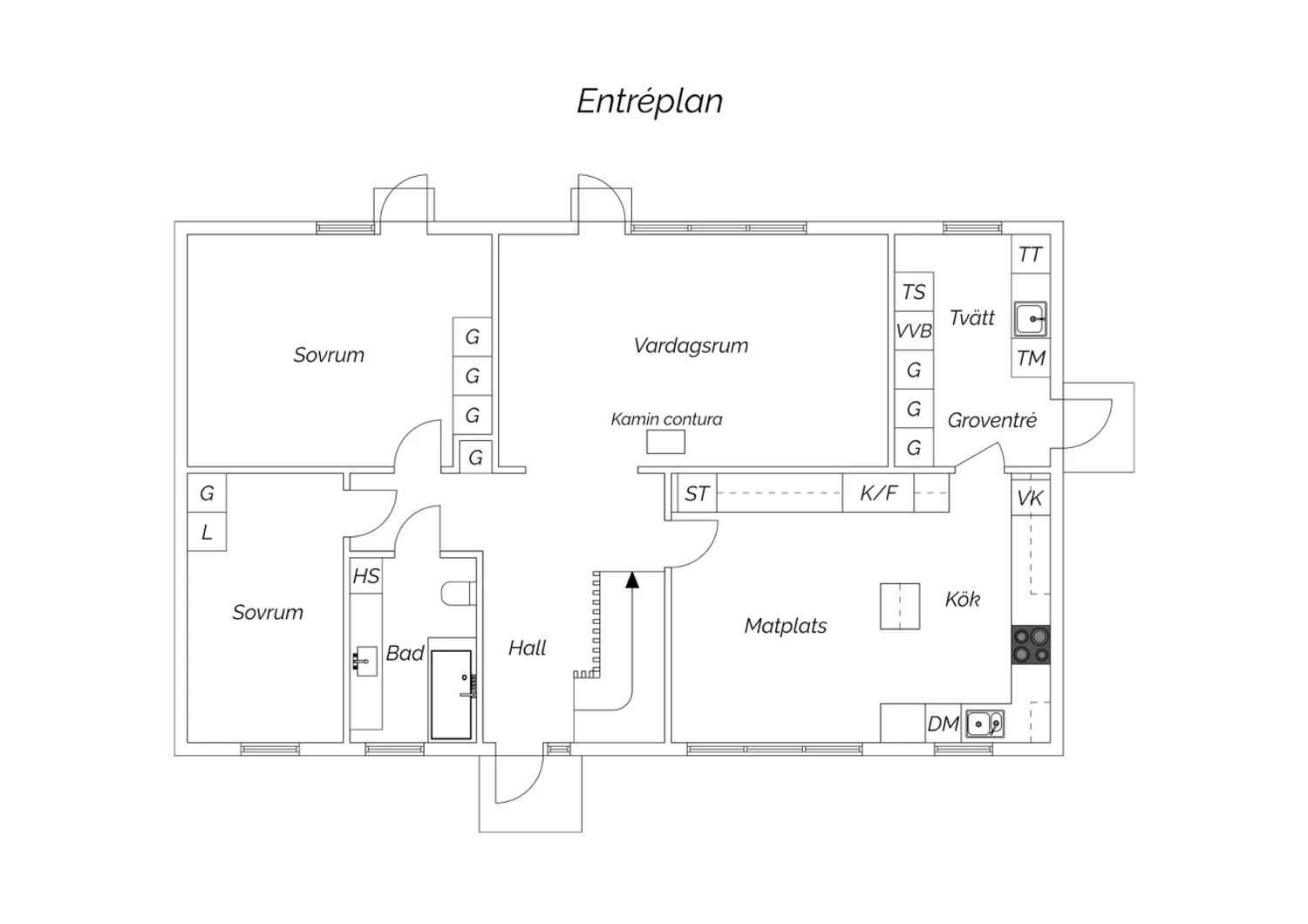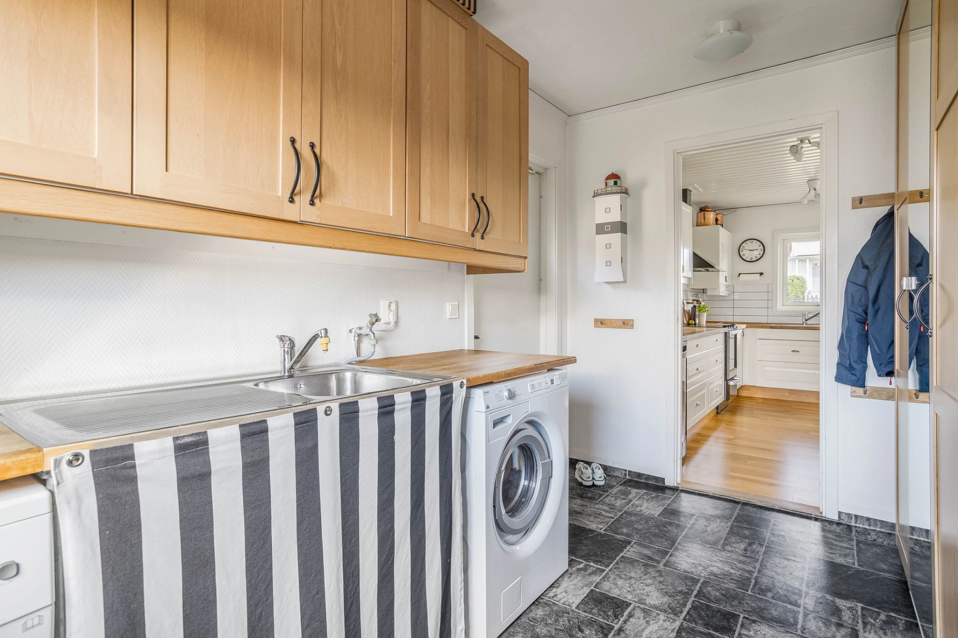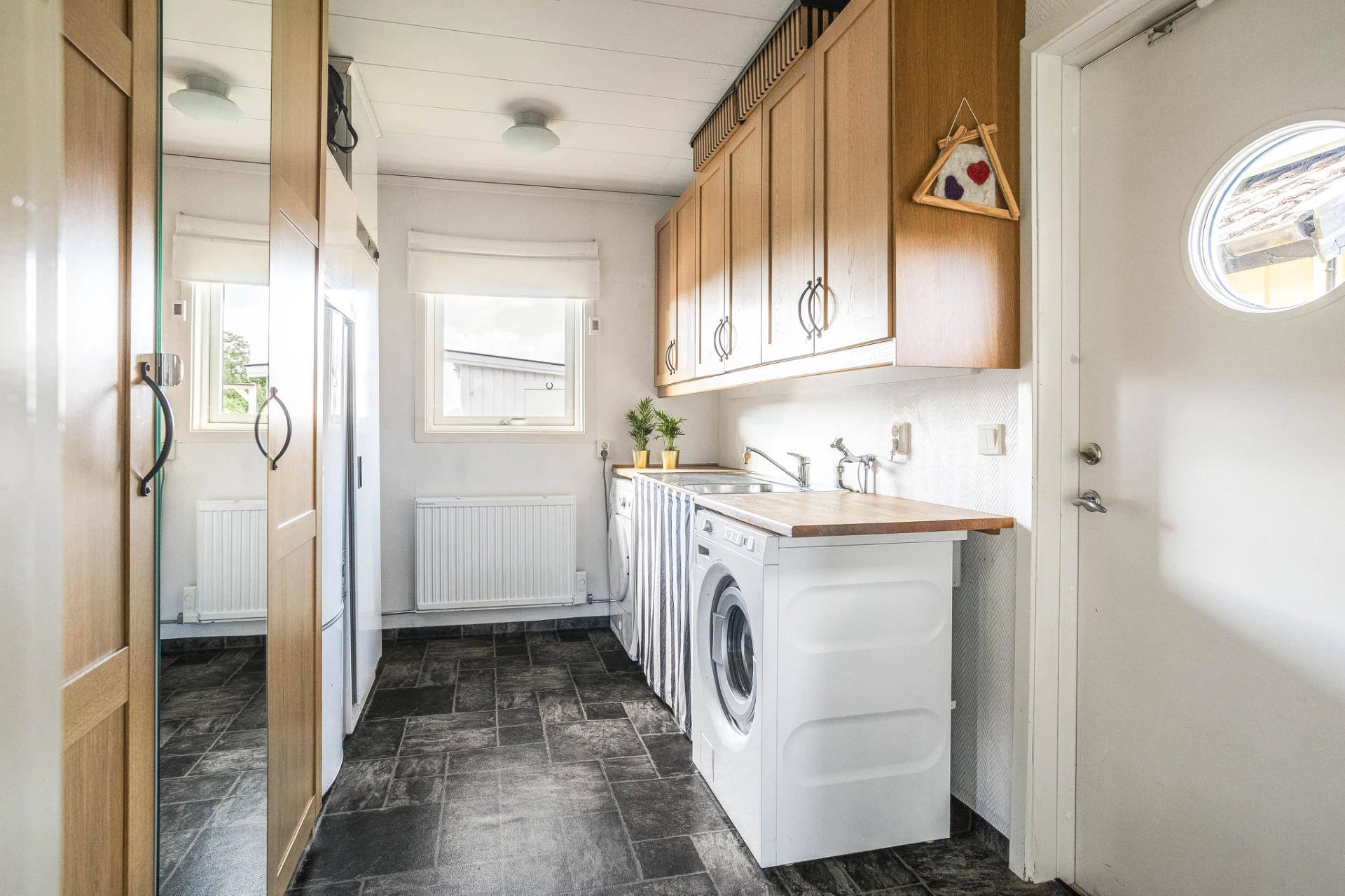 Praktisk groventré/tvättstuga med bänkyta och gott om förvaring i skåp och garderober. Här finns tvättmaskin, torktumlare, torkskåp samt varmvattenberedare.
