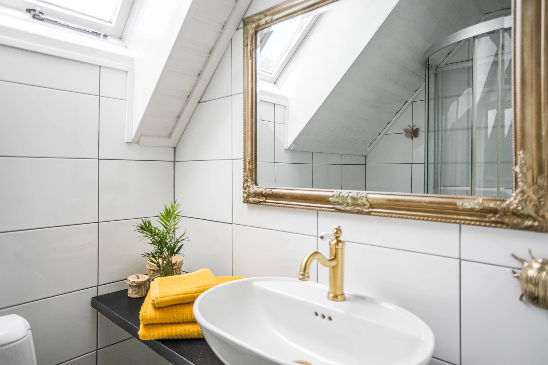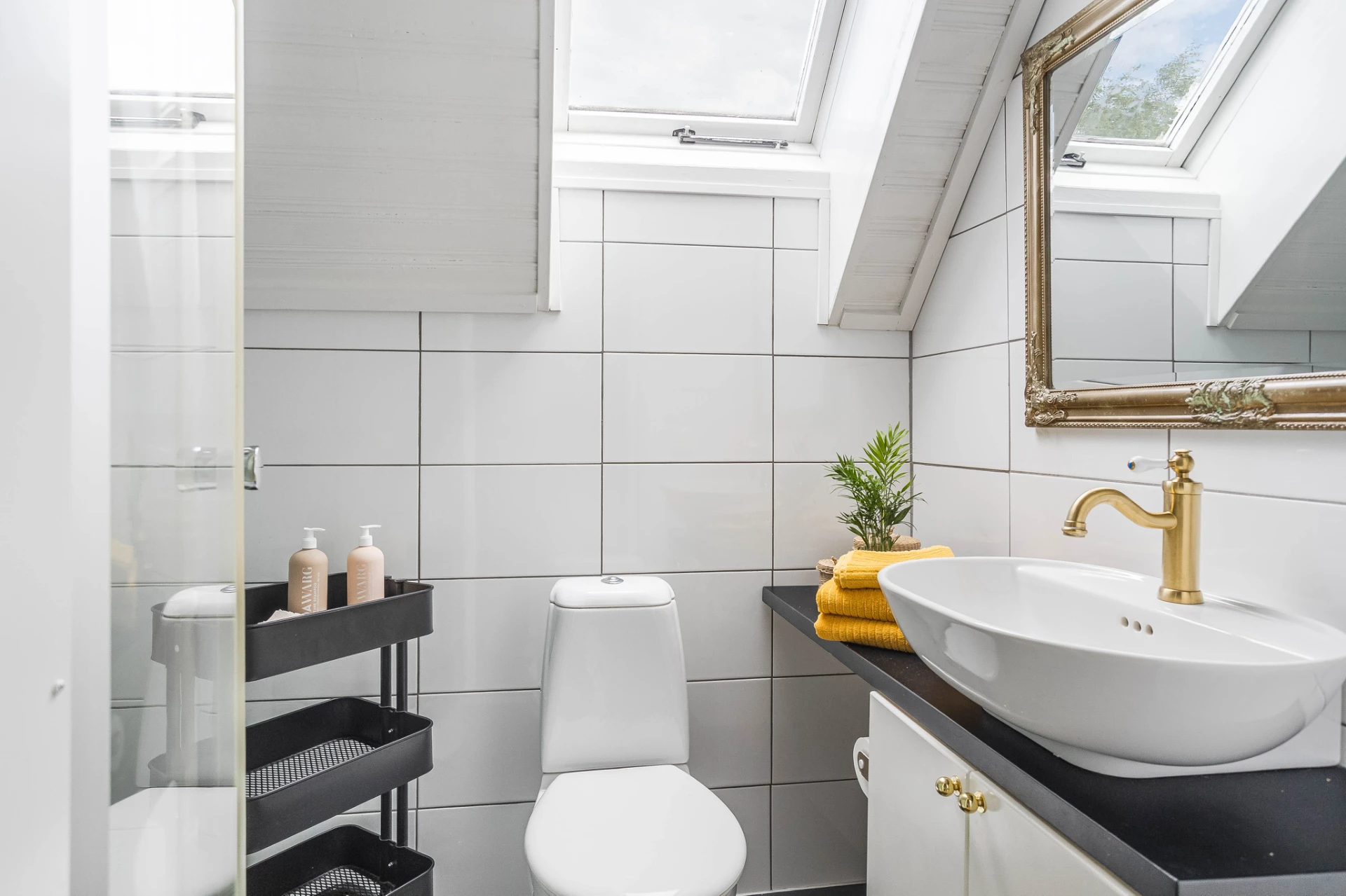 Helkaklat badrum med handfat med kommod, wc, dusch samt takfönster.