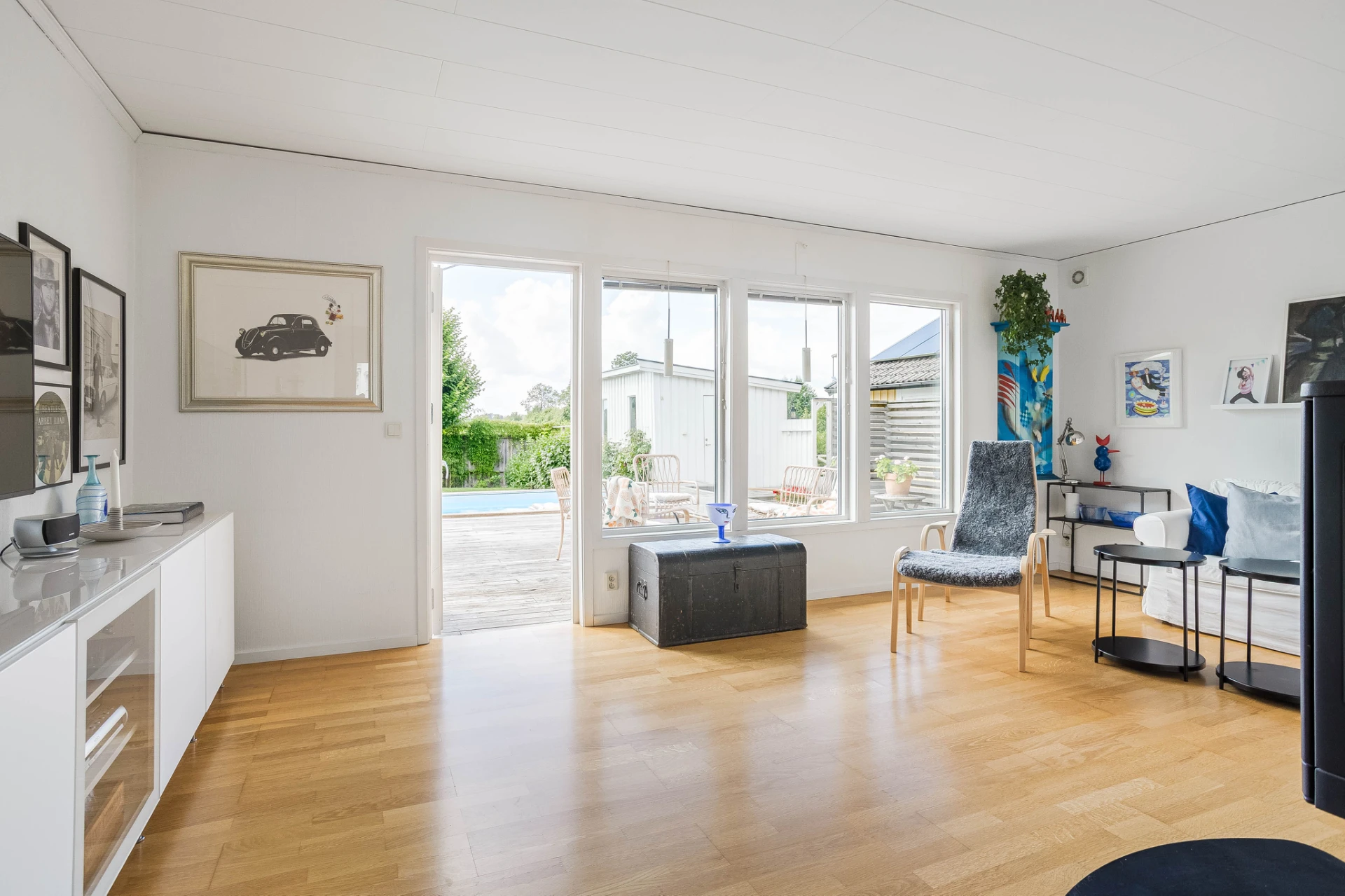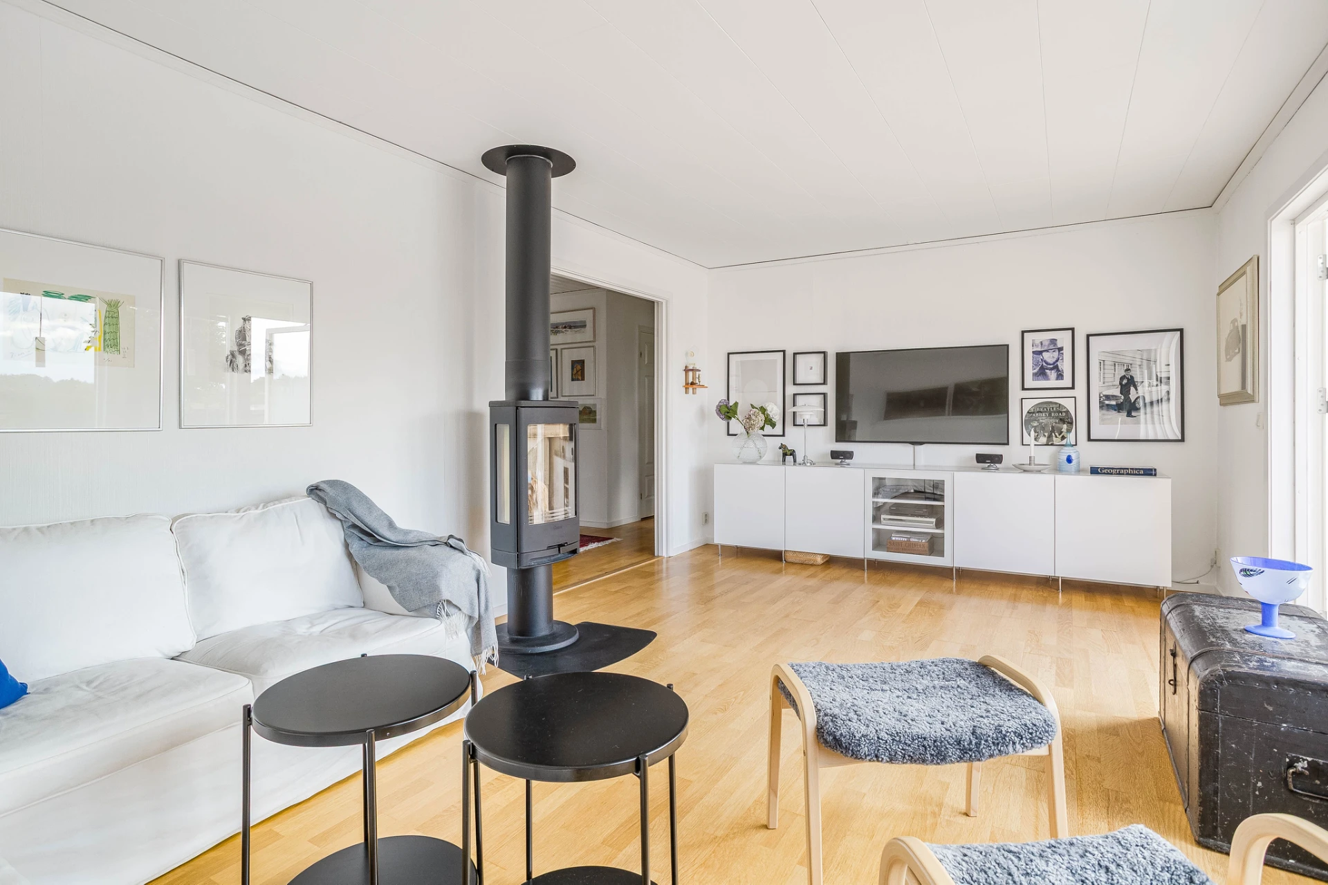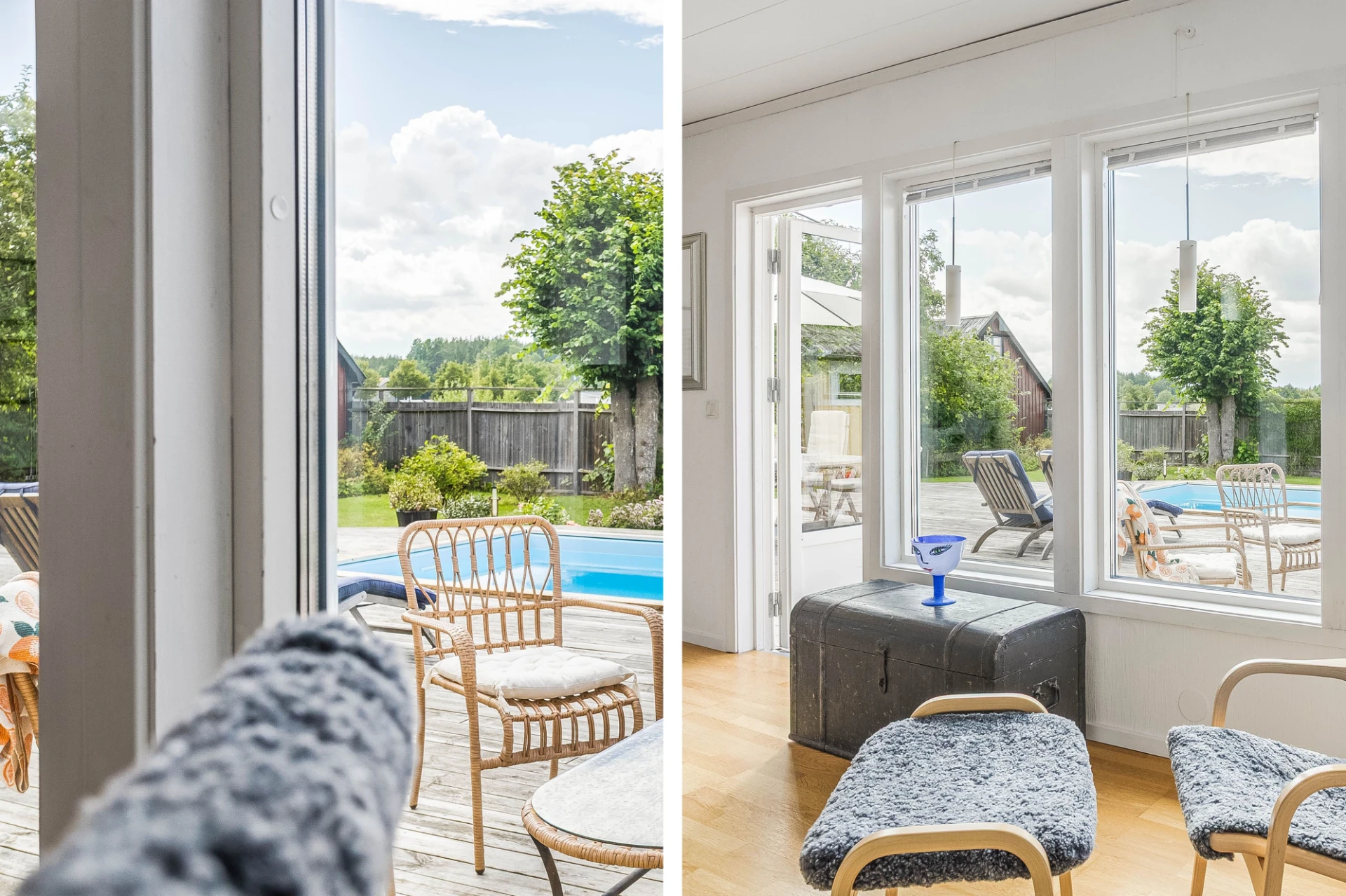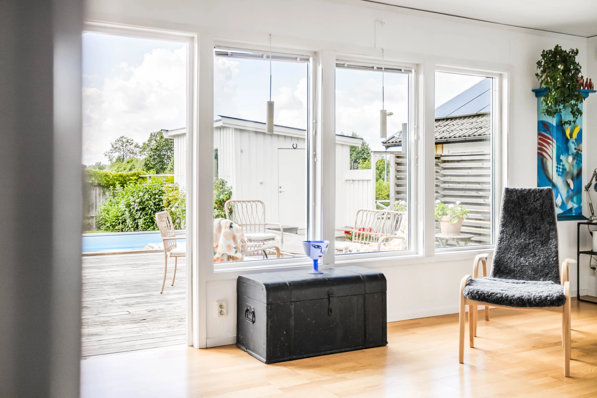 Ljust och trivsamt vardagsrum med hög mysfaktor i värmande kamin. Stort fönsterparti ger ett fint ljusinsläpp och bjuder på vacker vy mot poolområdet och fälten i väster. Altandörren suddar ut gränsen mellan ute och inne.