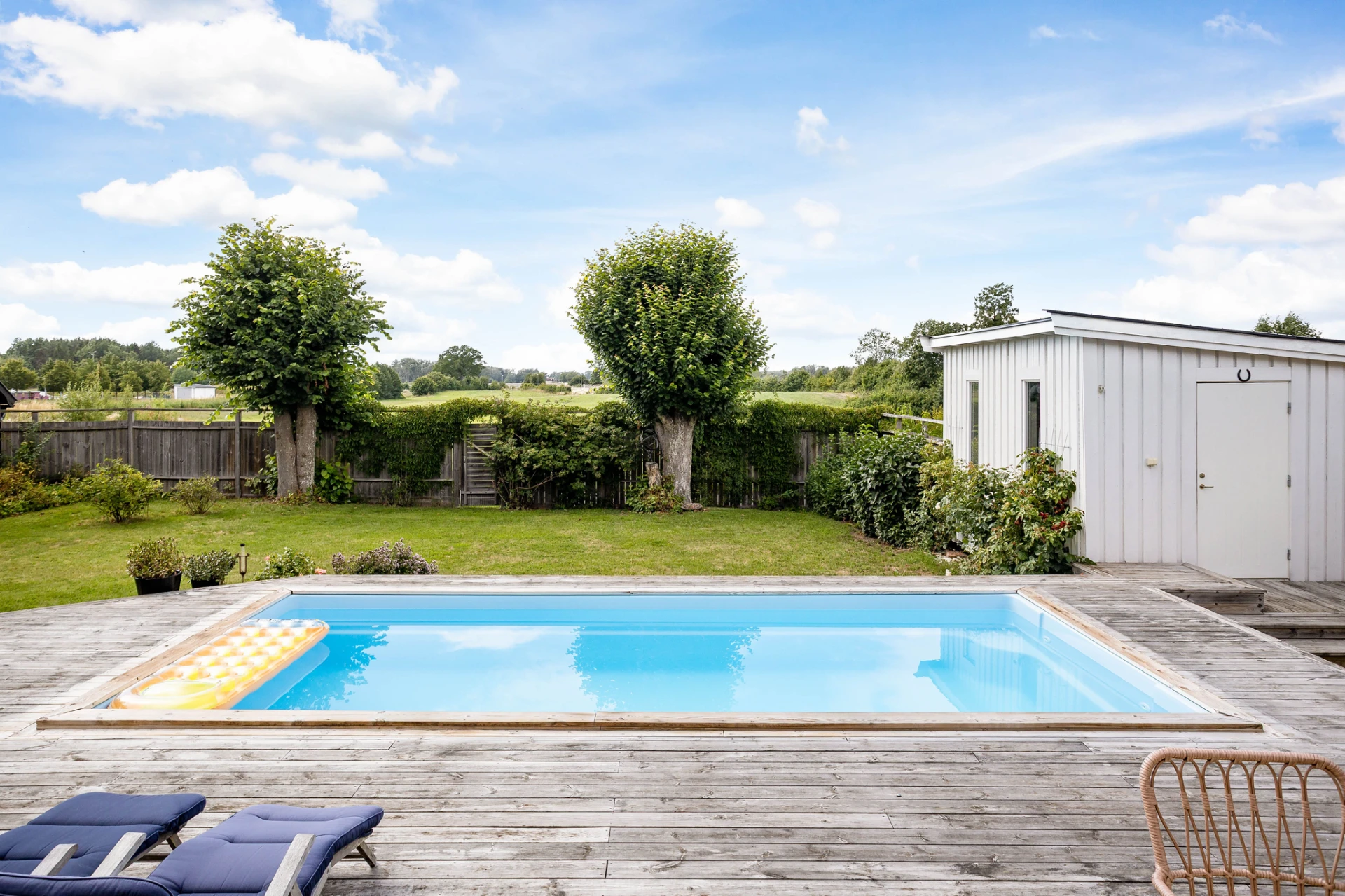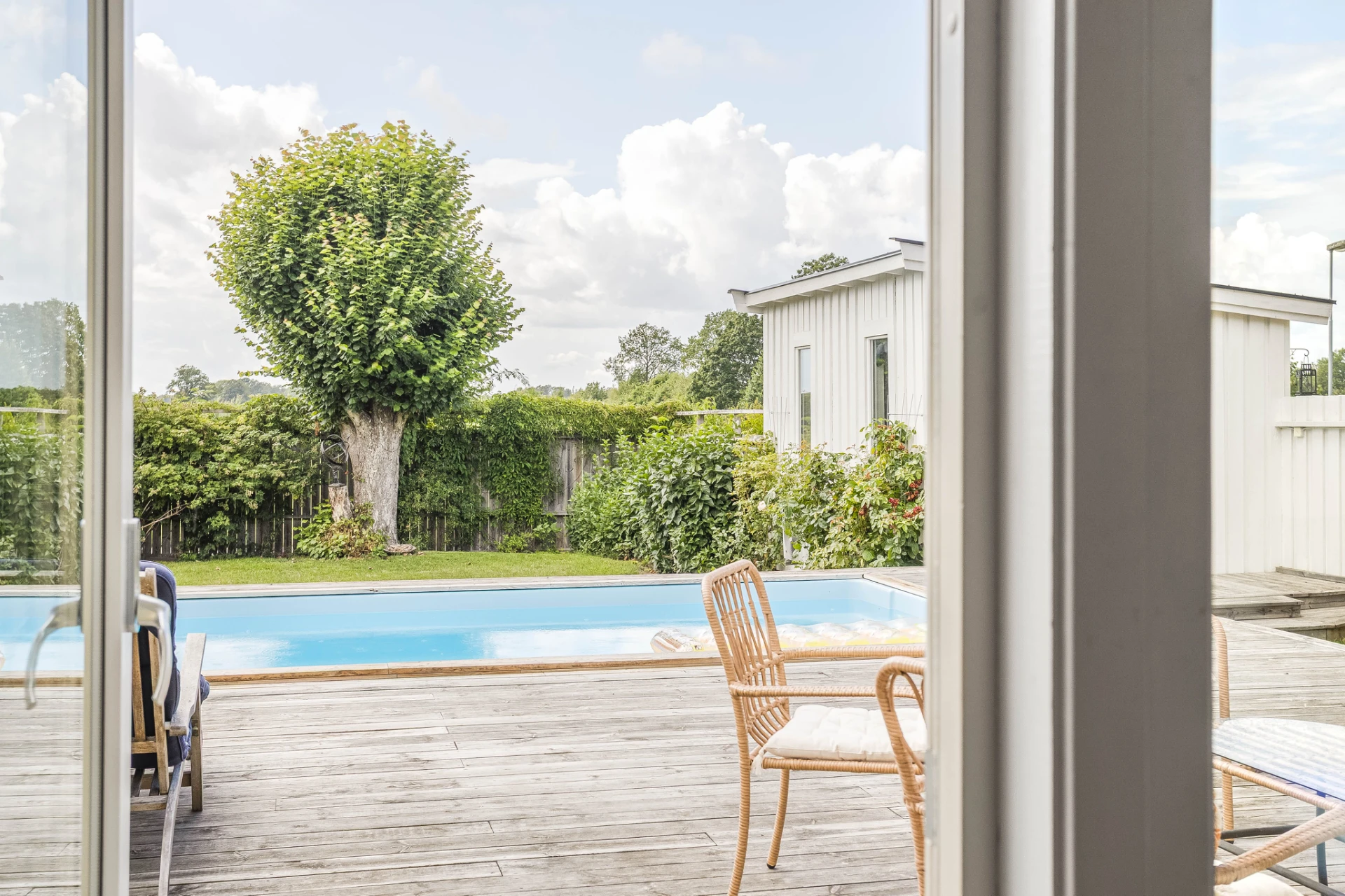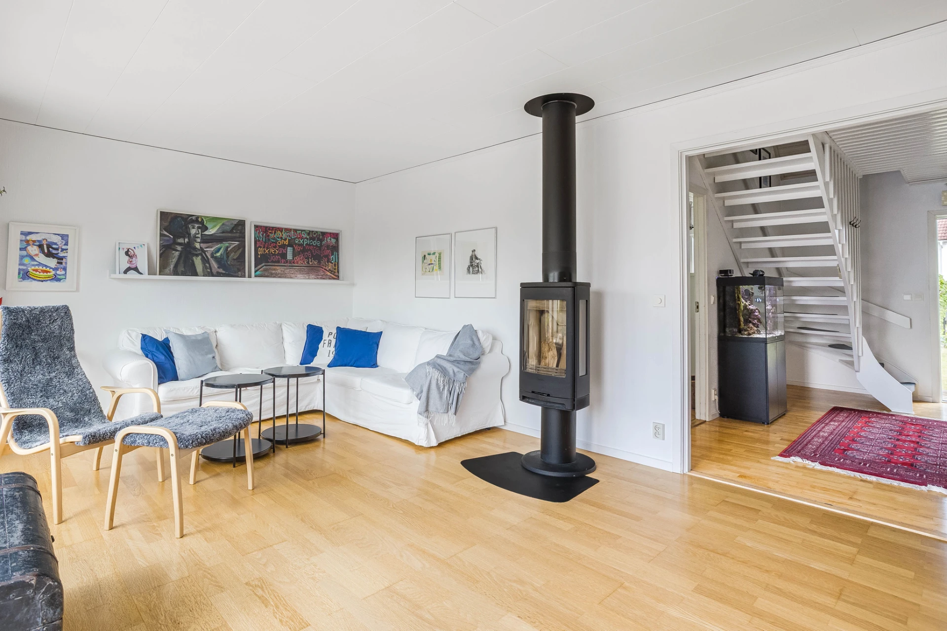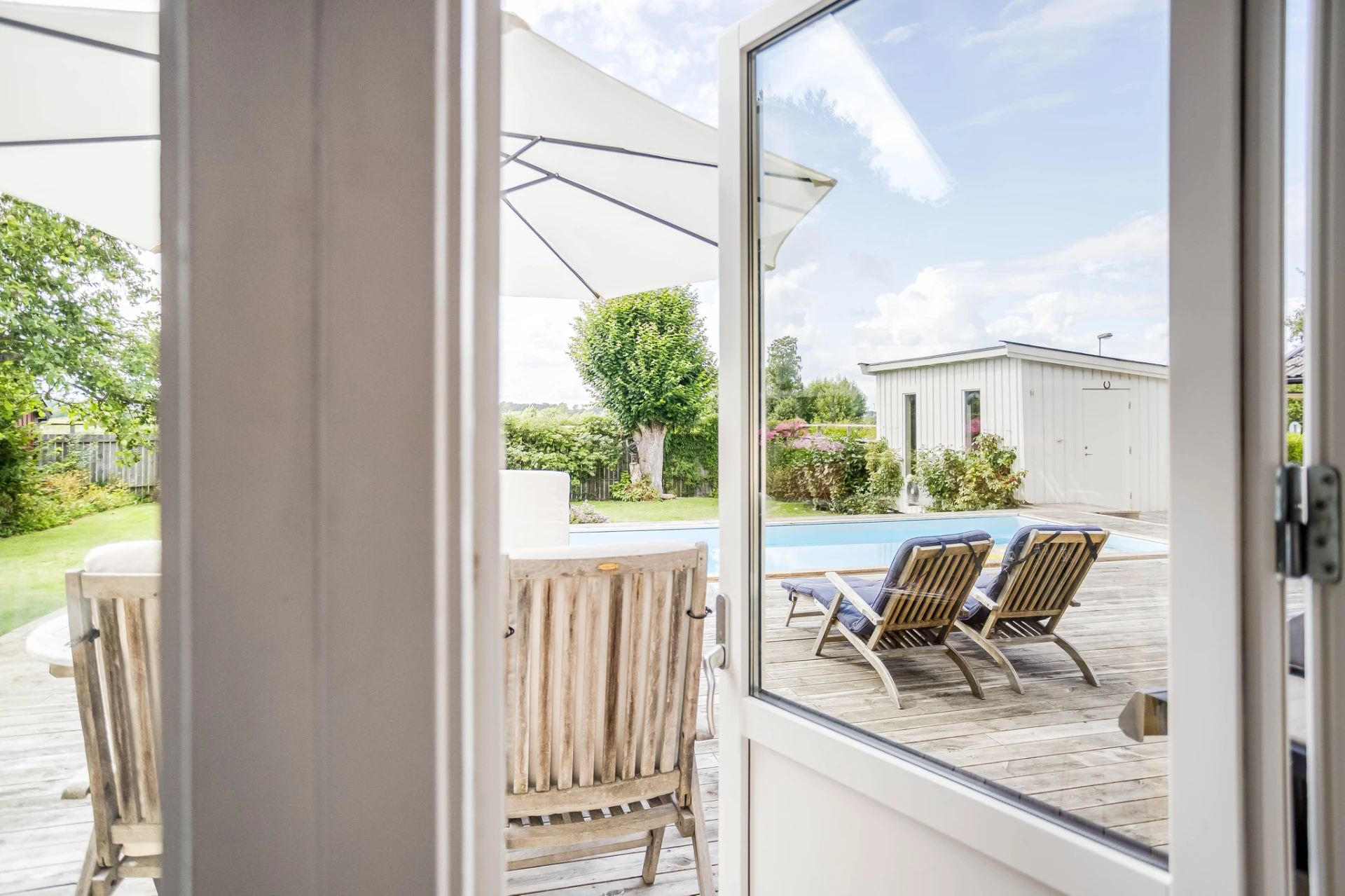 Ljust och trivsamt vardagsrum med hög mysfaktor i värmande kamin. Stort fönsterparti ger ett fint ljusinsläpp och bjuder på vacker vy mot poolområdet och fälten i väster. Altandörren suddar ut gränsen mellan ute och inne.