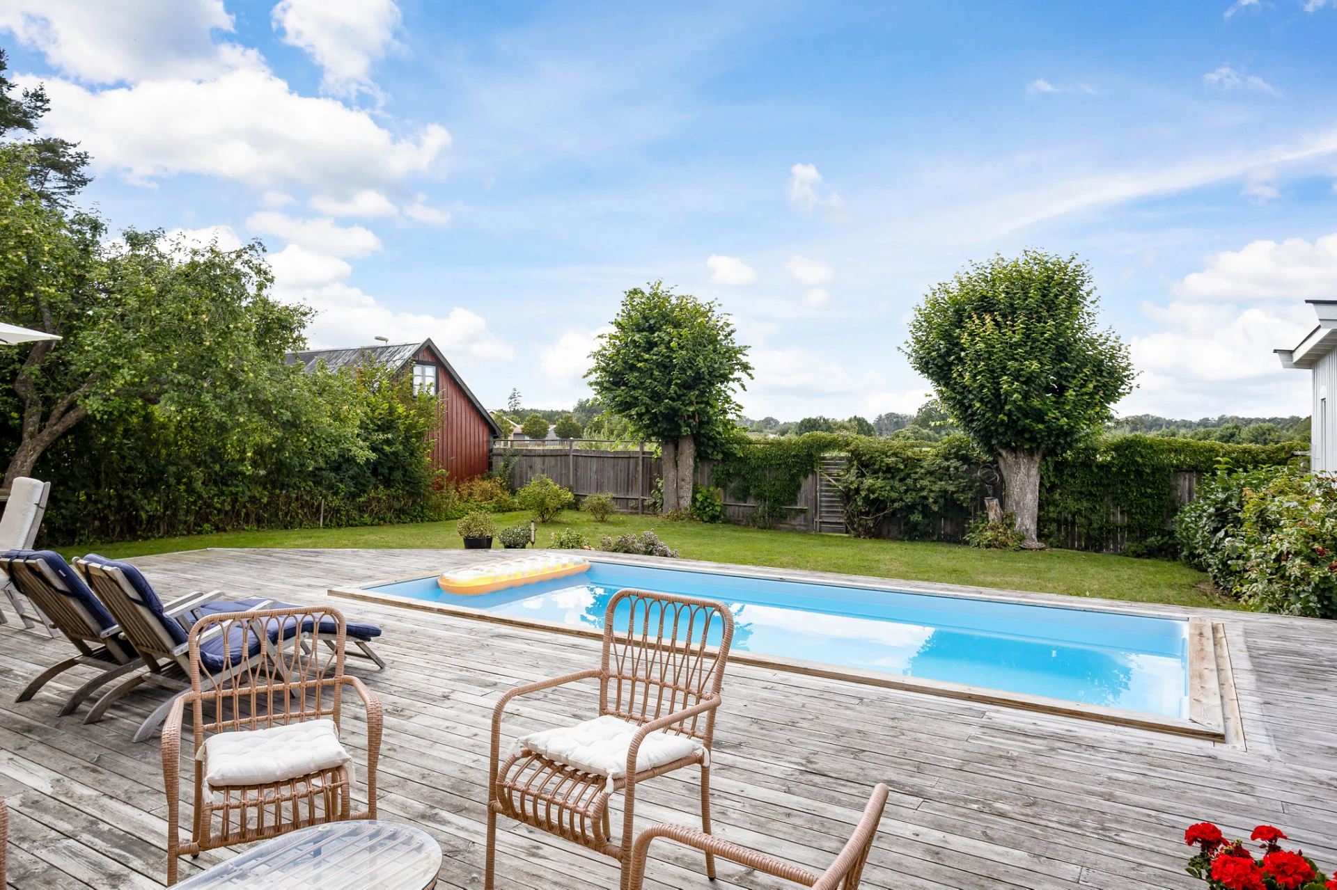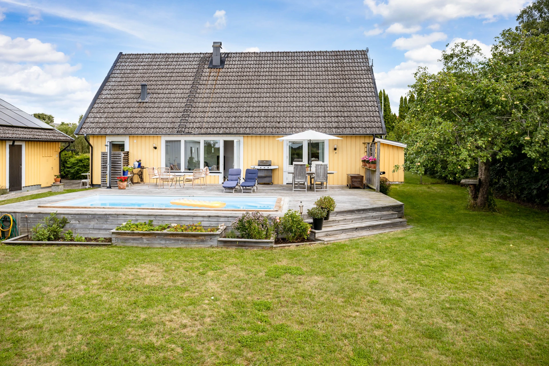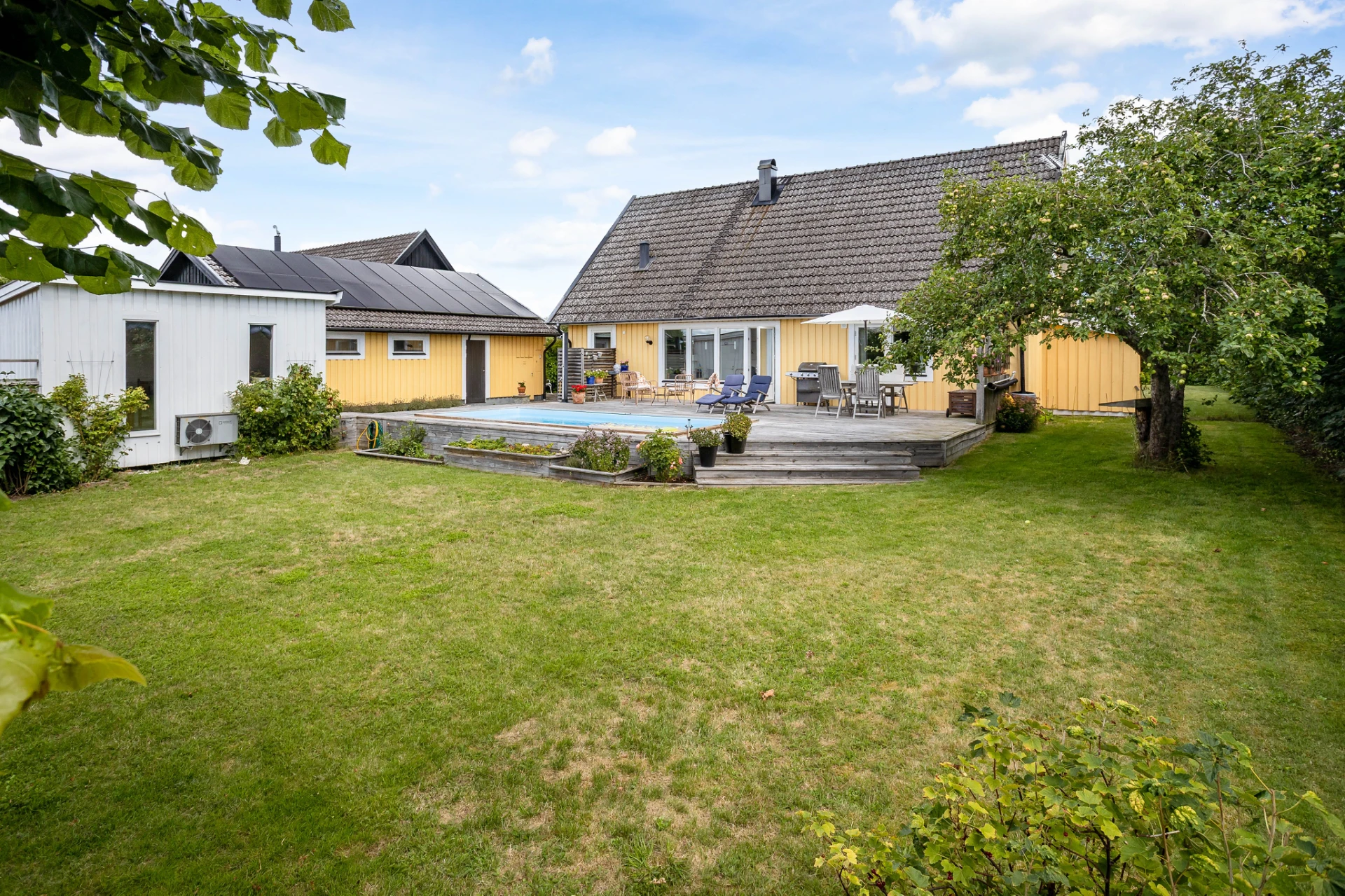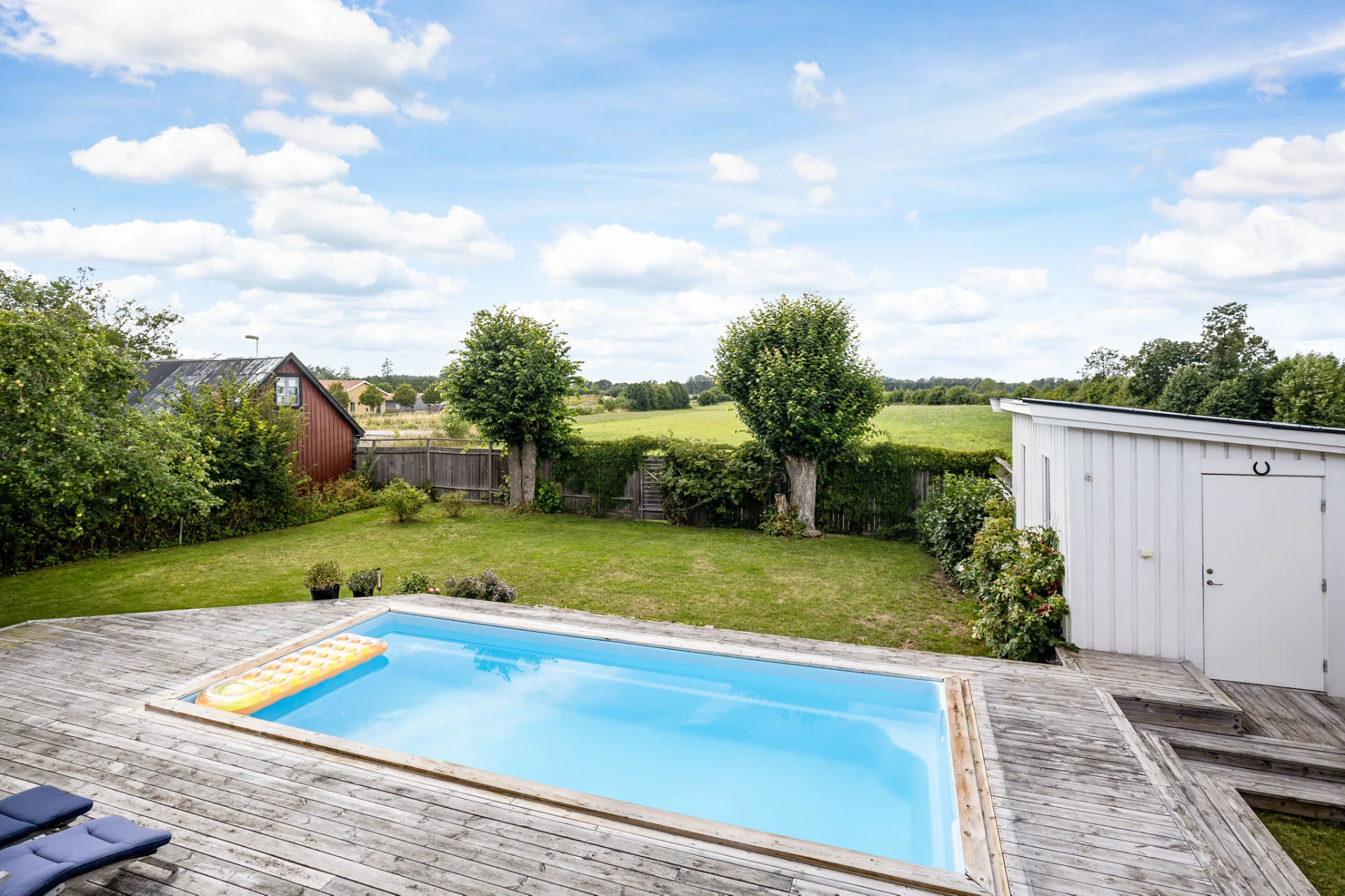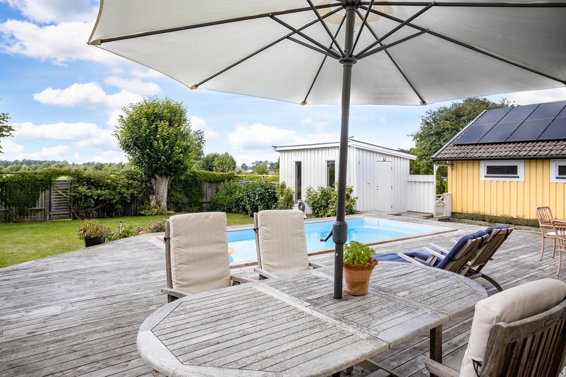 Ljust och trivsamt vardagsrum med hög mysfaktor i värmande kamin. Stort fönsterparti ger ett fint ljusinsläpp och bjuder på vacker vy mot poolområdet och fälten i väster. Altandörren suddar ut gränsen mellan ute och inne.