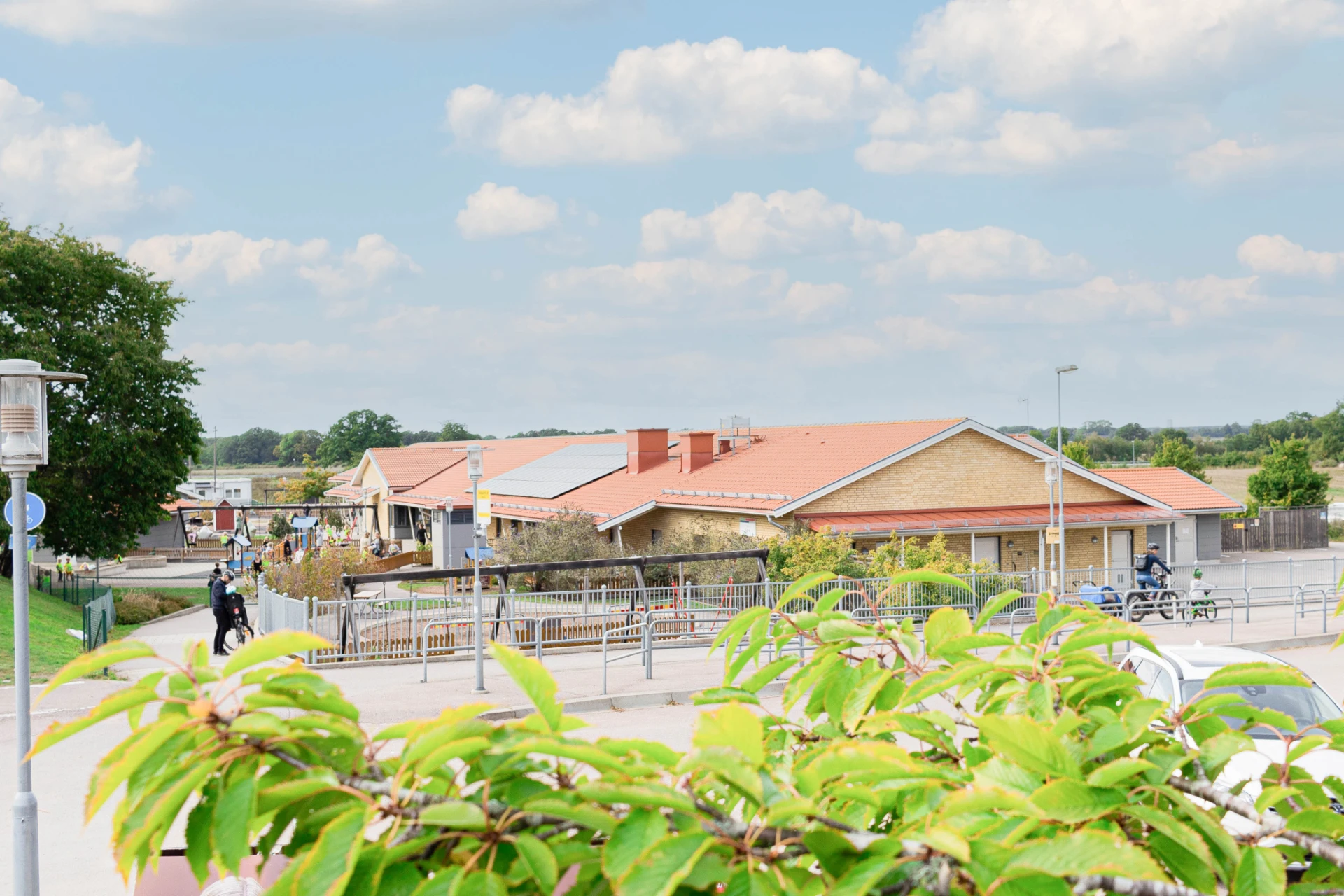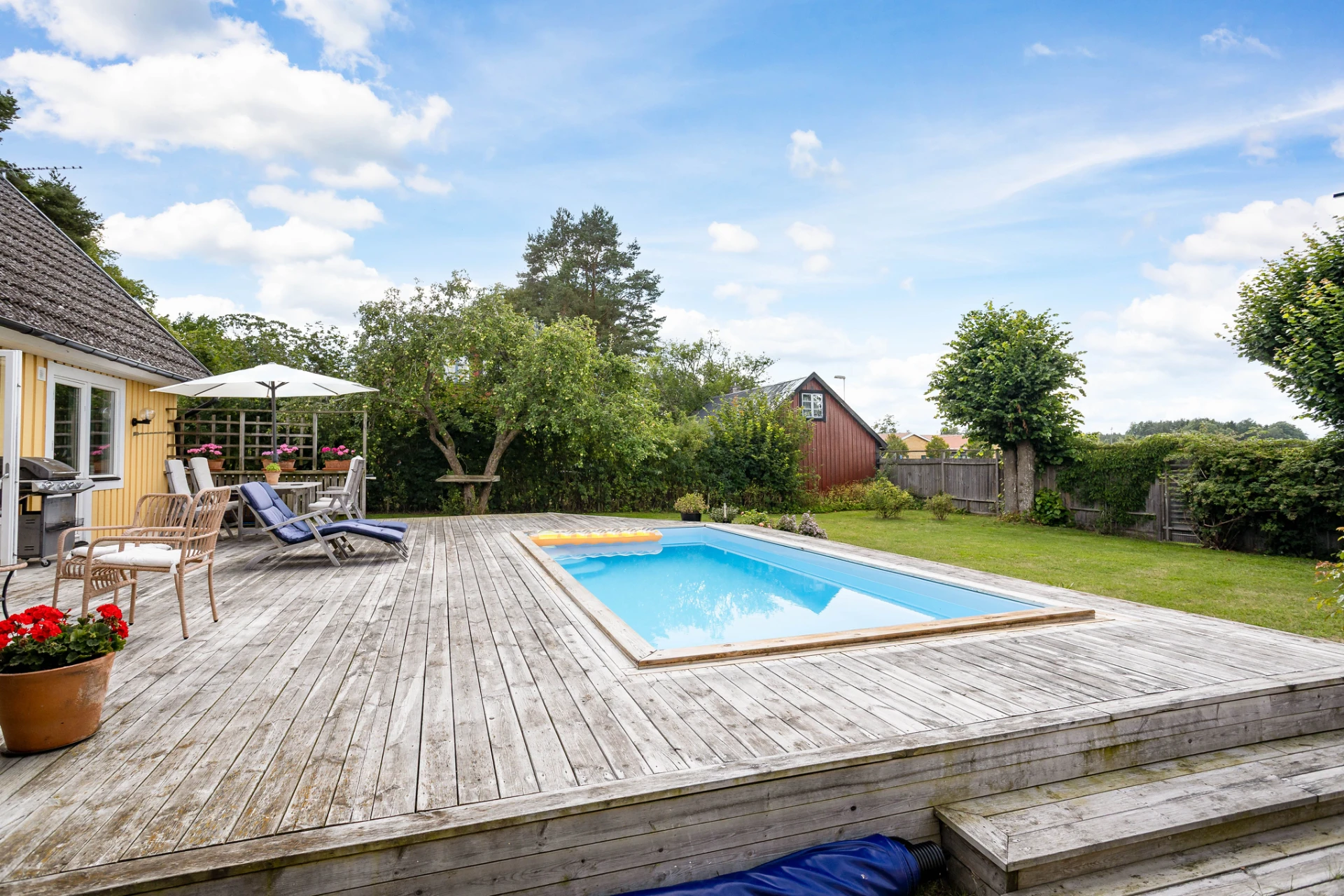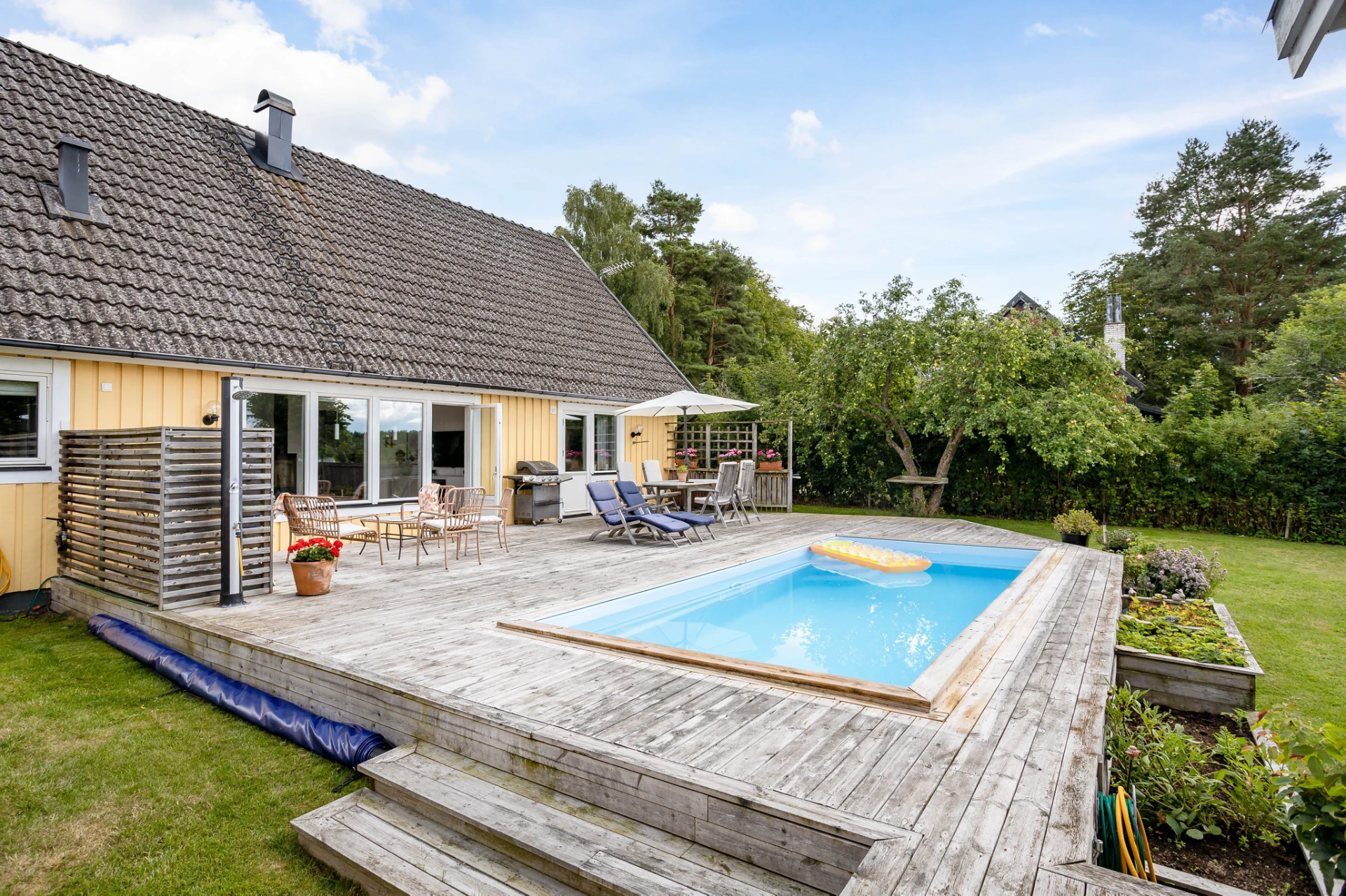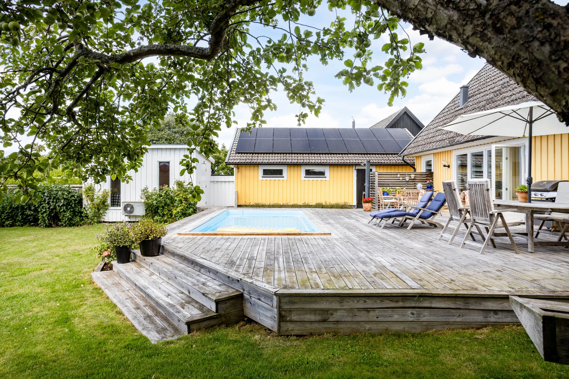 Ljust och trivsamt vardagsrum med hög mysfaktor i värmande kamin. Stort fönsterparti ger ett fint ljusinsläpp och bjuder på vacker vy mot poolområdet och fälten i väster. Altandörren suddar ut gränsen mellan ute och inne.
