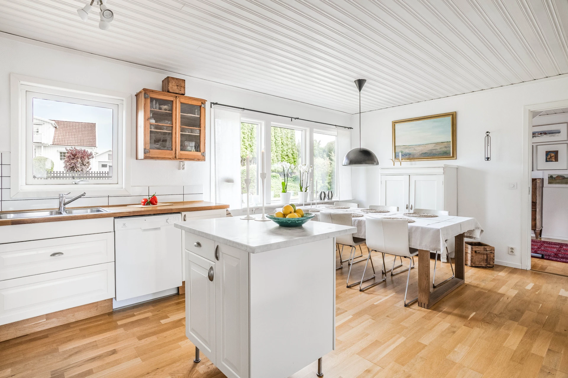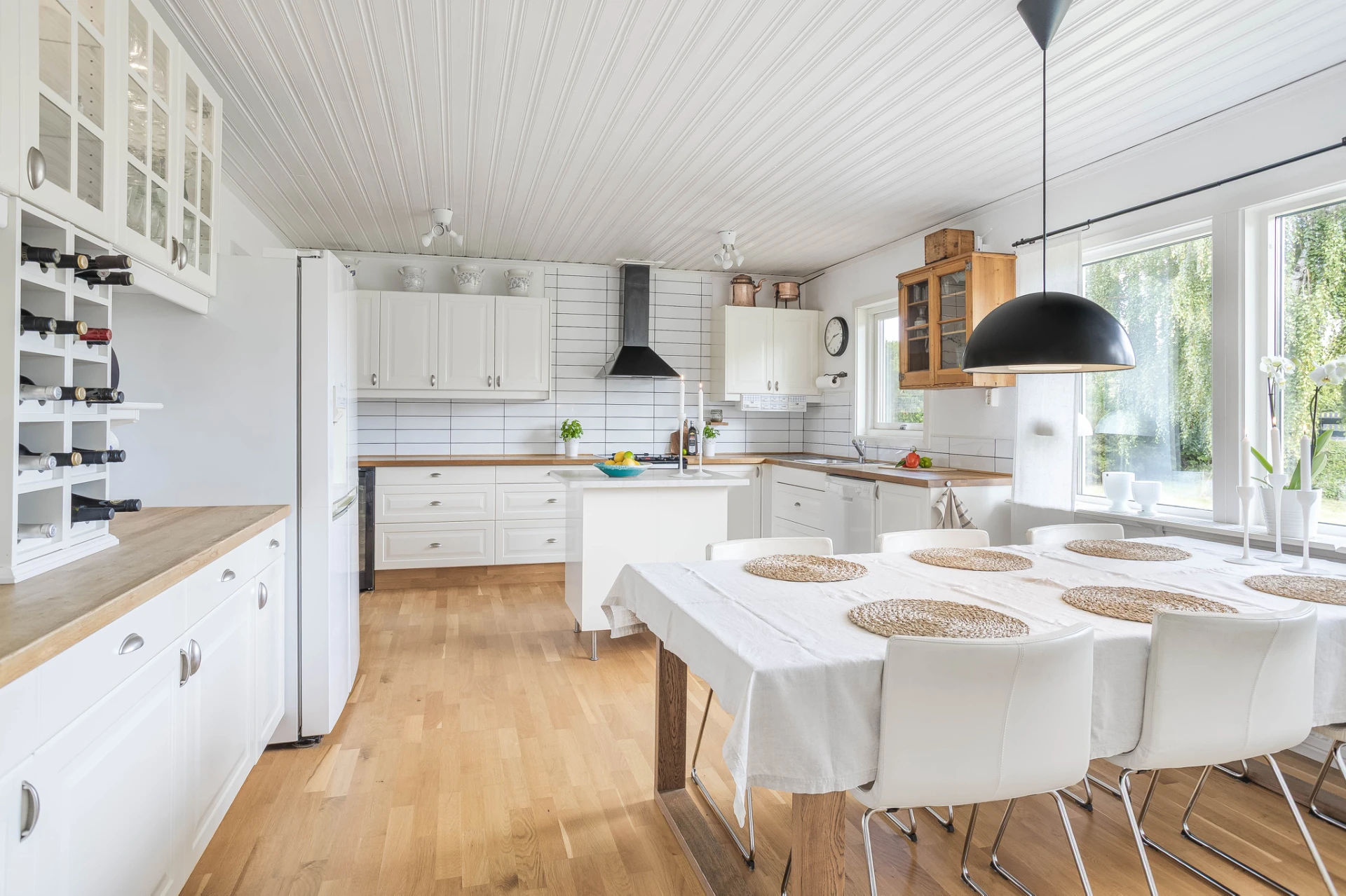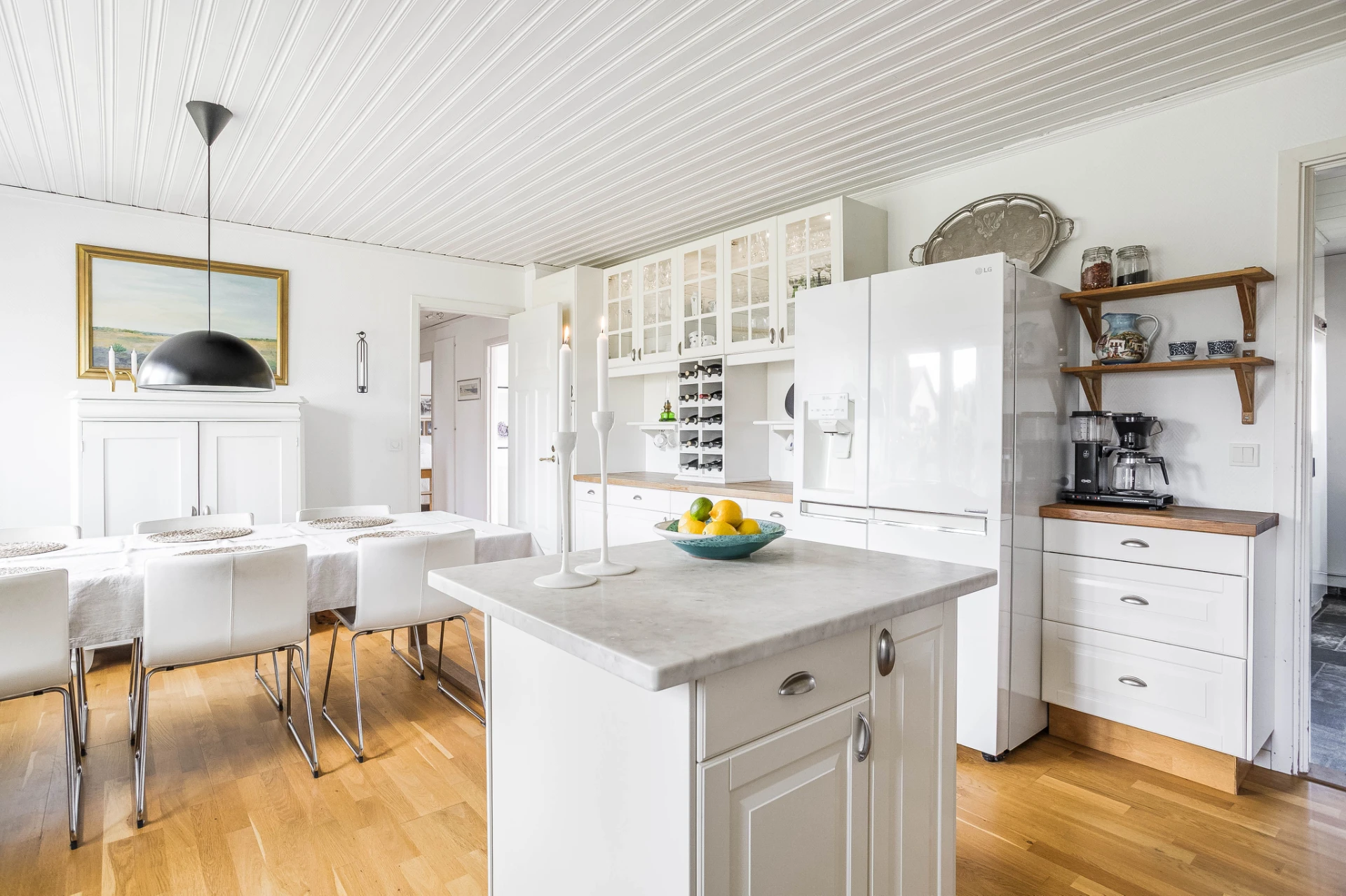 Rejält kök i lantlig stil med suveräna ytor för matlagning och generösa förvaringsmöjligheter. Härligt ljusinsläpp från flera fönster och utrymme för stort middagsbord. Utrustningen i köket består av kyl/frys, diskmaskin, spis, fläkt och vinkyl.