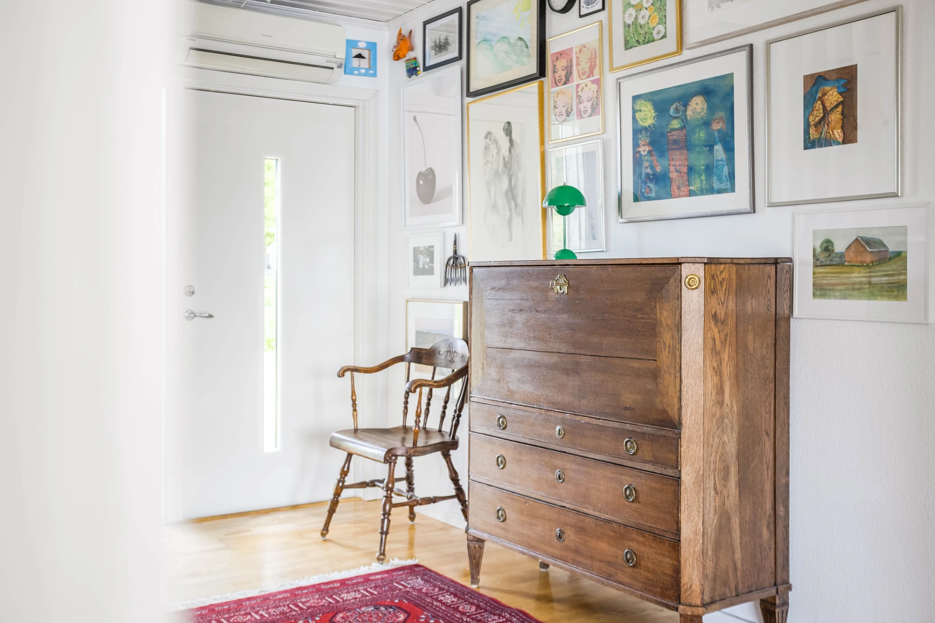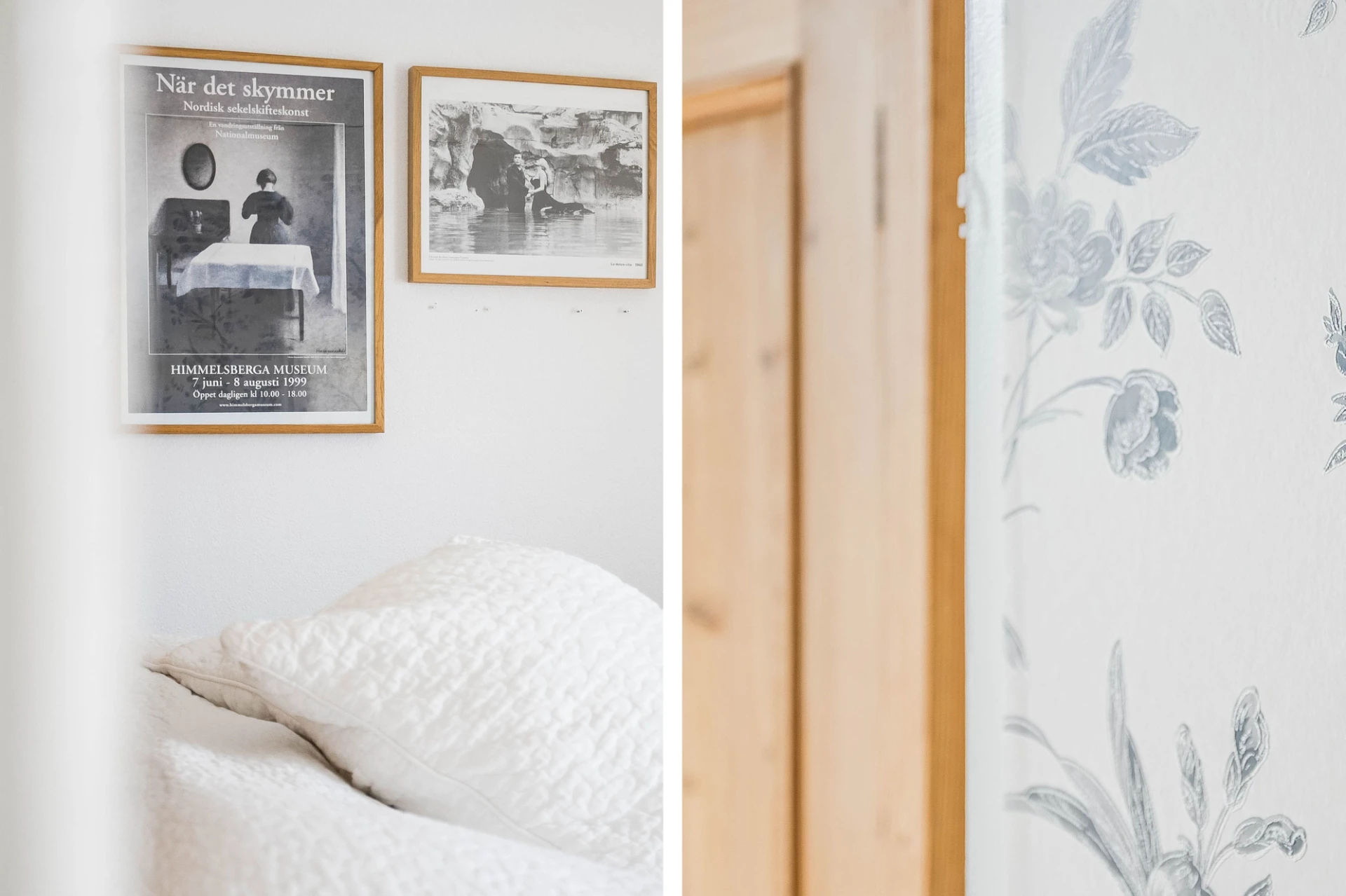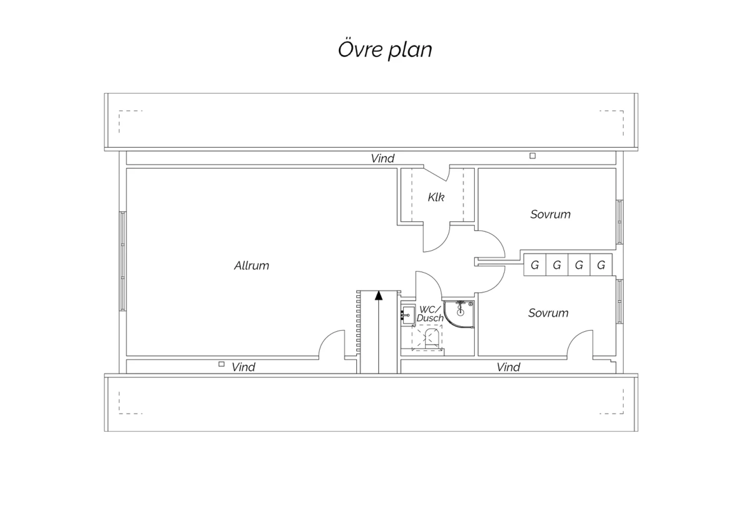 När man kommer uppför trappan kommer man till en öppen hall med en praktisk klädkammare. Även på övre plan ligger enhetligt ett parkettgolv.