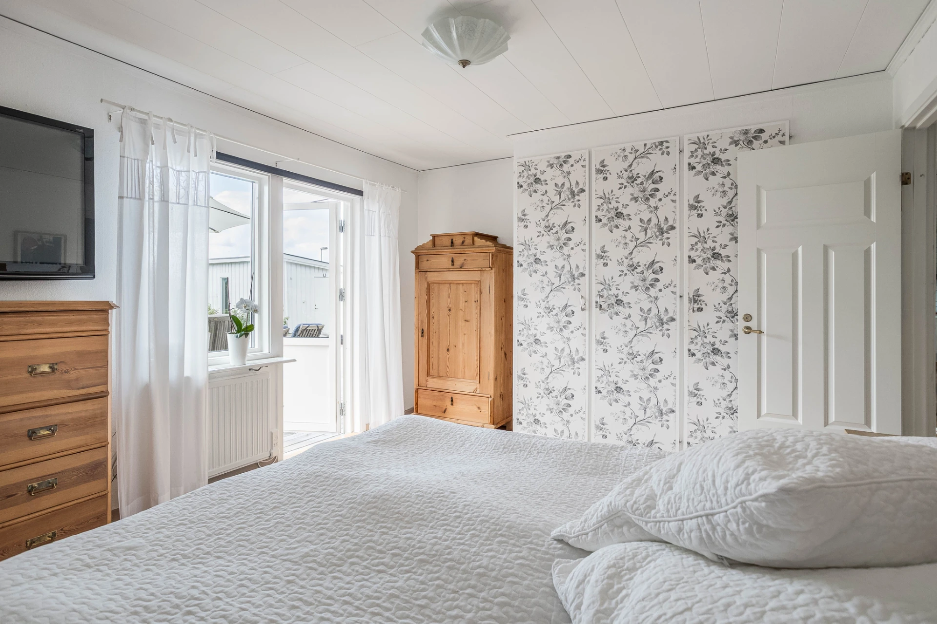 Rymligt sovrum med fyra garderober och fönster åt gaveln.