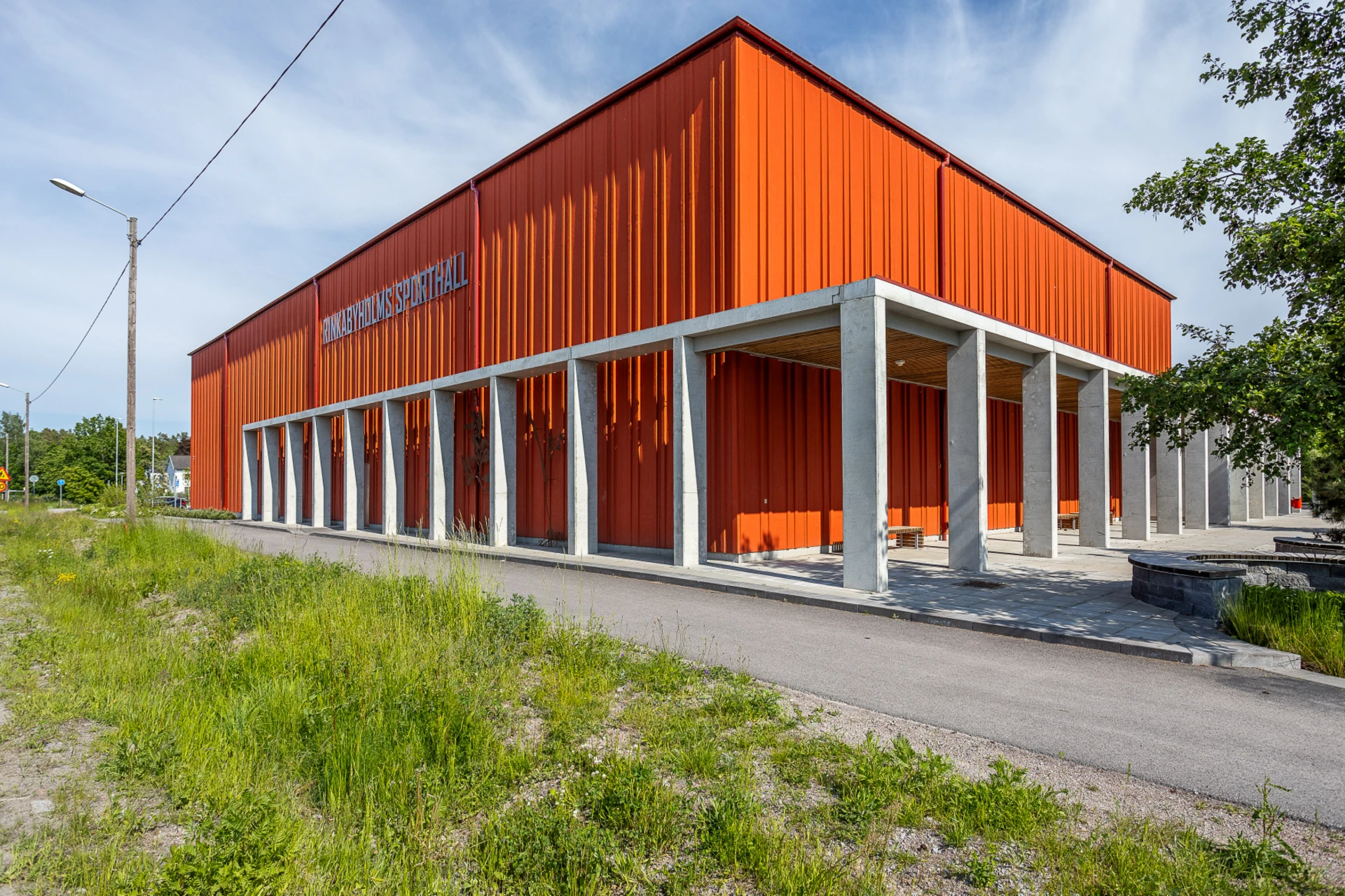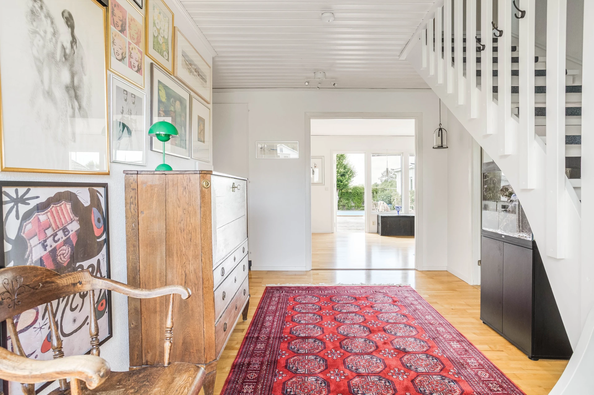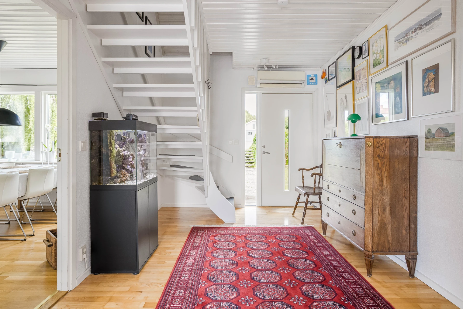 Inbjudande och öppen hall med parkettgolv som enhetligt löper vidare i entréplanet. Hallen är möblerbar och här finner vi trappan upp till övre plan.