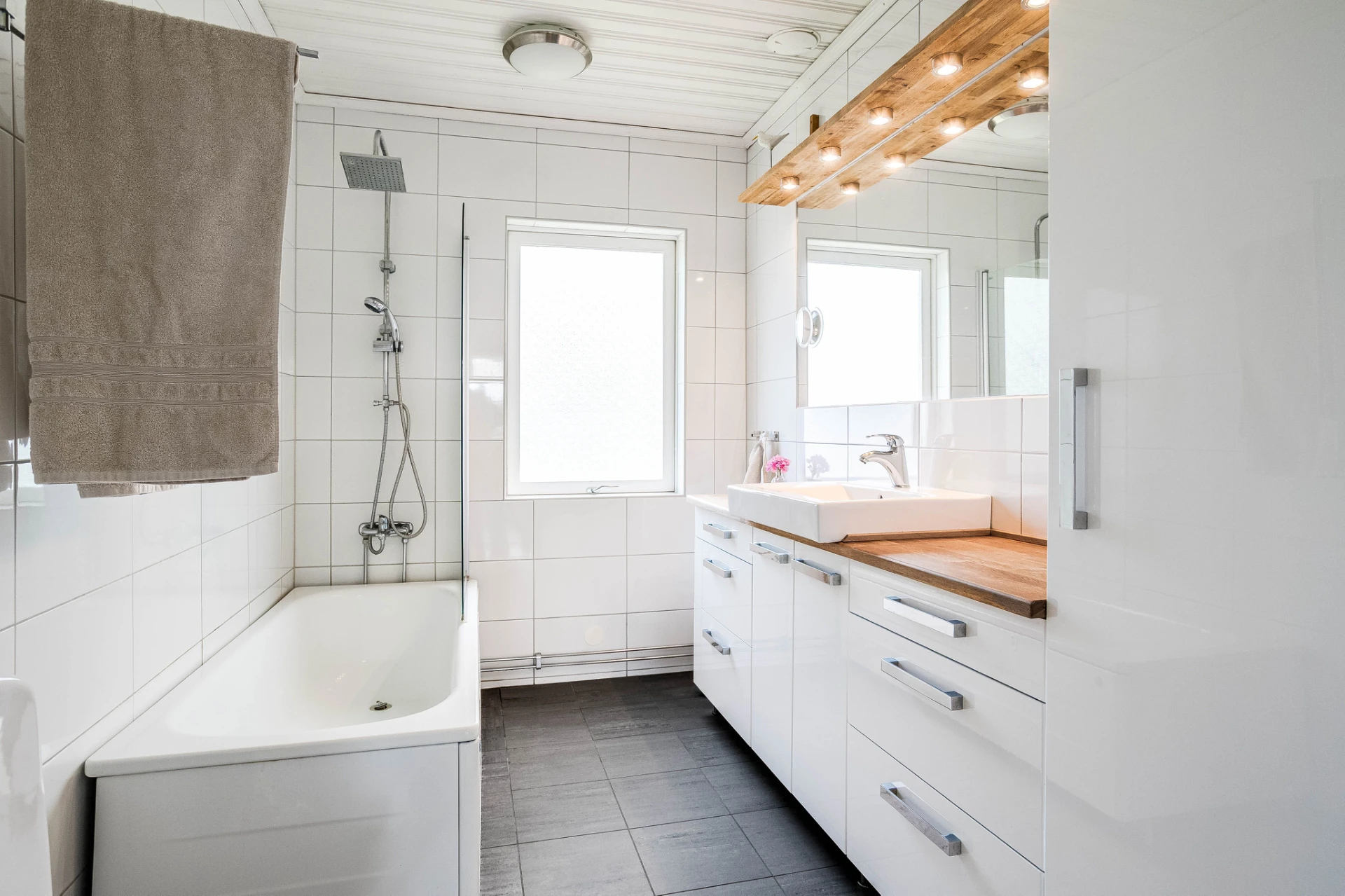 Stilrent, helkaklat badrum med golvvärme, fönster, badkar, wc och handfat med tillhörande underskåp och högskåp.