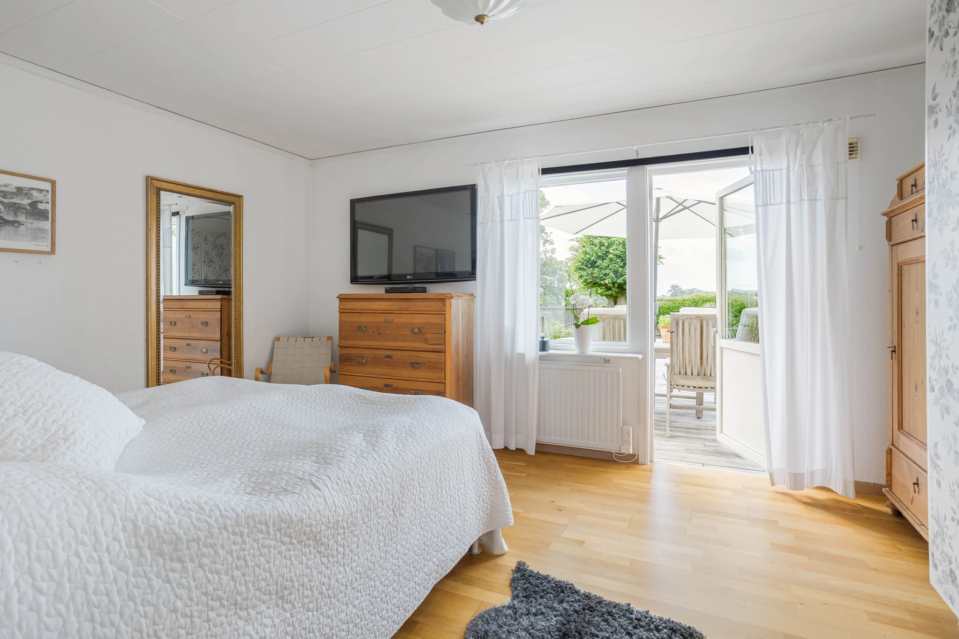 Tilltaget föräldrasovrum med fönster och altandörr mot pooldäcket. En trevlig vy att vakna till! Här finns klädförvaring i tre garderober och gott om plats för fler eller byråer.