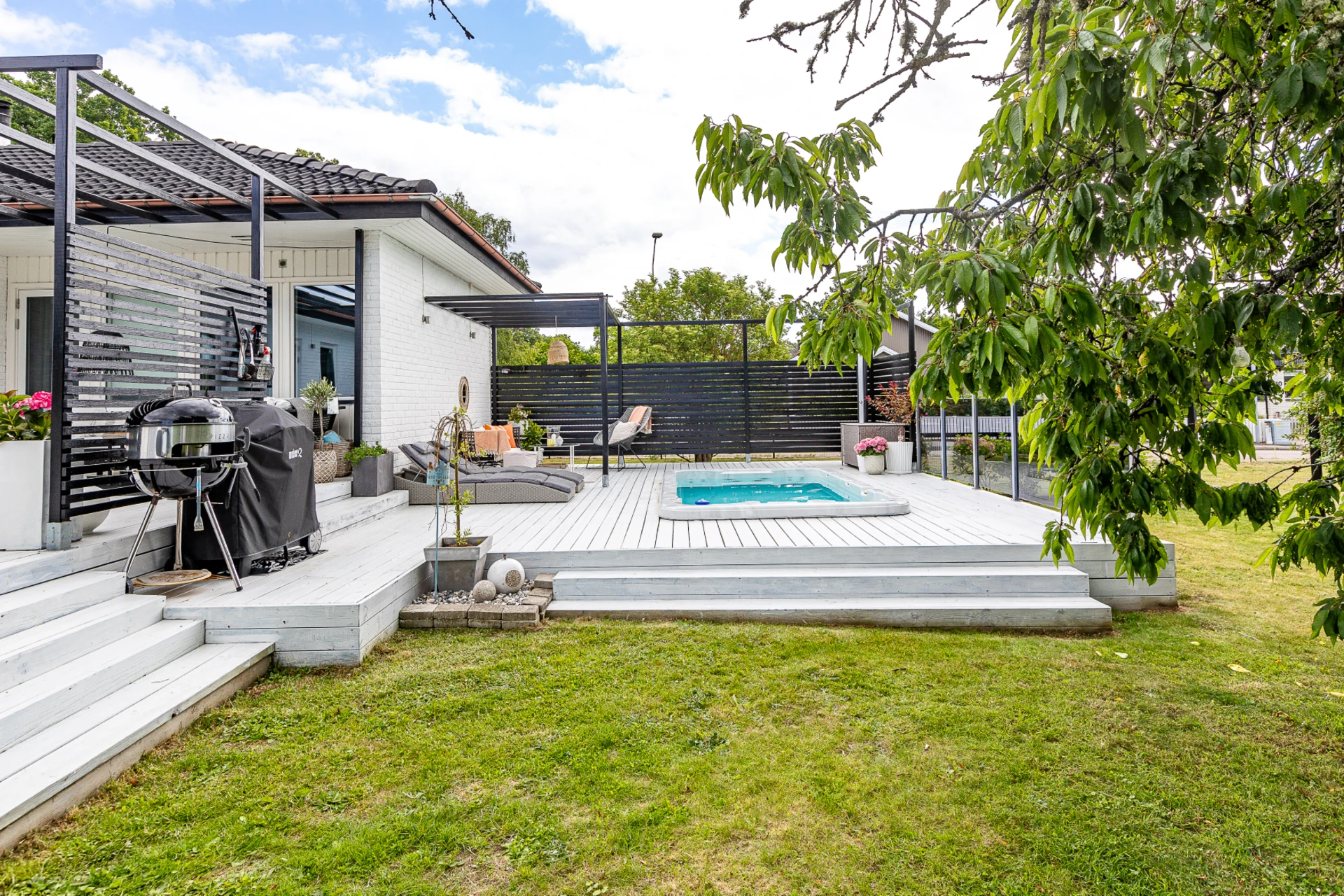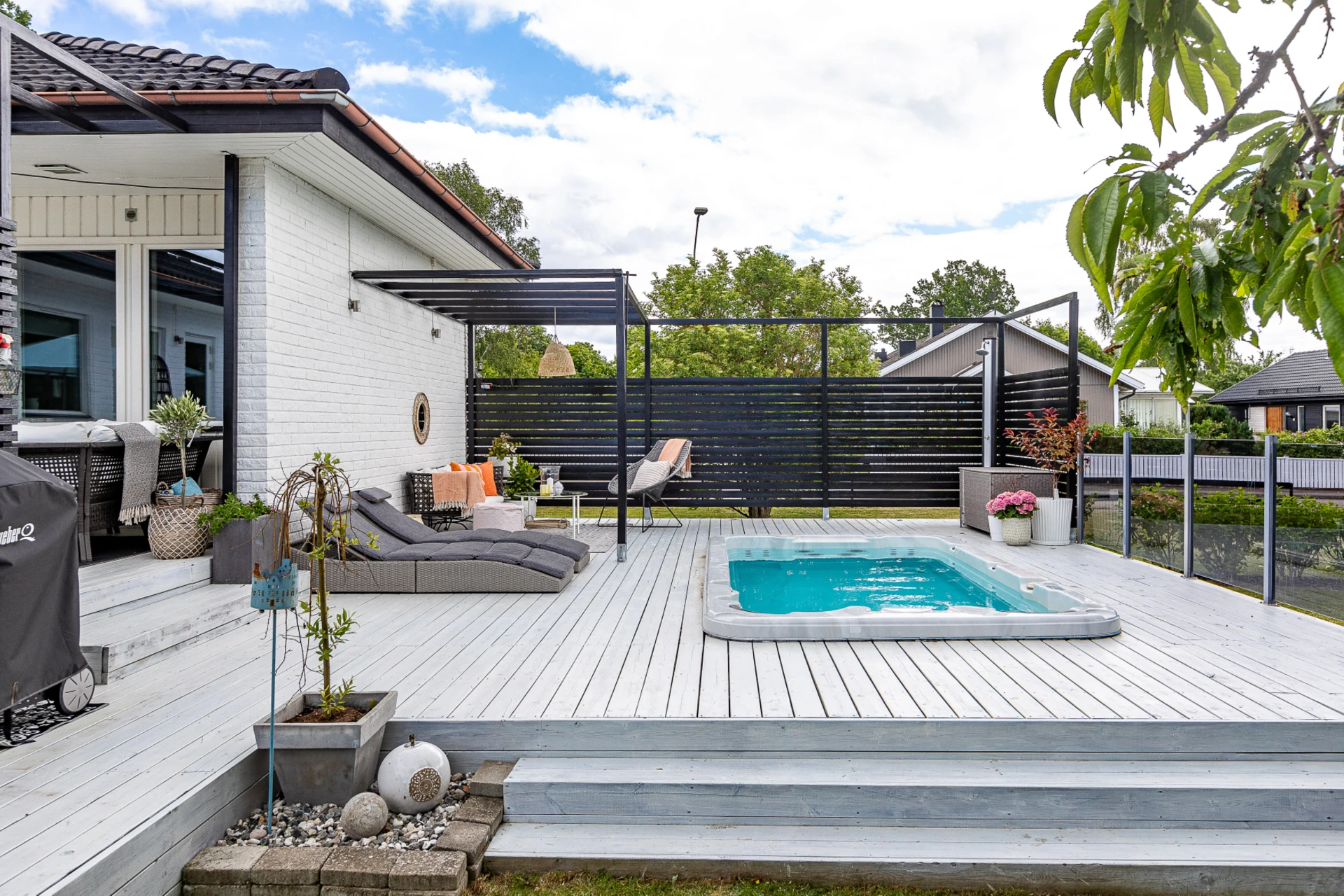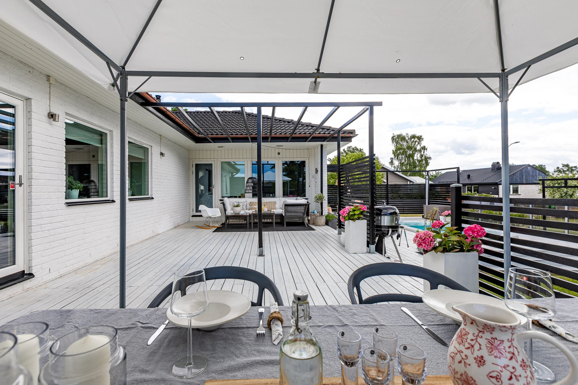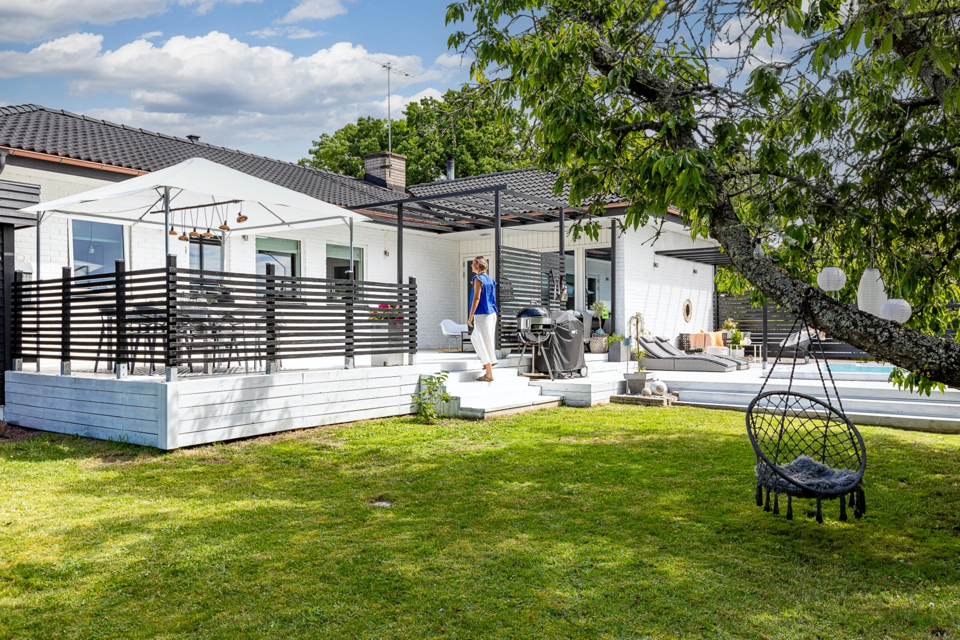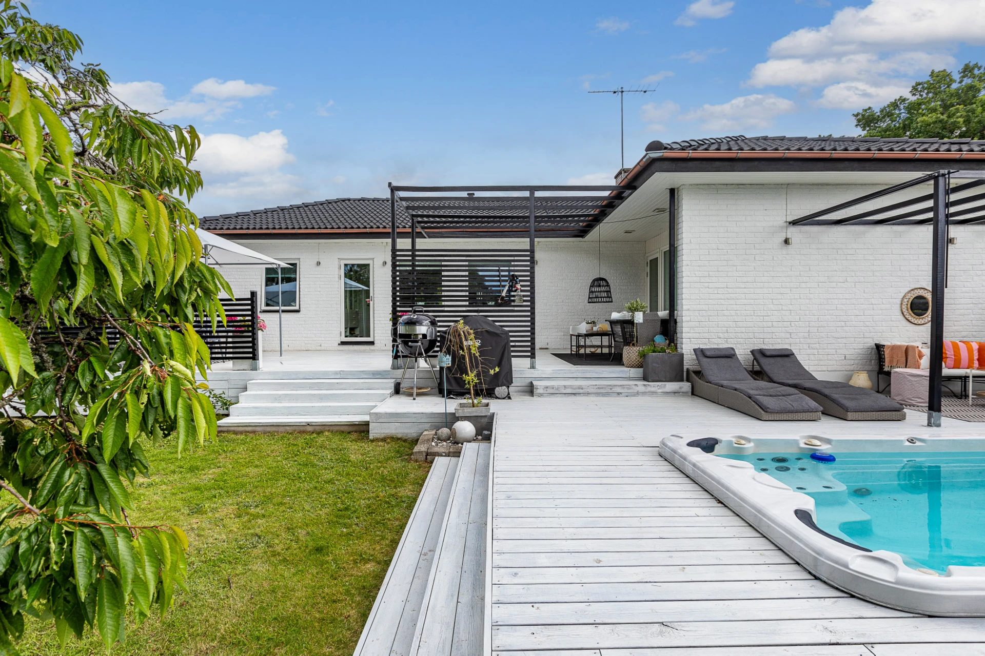 Villan har en mycket välplanerad yta och stoltserar med härliga sociala utrymmen både inne och ute. Dom fyra sovrummen samt den användbara källare gör att huset passar bra för stora familjer eller dig med önskemål om extra rum för gäster eller egna hobbys.
