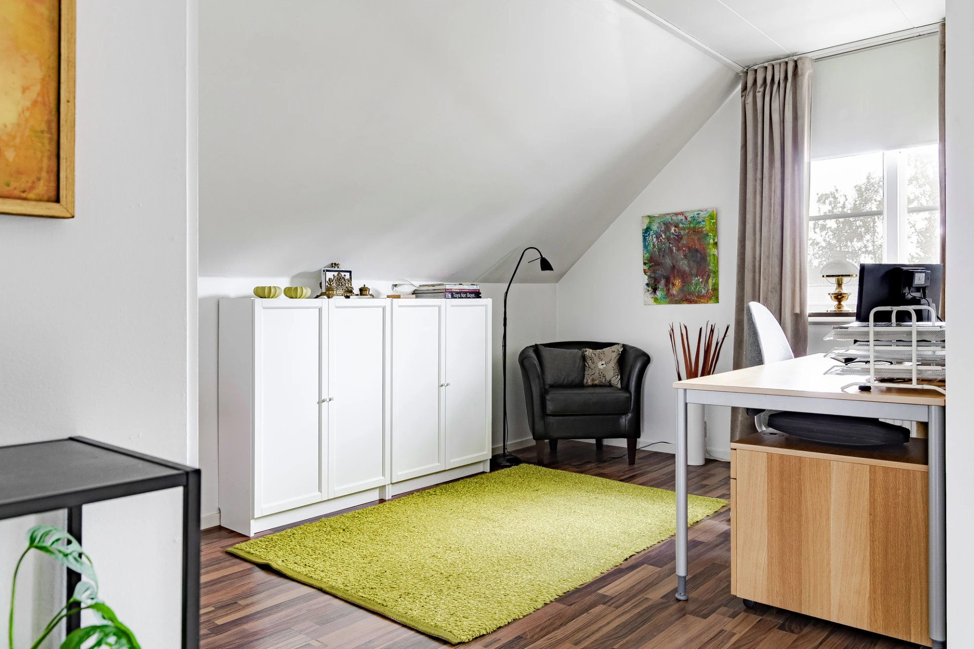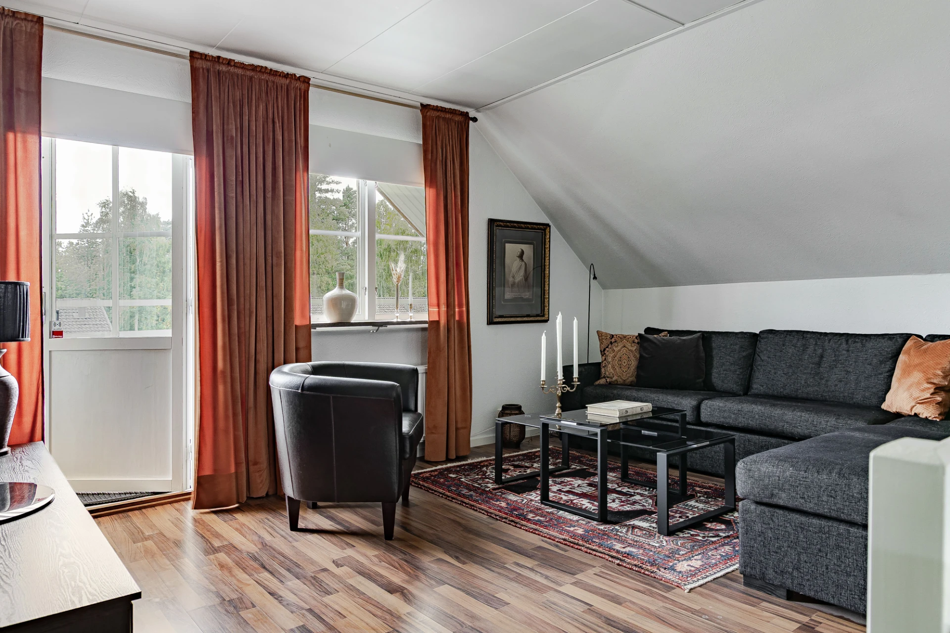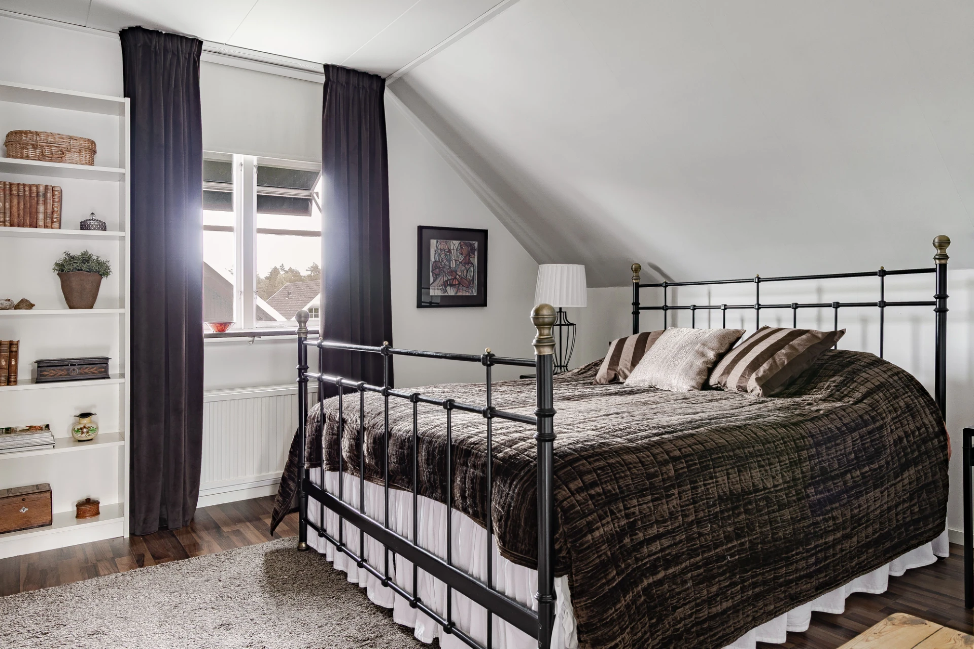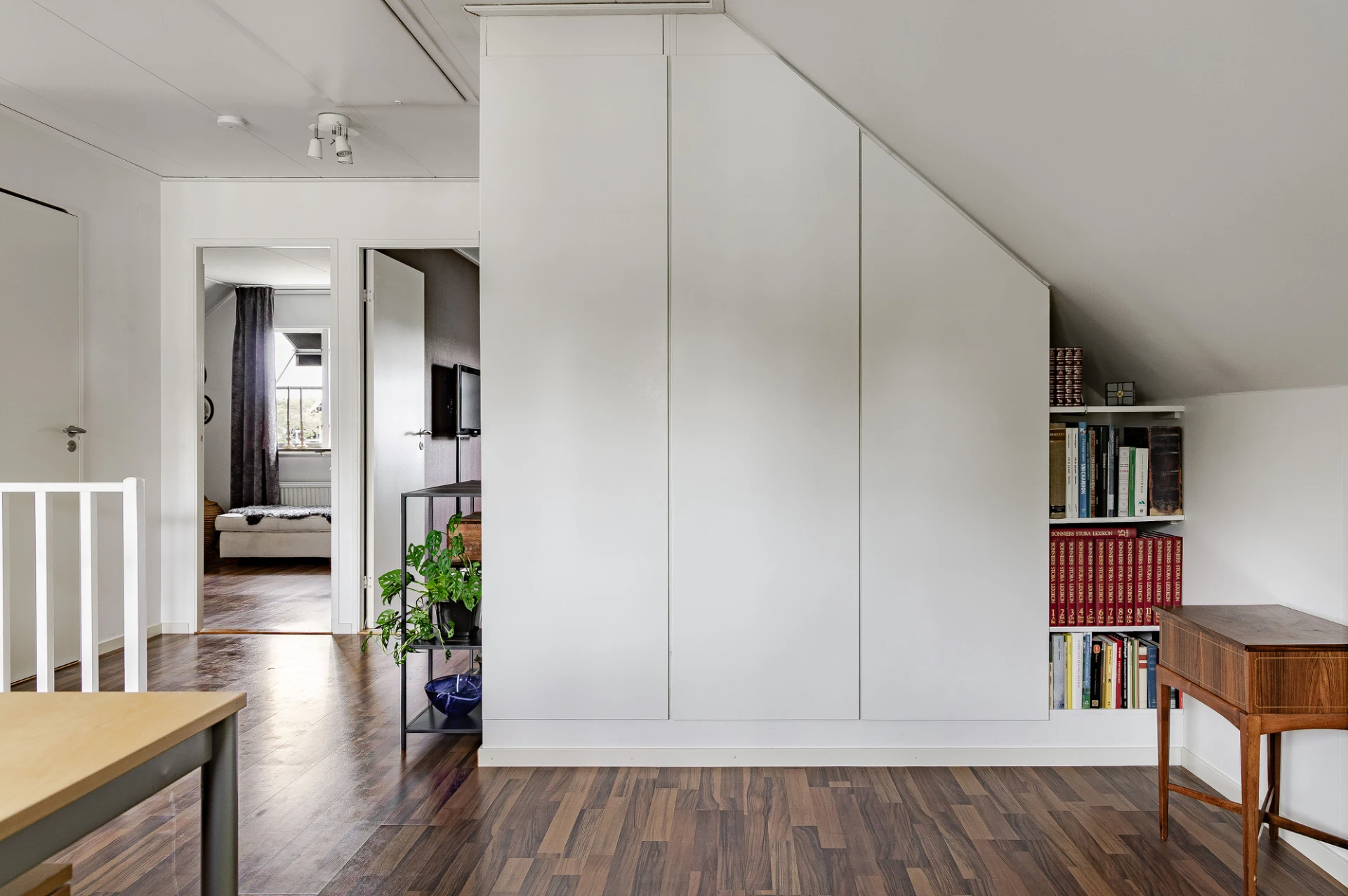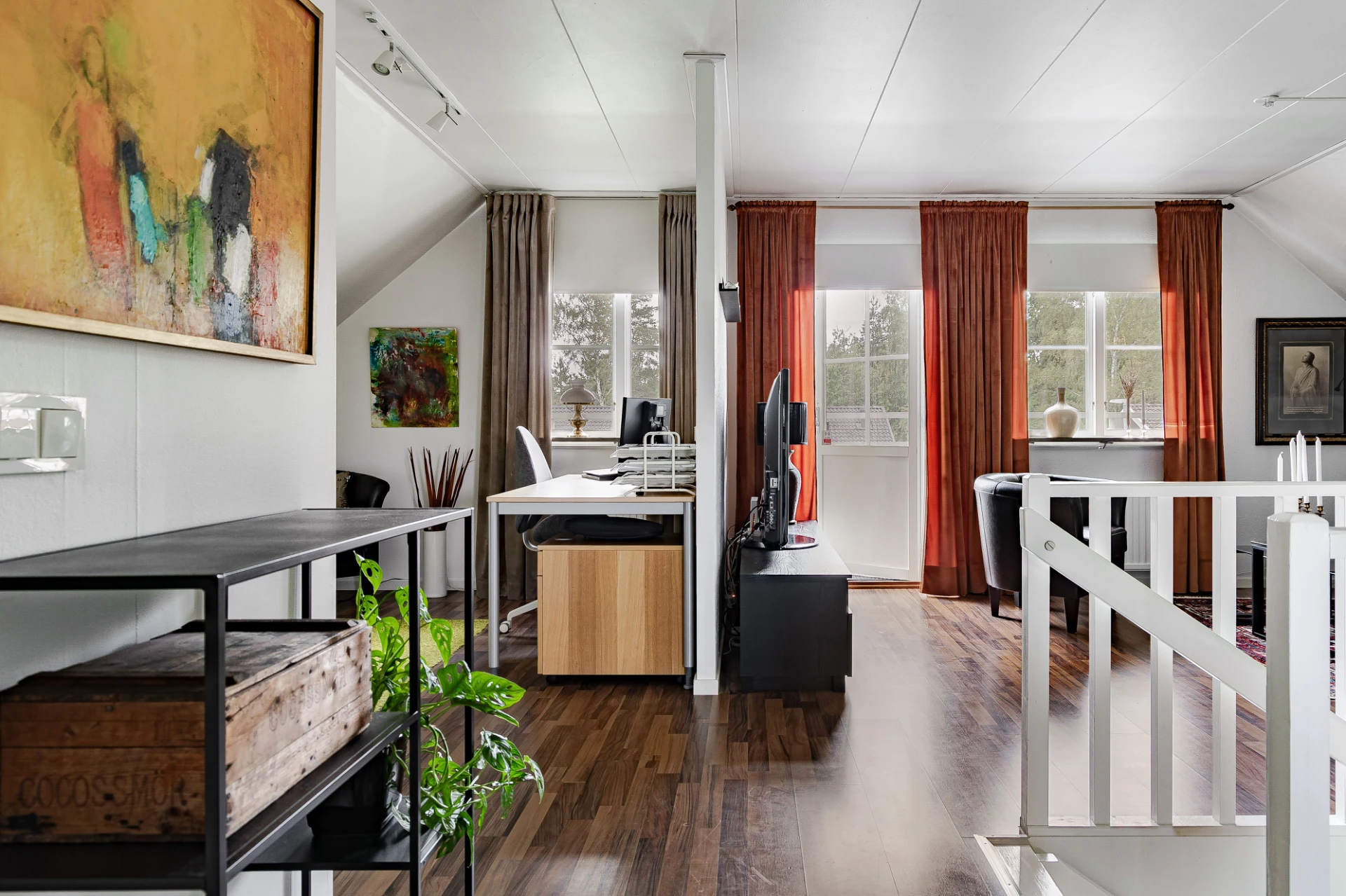 På övre plan finns ett andra sällskapsrum med plats för avskilt TV-mys i soffgruppen. Via altandörren nås en rymlig balkong med utsikt över trädgårdens framsida. I Huset andra badrum har dusch, WC och handfat. På övre plan finns två sovrum, samt ett tredje rum som öppnats upp mot allrummet. Välj själva om ni vill återställa detta till ett extra sovrum.