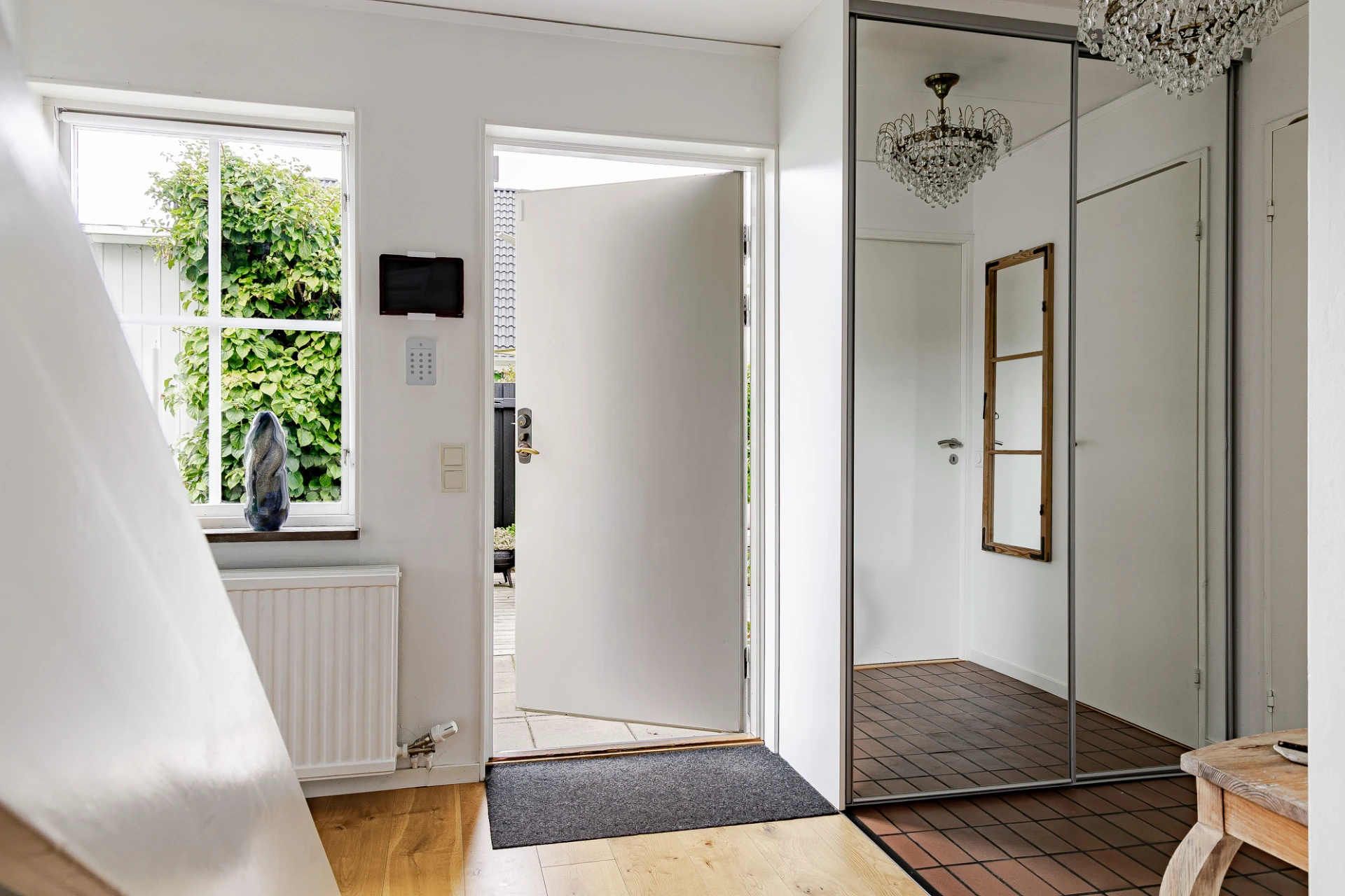 Hallen ger bra plats till ytterkläderna i det intilliggande kapprummet. En trappa leder till övre plan. Badrummet är kaklat och har barkar, dubbla handfat och WC. Intill hallen finns tvättstuga med groventré. Här finns tvättmaskin, torktumlare, torkskåp, tvättho sam husets värmekälla som ger lättskött och driftsäker uppvärmning via fjärrvärme. Kök och vardagsrum har öppet social planlösning. Här ryms det större sällskapet. Köket är arbetsvänligt och har bra förvaring i flertalet lådor och skåp. Här finns diskmaskin, ugn, spis, fläkt samt stor kyl & frys. Vardagsrummet har en enstavs ekparkett från Kährs. Via vardagsrummet nås uteplats i kvällssolläge. På entréplan finns ett rymligt sovrum. Även detta rum har matchande enstavs ekparkett från Kährs.
