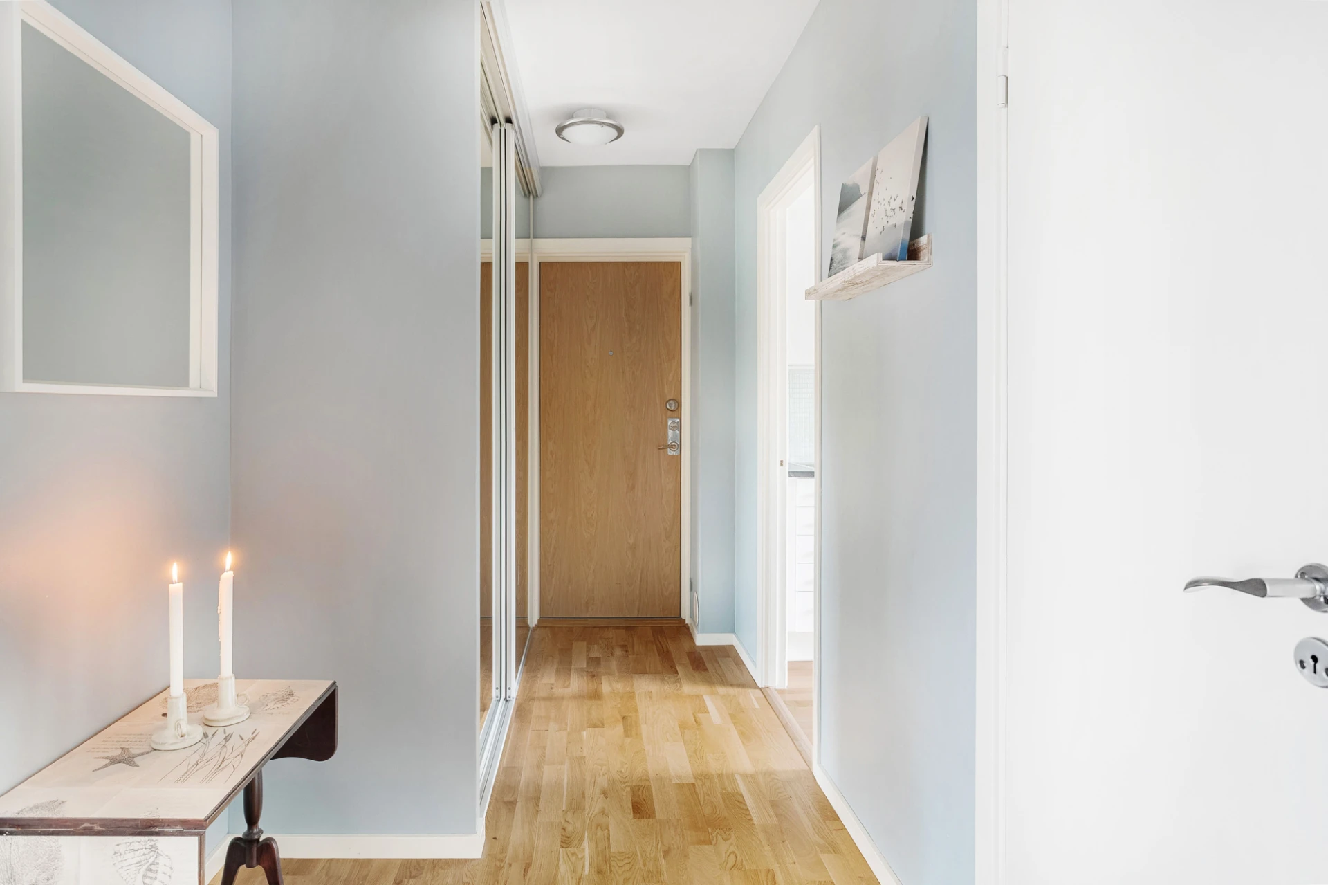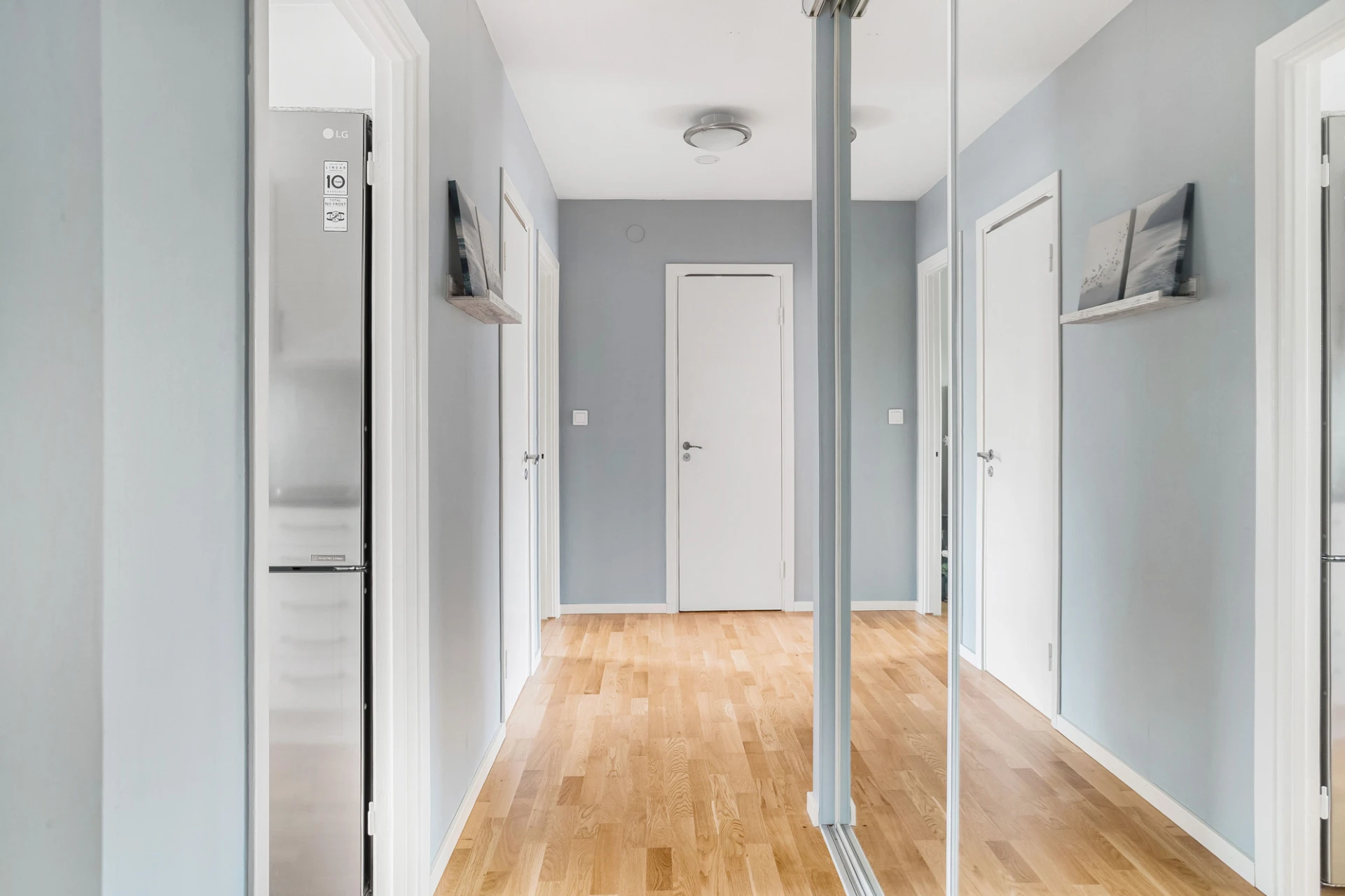 Inbjudande hall med gott om förvaring i praktisk skjutdörrsgarderob med spegeldörrar samt en klädkammare. På golvet ligger ekparkett som enhetligt och smakfullt löper vidare i hela bostaden.