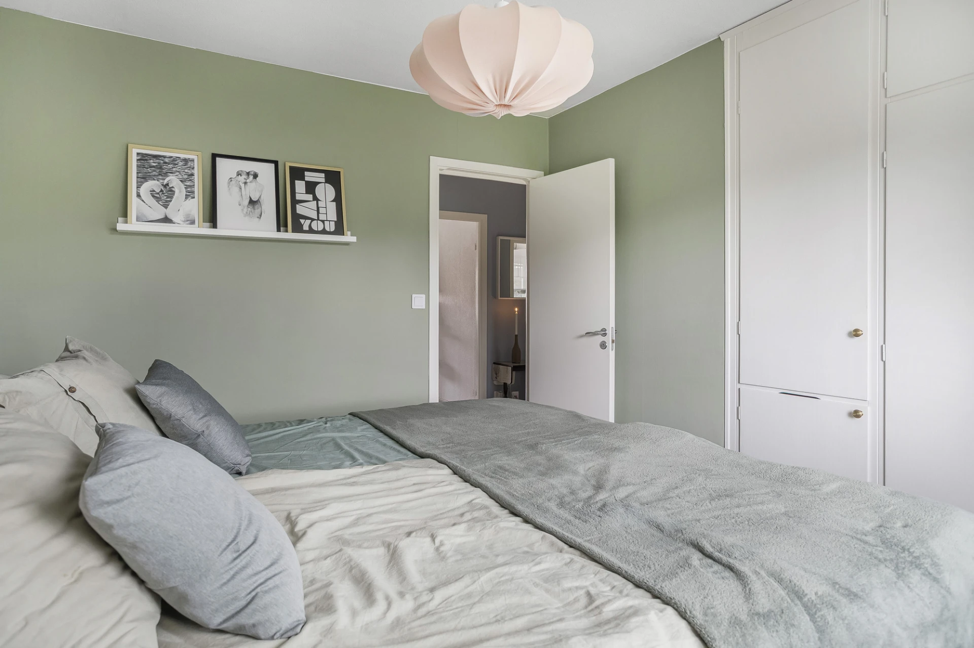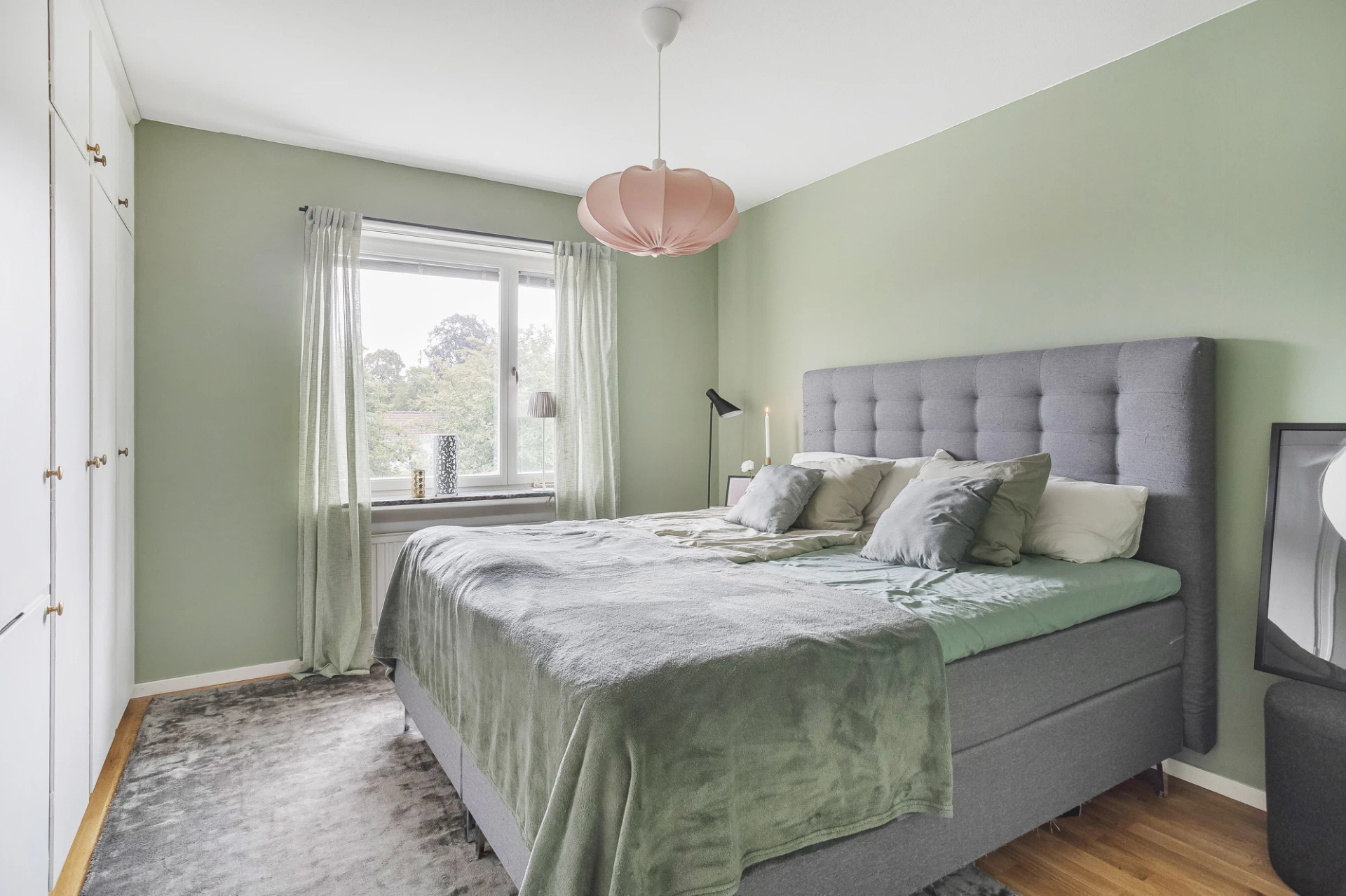 Rymligt sovrum med fönster åt framsidan och generös klädförvaring i fyra garderober med överskåp.