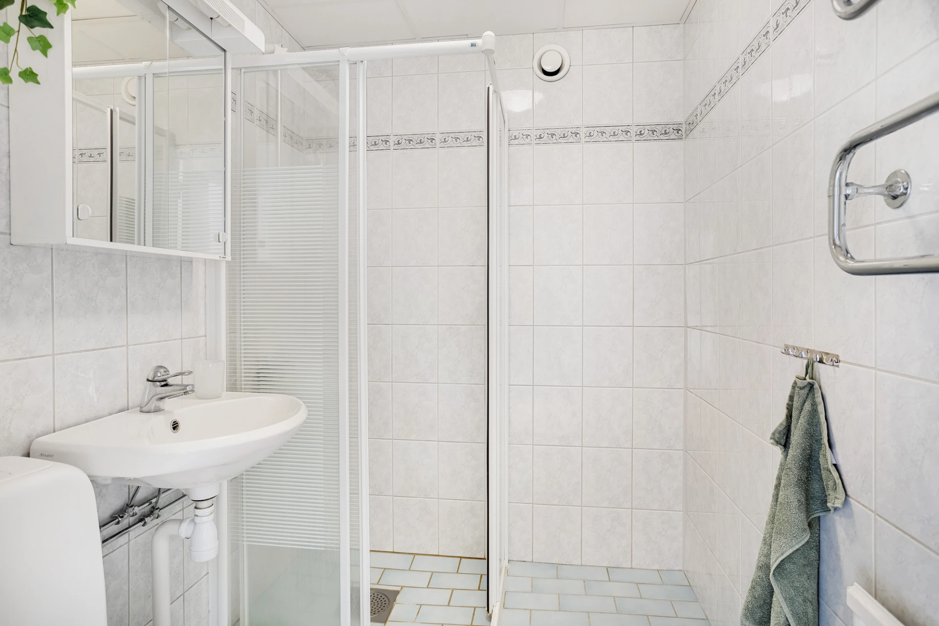 Helkaklat badrum med wc, handfat med kommod, dusch med skjutdörrar samt handdukstork.