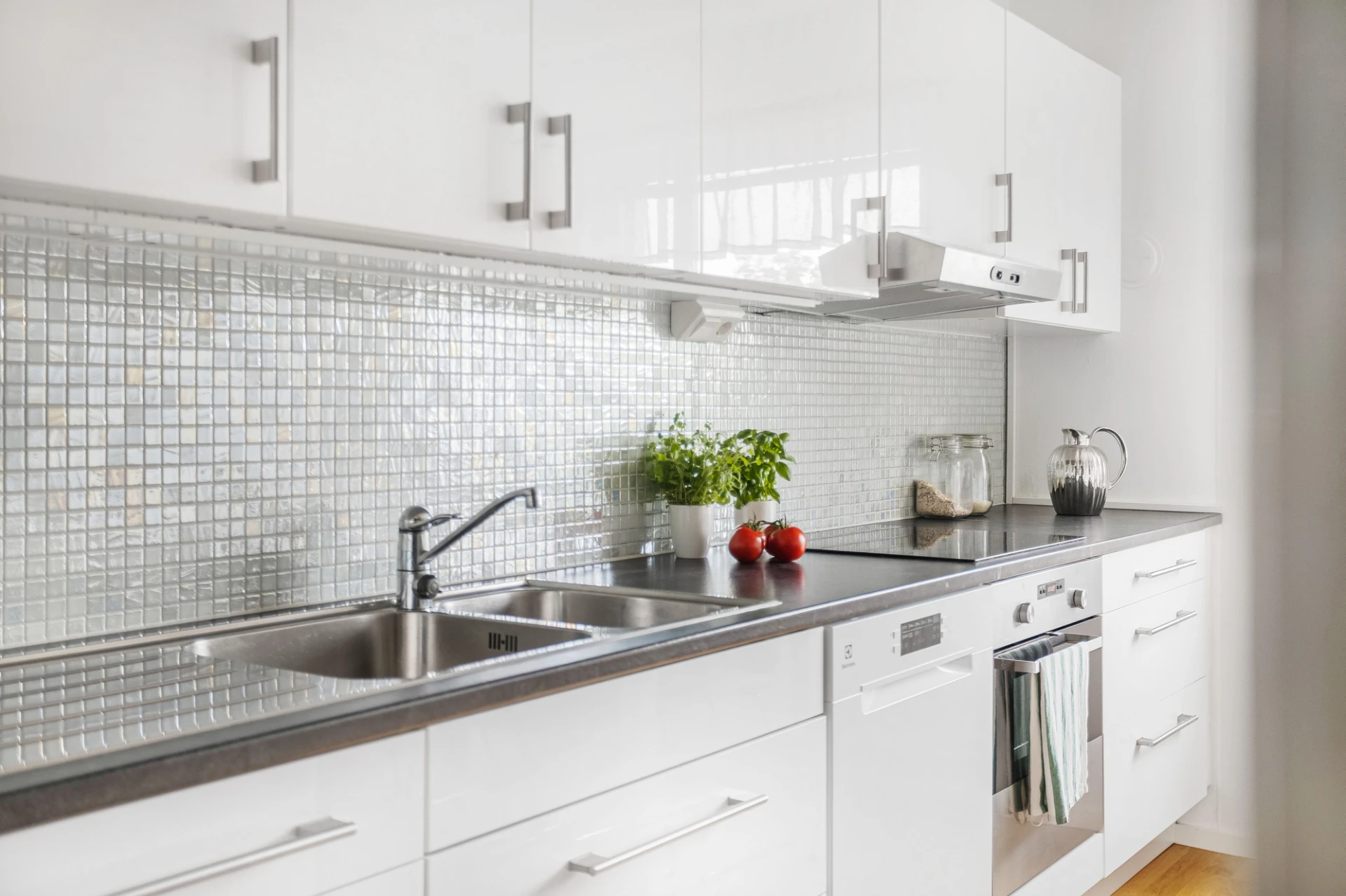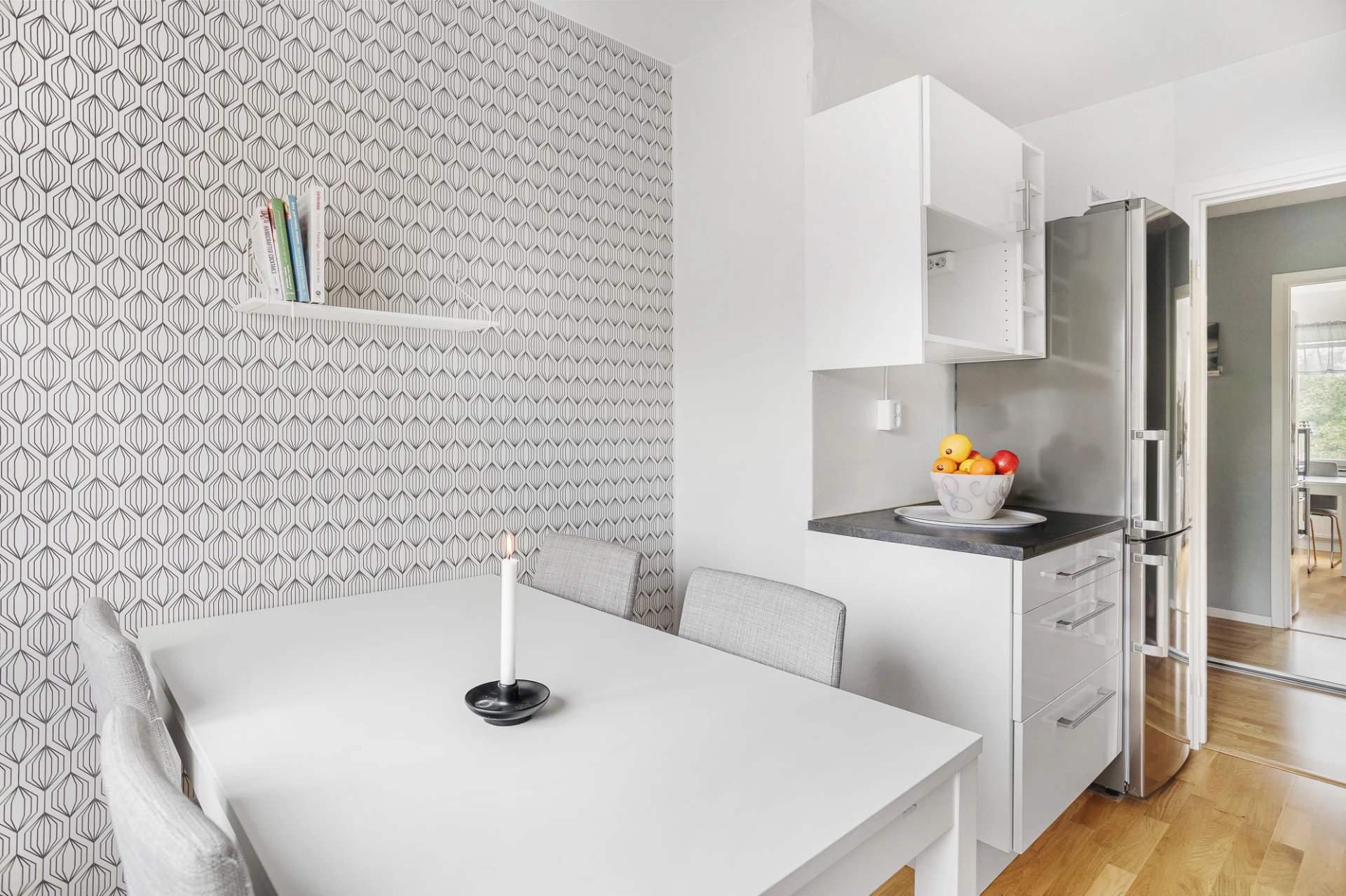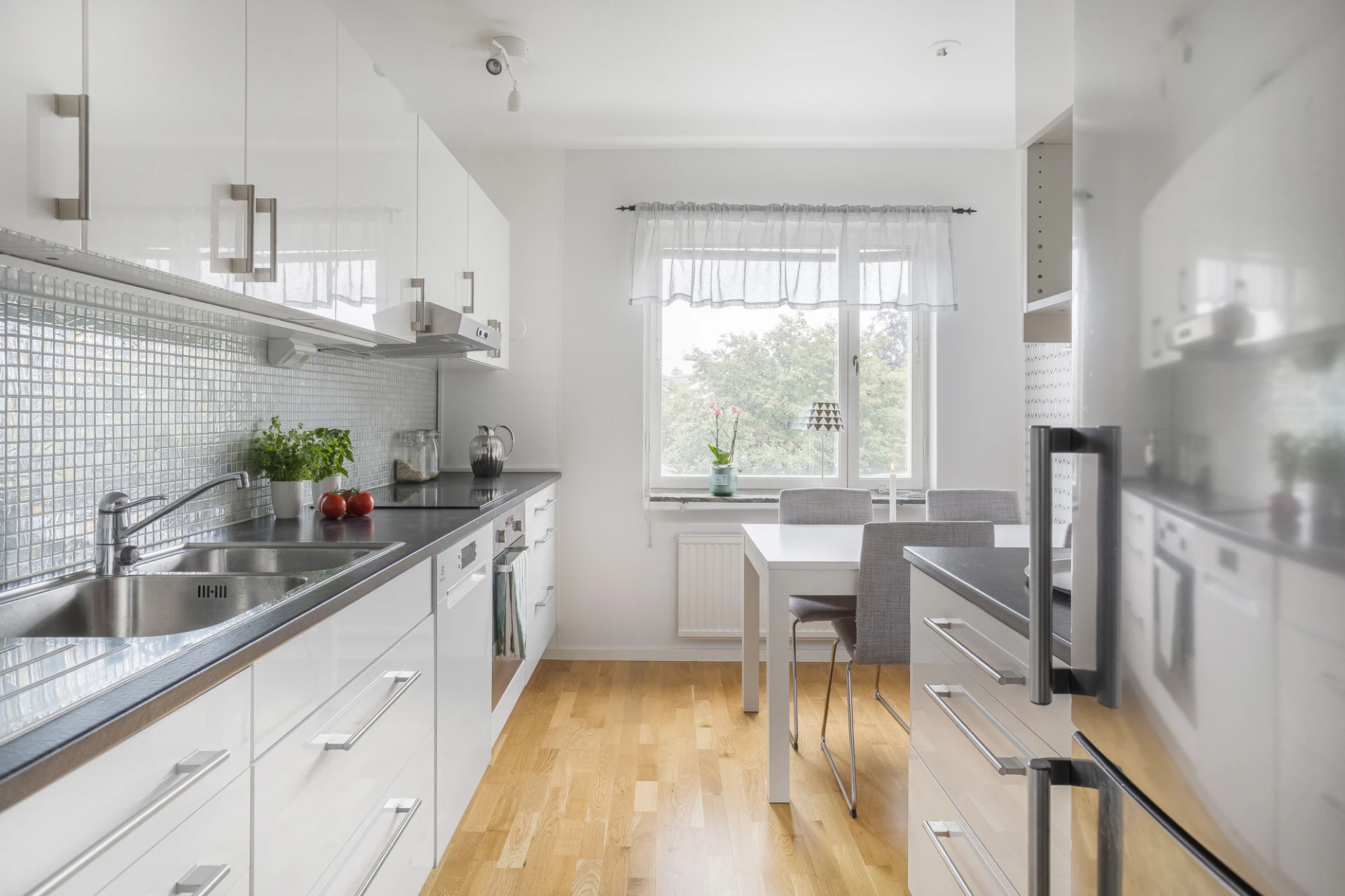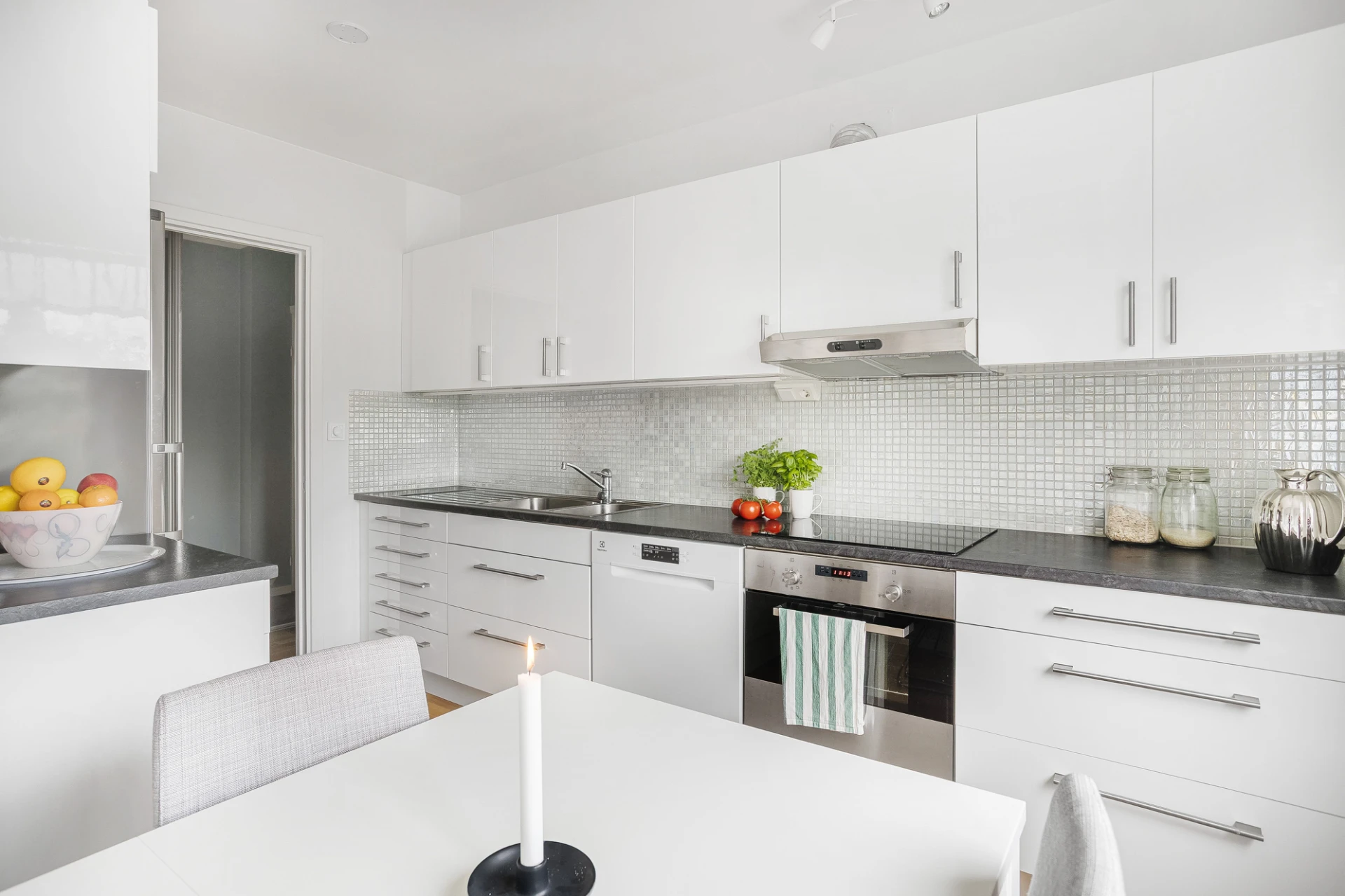 Stilrent renoverat kök med vita skåp, bra förvaring och fina ytor för matlagning. Utrustningen består av kyl/frys, integrerad diskmaskin (-25), inbyggnadsugn, spishäll och fläkt. Vid fönster ut mot framsidan finns utrymme för köksbord.