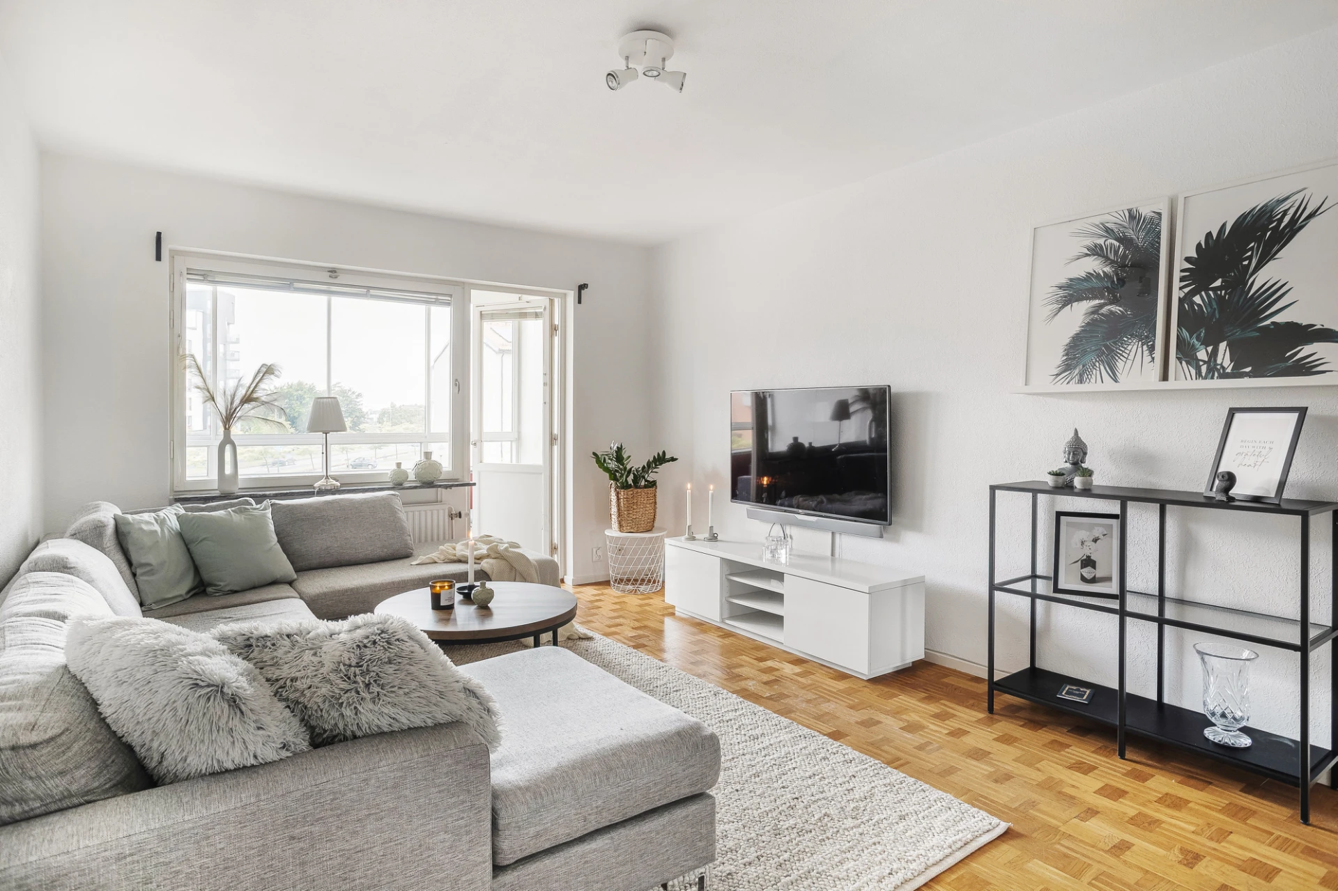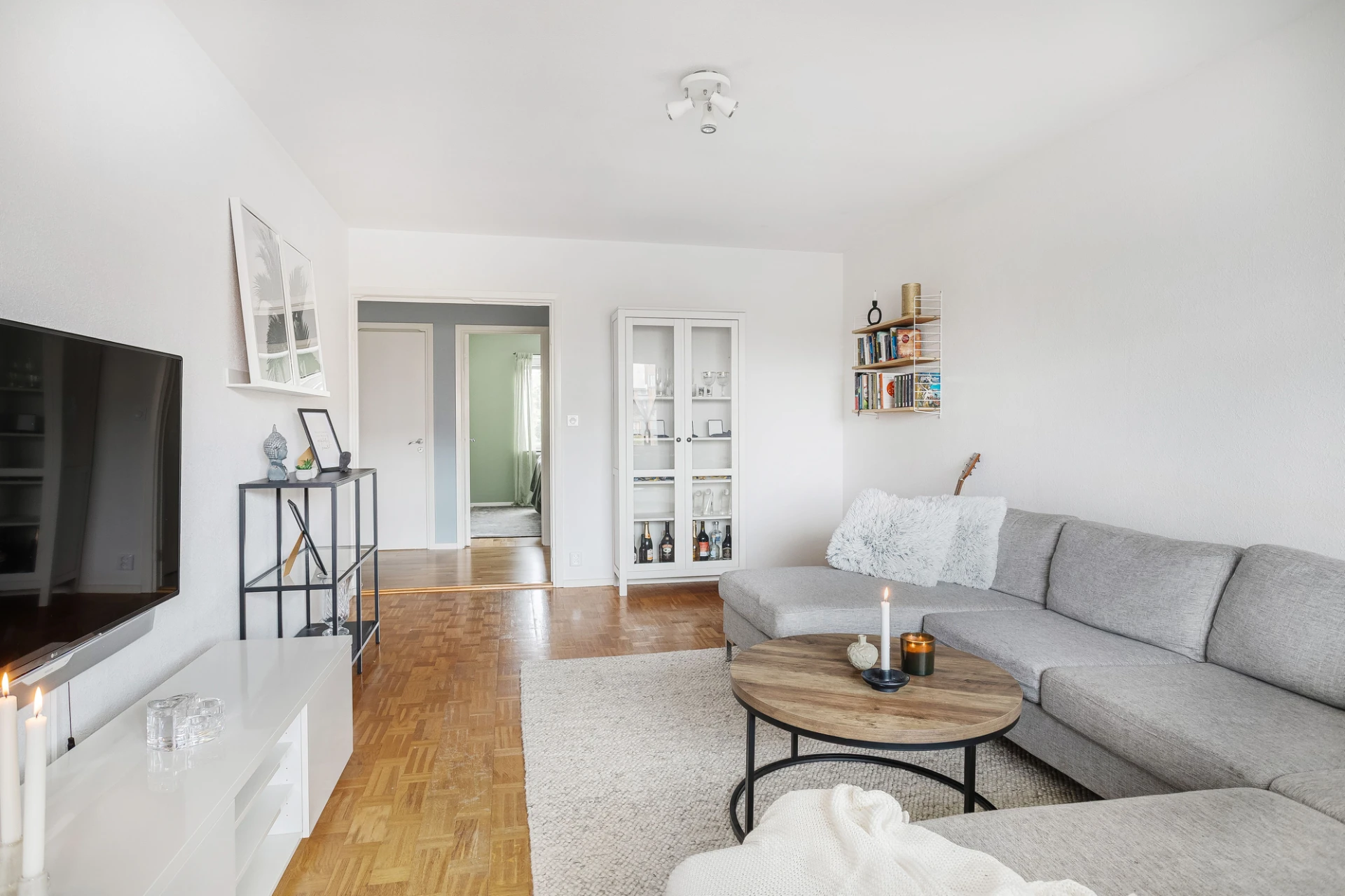 Trivsamt vardagsrum med plats att möblera med såväl tv- och soffmöblemang som middagsbord eller arbetsplats. Vardagsrummet förlängs dessutom av den stora, inglasade balkongen.