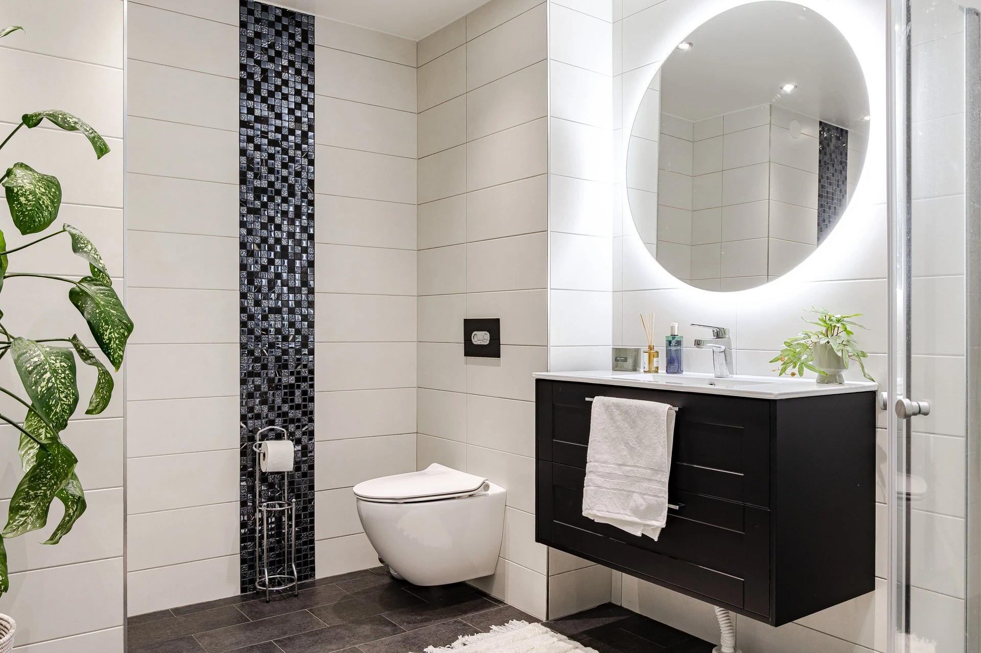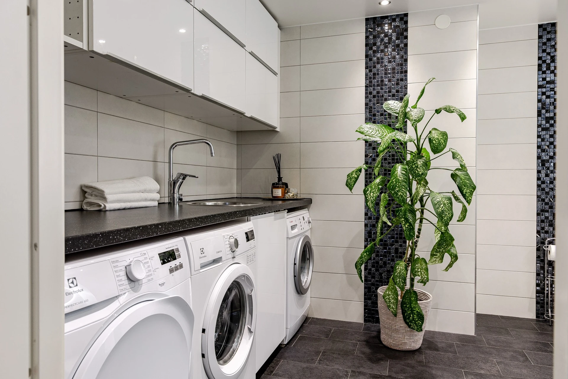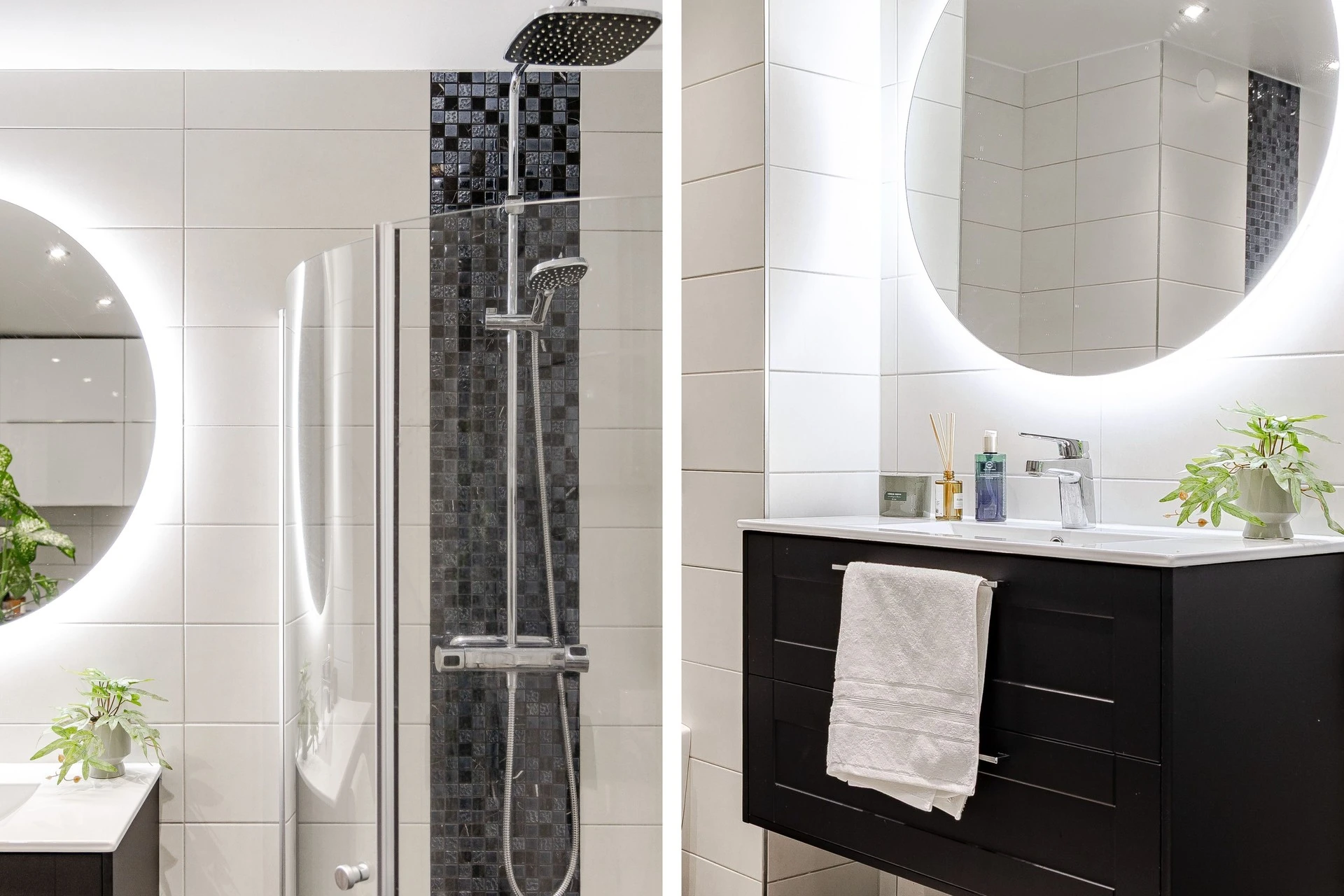 Det stora badrummet har belägenhet intill huvudentrén och är generöst tilltaget. Det gjordes om för ett par år sedan och rymmer en smart tvättavdelning med tvättmaskin och torktumlare med bra bänk för avlastning och vika tvätt tillsammans med bra förvaring. Lösningar som gör vardagen både smidig och funktionell. Dusch, wc och handfat med kommod finns också i det helkaklade badrummet.
