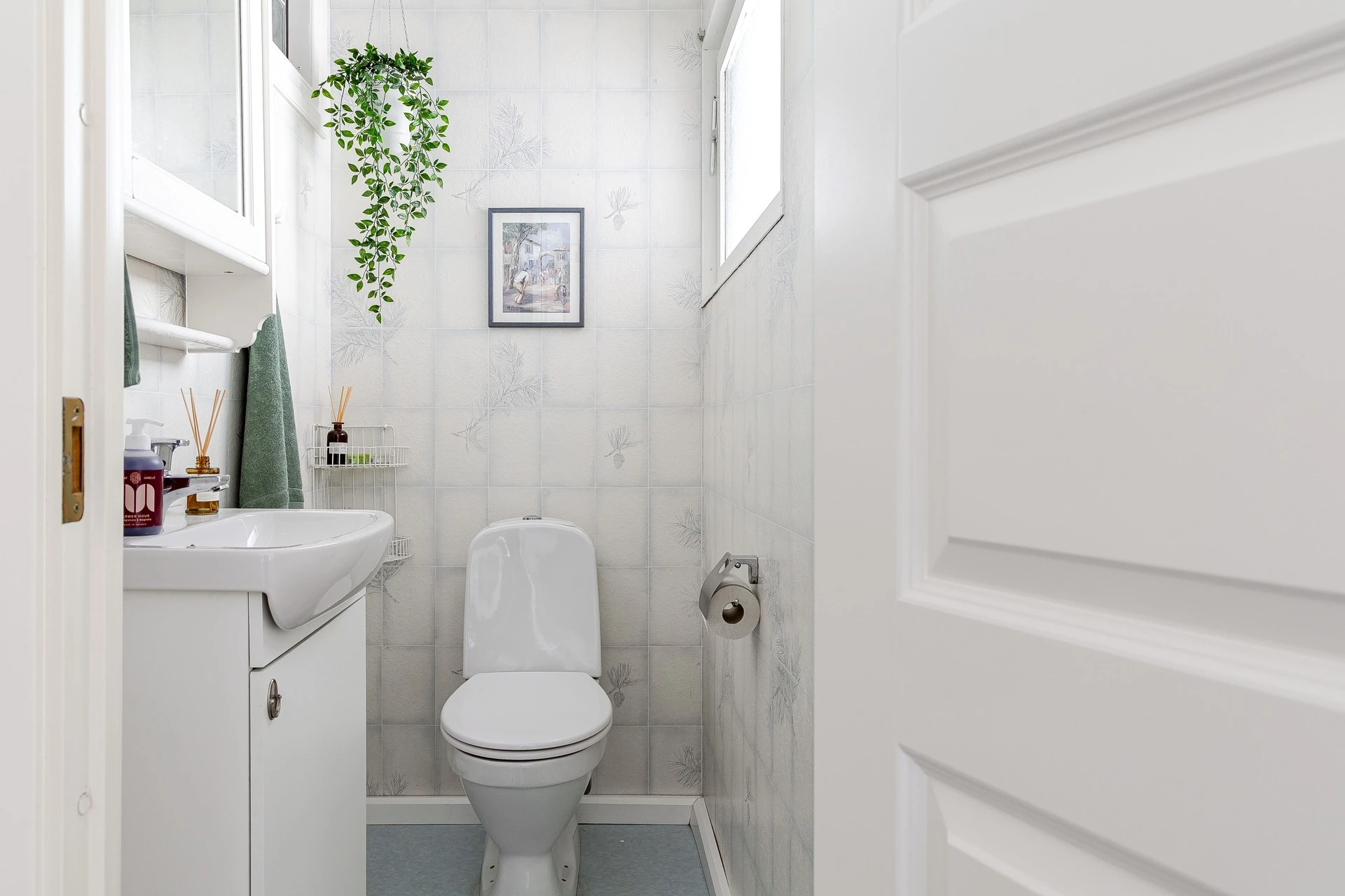 Utöver allt detta finns en toalett med wc och handfat intill samt bra med förvaringsutrymmen, både inomhus och utomhus, vilket gör huset mycket praktiskt även för den stora familjen.