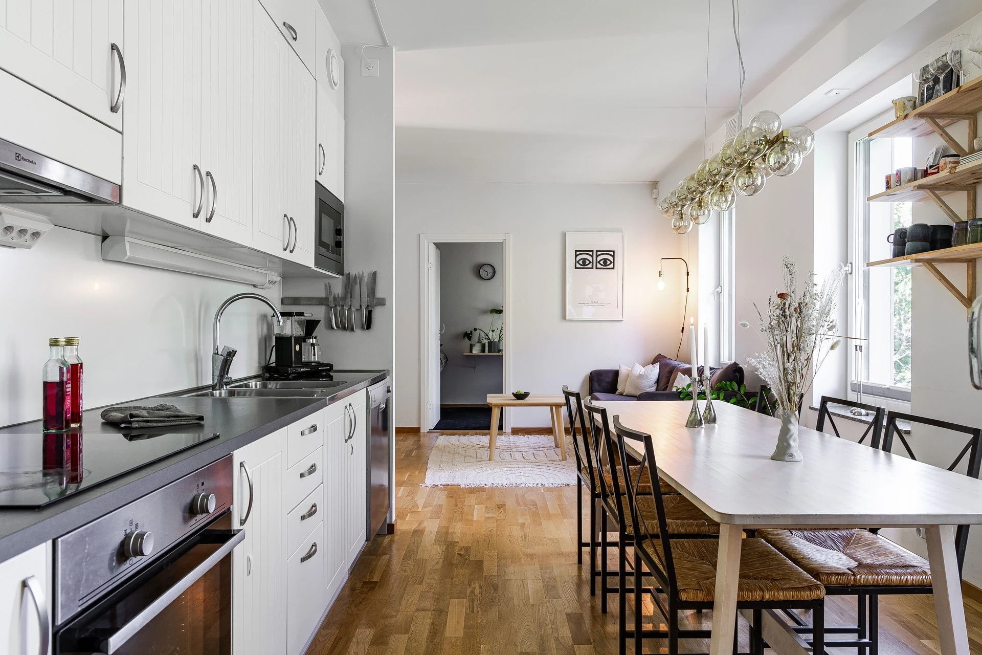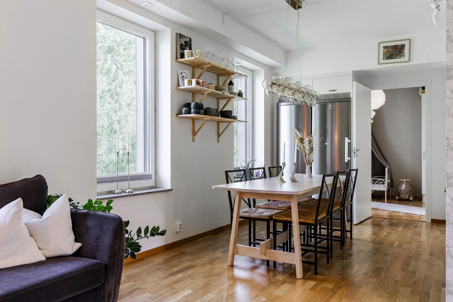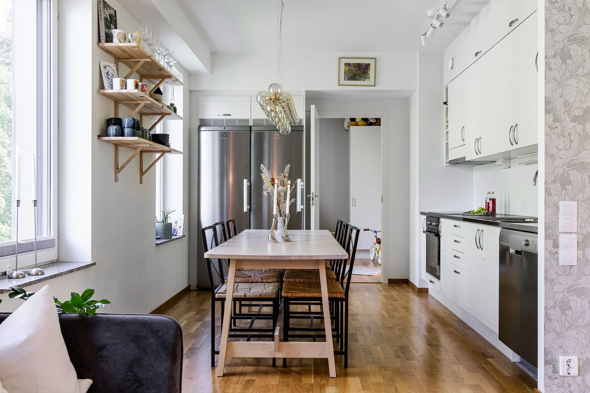 Gott om plats för både soffgrupp och matgrupp här. Planlösning mellan kök och vardagsrum är väldigt trevlig med sin öppna lösning, som i sin tur möjliggör det bästa för ett socialt liv! Det är ljusa ytskikt som varvas med de genomgående fina val av tapet och målade väggar samt parkettgolv i ek.