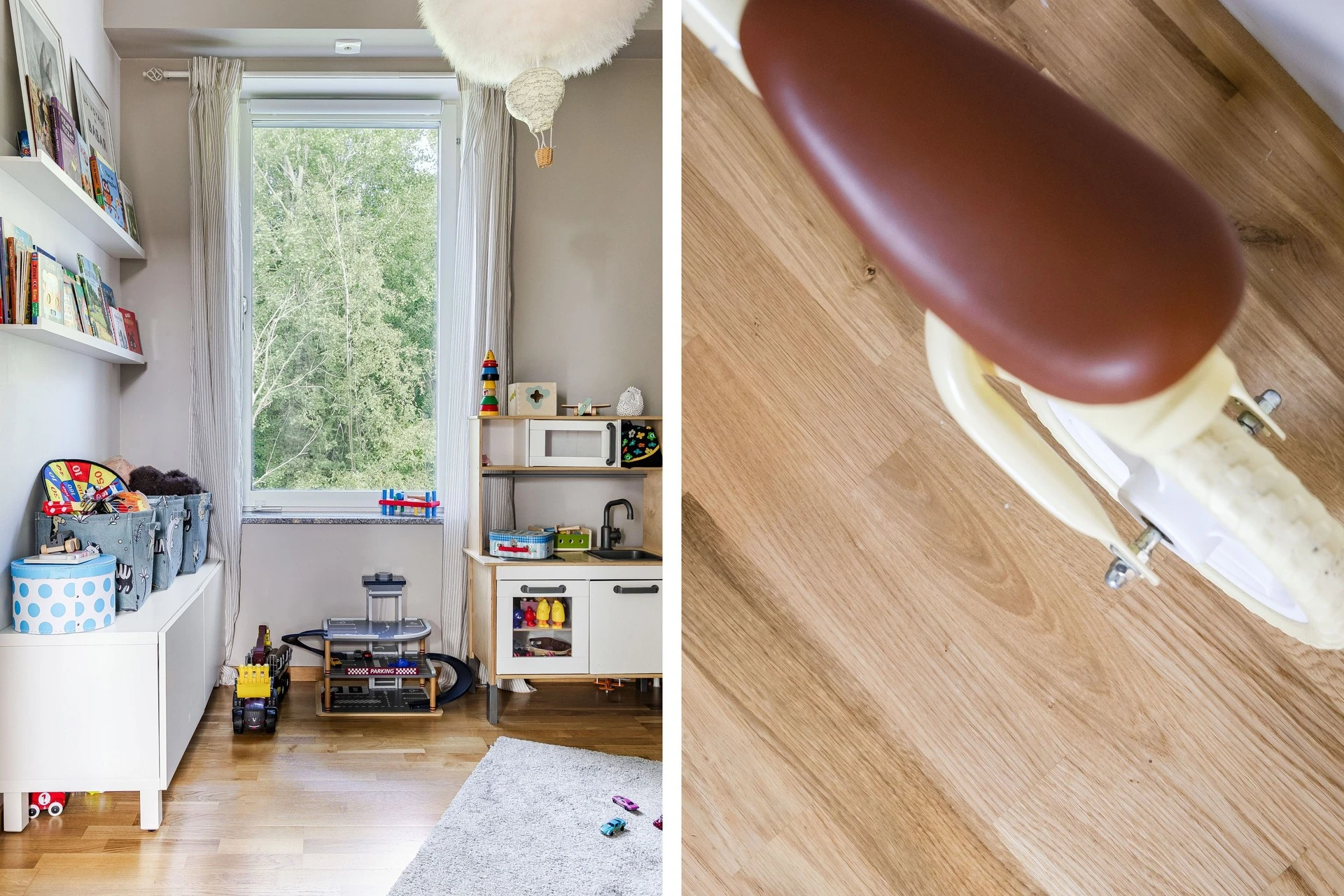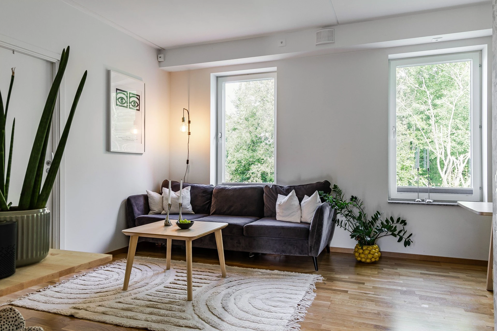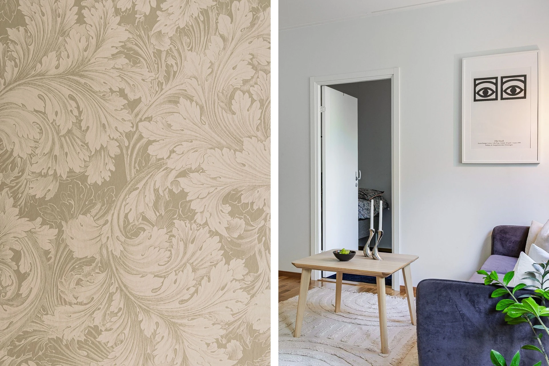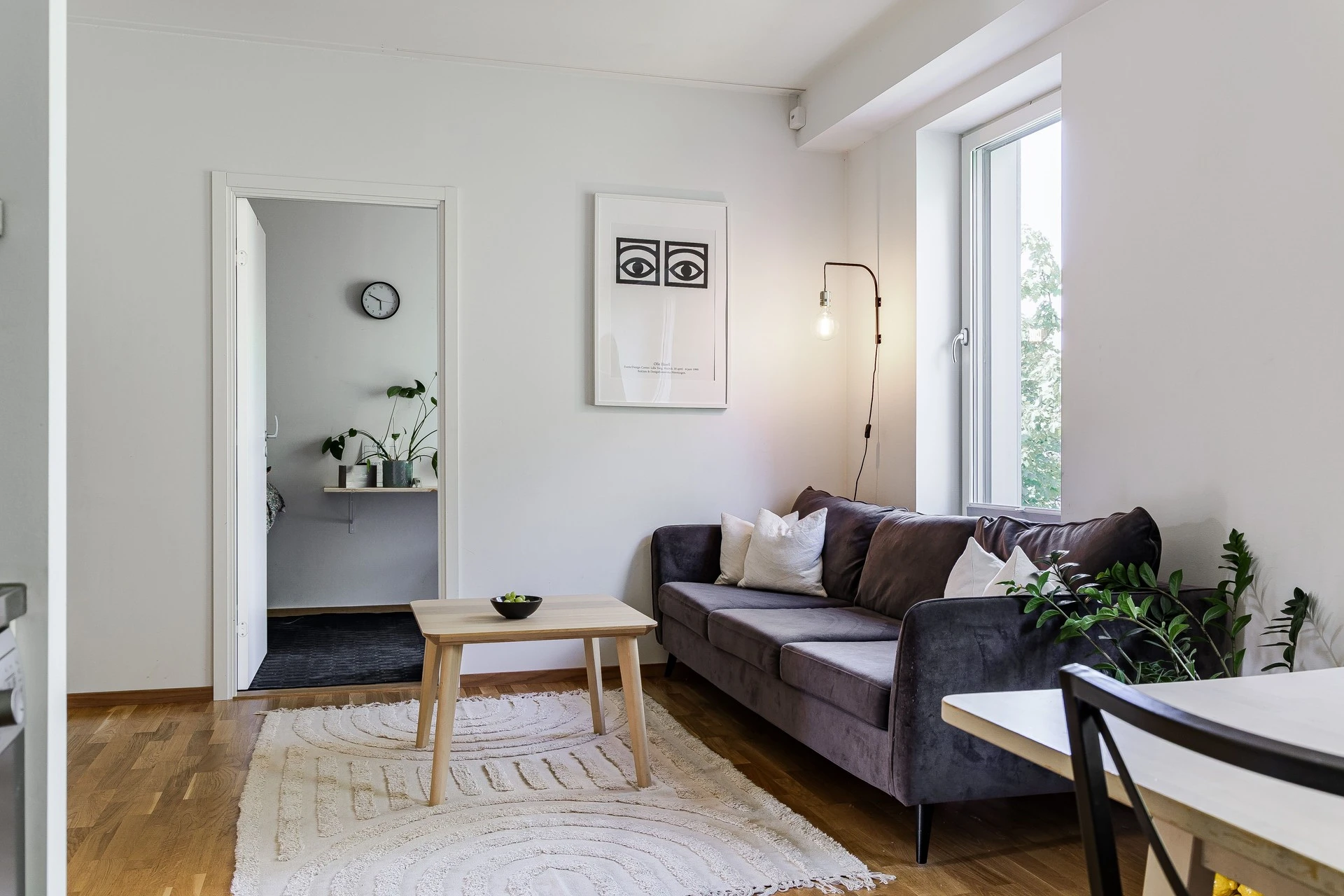 Gott om plats för både soffgrupp och matgrupp här. Planlösning mellan kök och vardagsrum är väldigt trevlig med sin öppna lösning, som i sin tur möjliggör det bästa för ett socialt liv! Det är ljusa ytskikt som varvas med de genomgående fina val av tapet och målade väggar samt parkettgolv i ek.