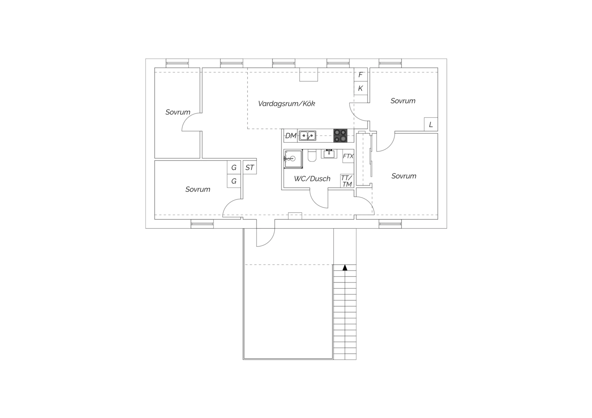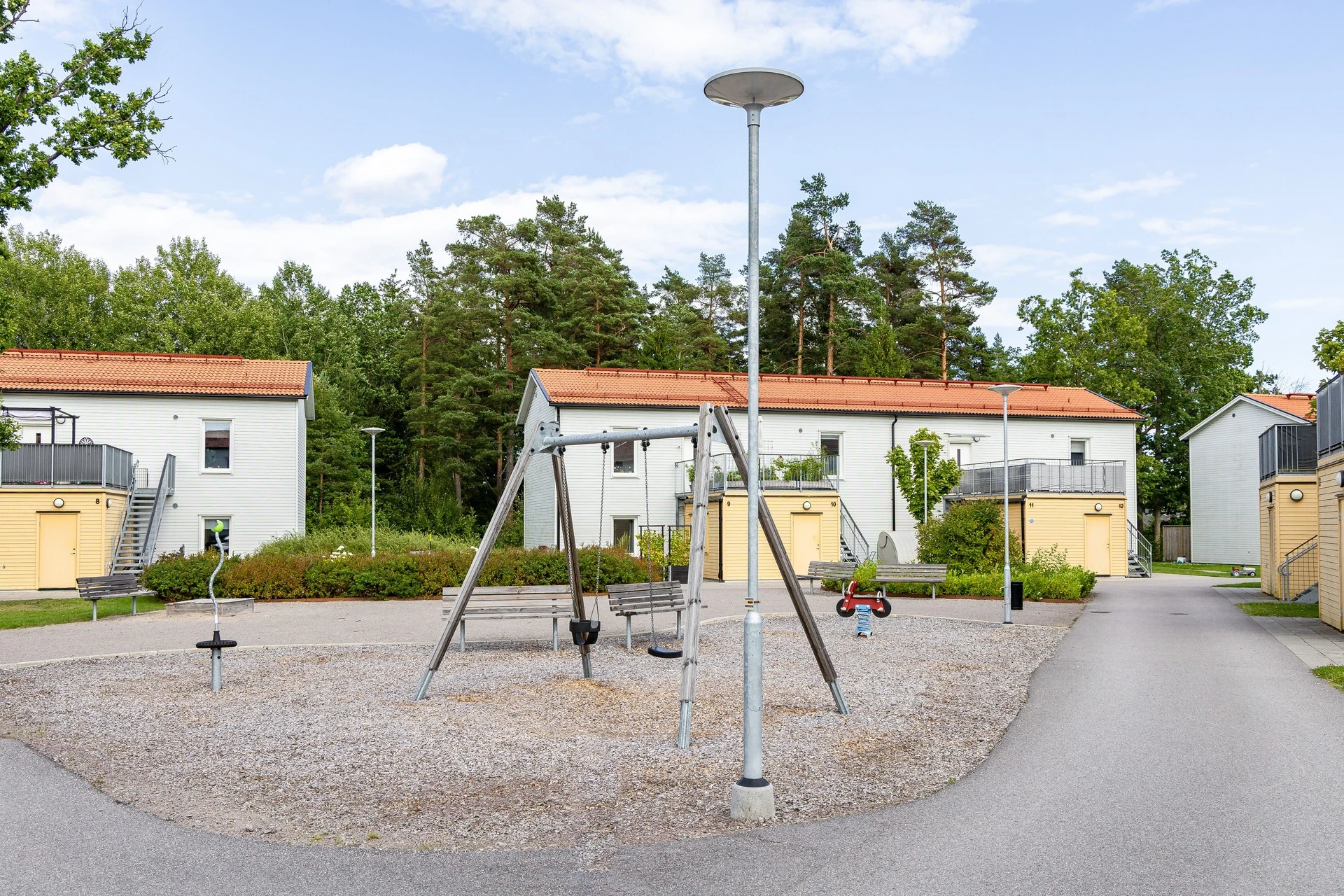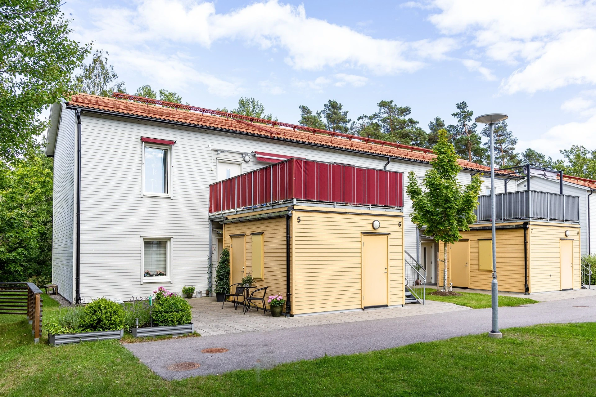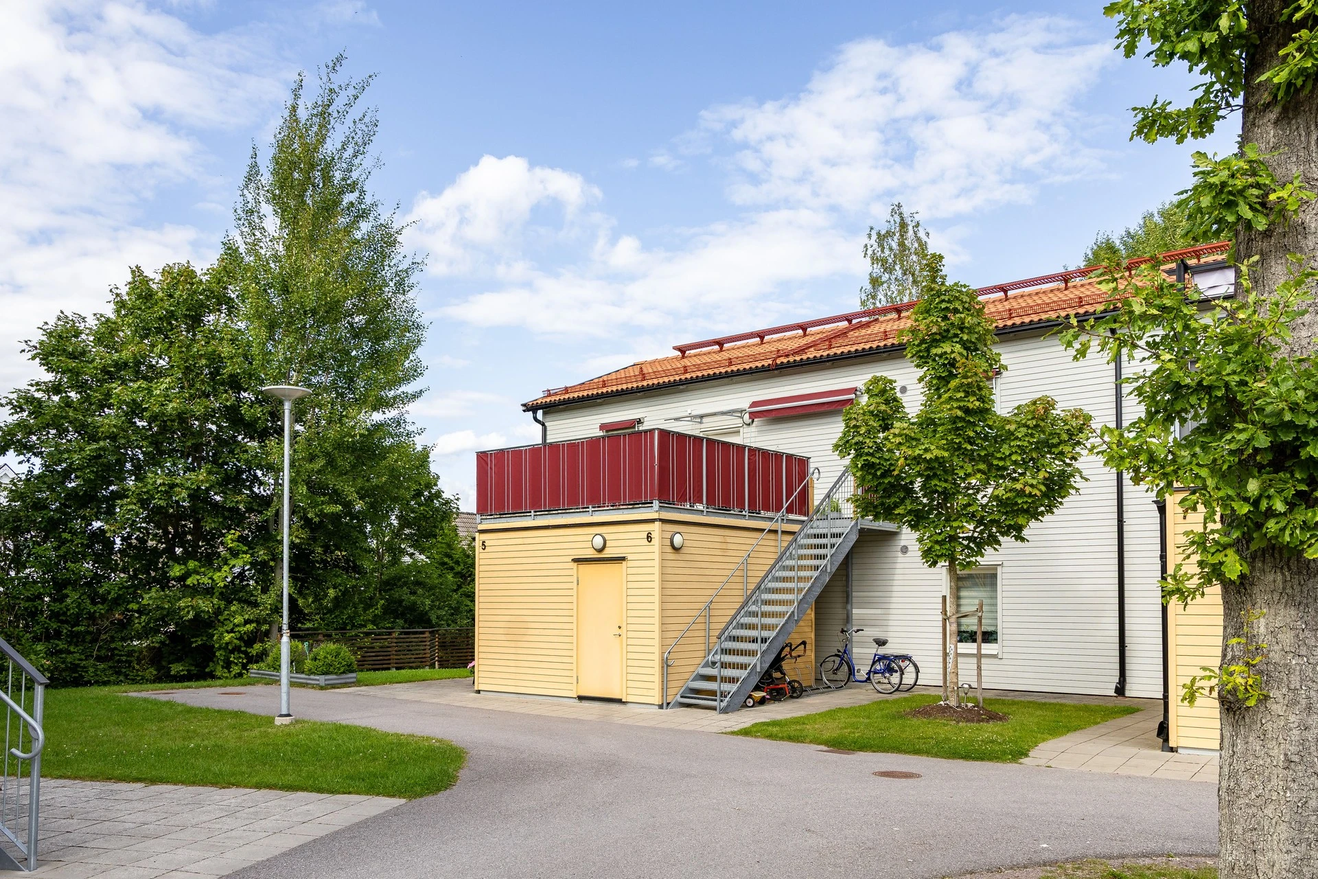 Det finns ett rymligt förråd som är fristående strax utanför bostaden, alldeles i anslutning till trappan och under takterrassen sett. Intill detta finns också egen uteplats för den som önskar njuta i markplan av kvällssolen eller medan barnen leker på innergården.