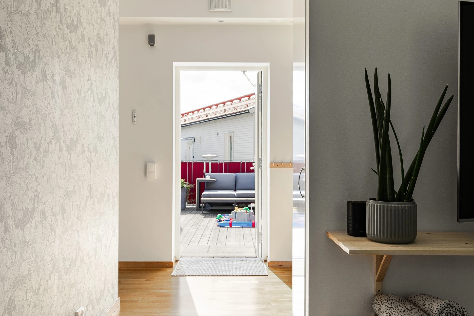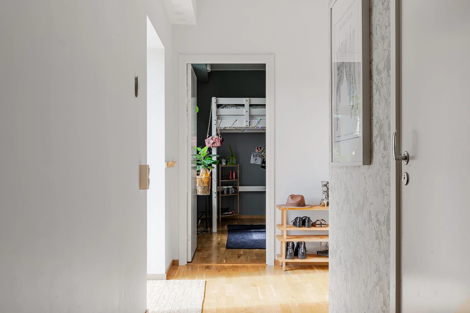 Entrén välkomnar med en rymlig hall och både smart och rymlig förvaring i form av garderober. Här kan ytterdörren med fördel stå på glänt till den egna takterrassen.