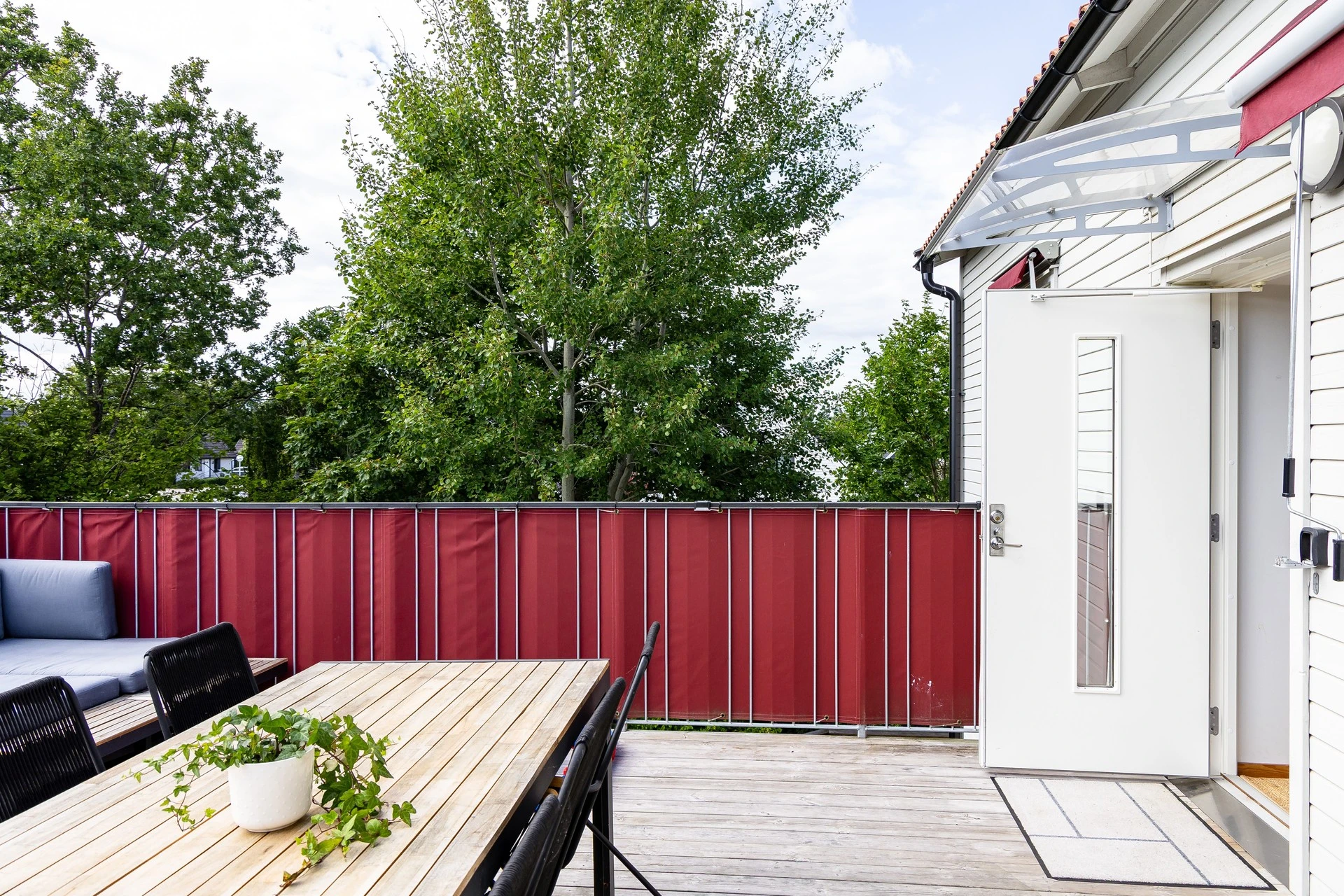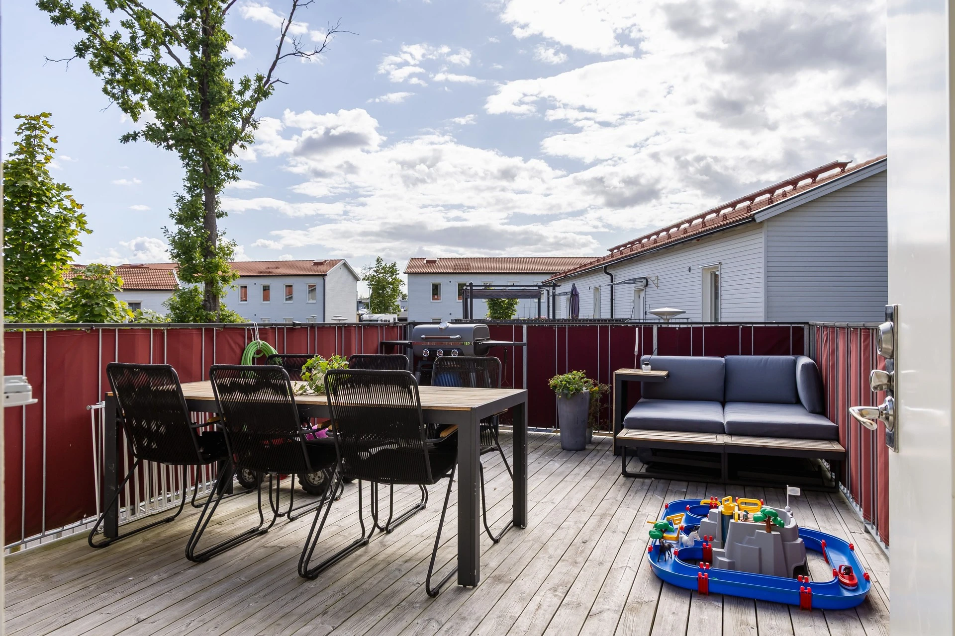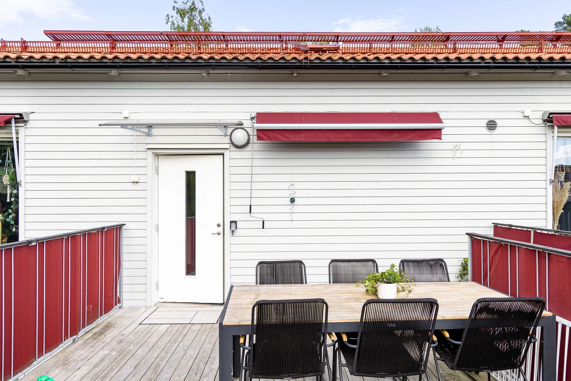 Terrassen är generöst tilltagen! Den erbjuder soligt sydostläge med eftermiddags och kvällssol. Omgivningen är lugn och läget väl skyddat på våning två av två. Den väl tilltagna storleken skapar plats för både matgrupp, solsäng, grillkvällar eller sköna loungemöbler.