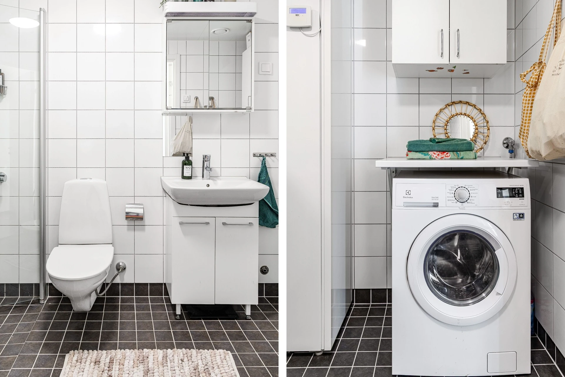 Bostaden erbjuder ett helkaklat badrum som är rymligt och bra tilltaget i sin storlek. Det erbjuds idag dusch, wc och handfat. Kombinerad tvättmaskin med torktumlare finns för en enkel vardag!