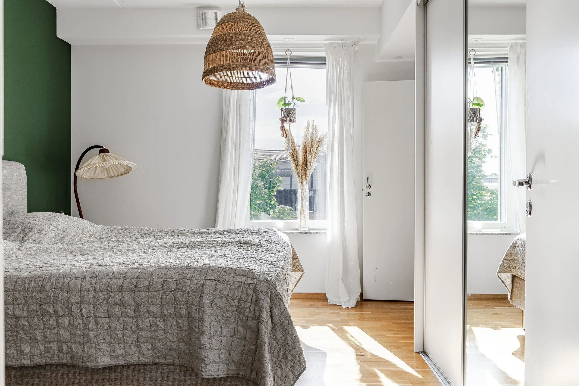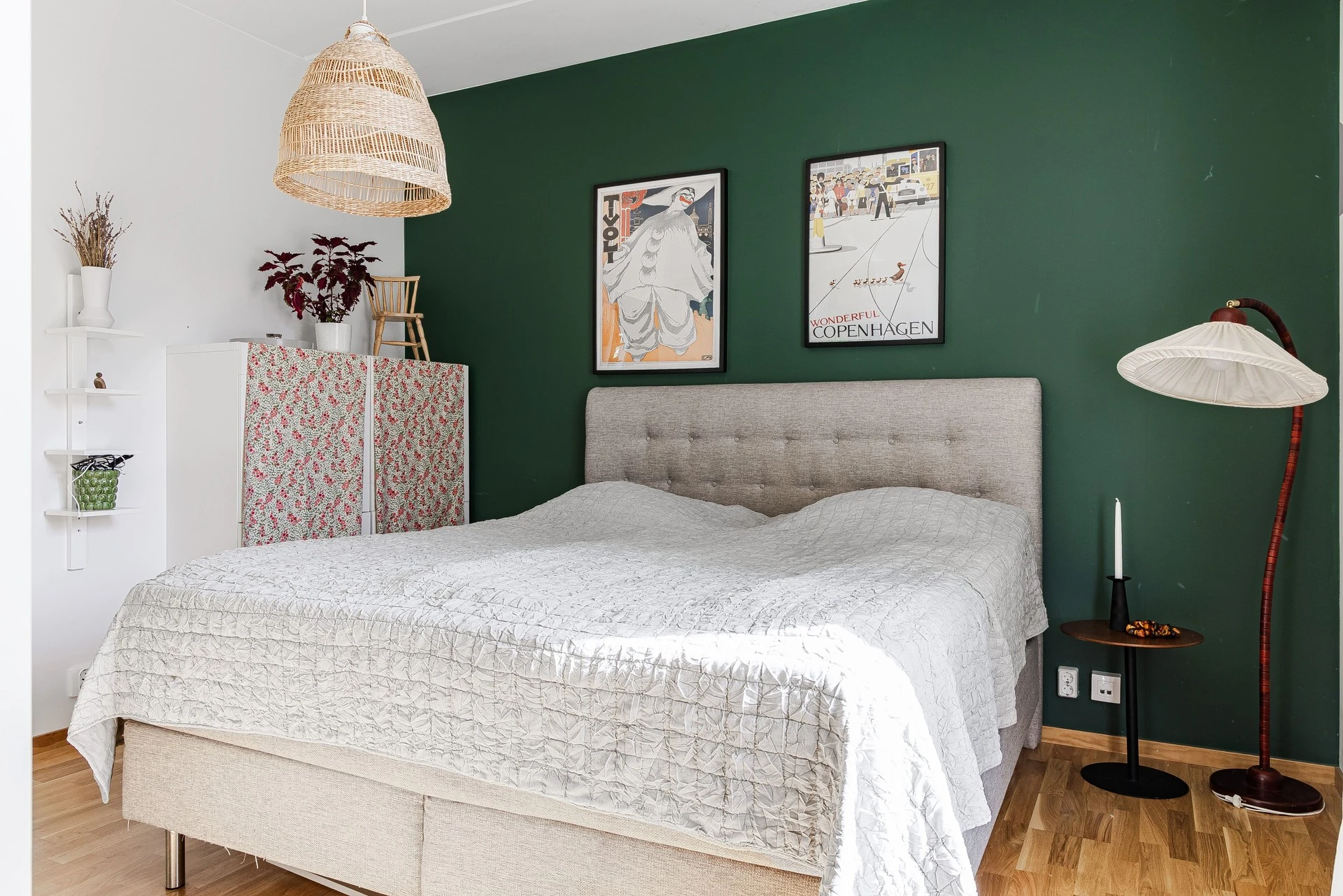 Master bedroom erbjuder gott om plats för dubbelsäng och bra förvaringsmöjlighet finns med garderober. Ljusa väggar med mörkgrön fondvägg och ekparkett på golv.