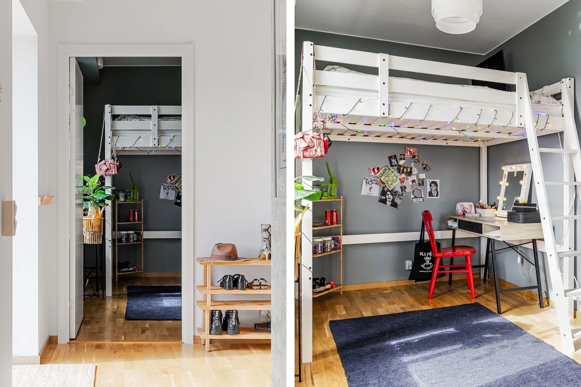 Också skyddad belägenhet mot baksidan sett. Detta är det extra rum som tillkommit hos nuvarande ägare. Uppreglat på stålreglar gör det också möjlig att demontera för den som önskar återskapa fyrarummaren. Ljust målade väggar med ekparkett på golv.