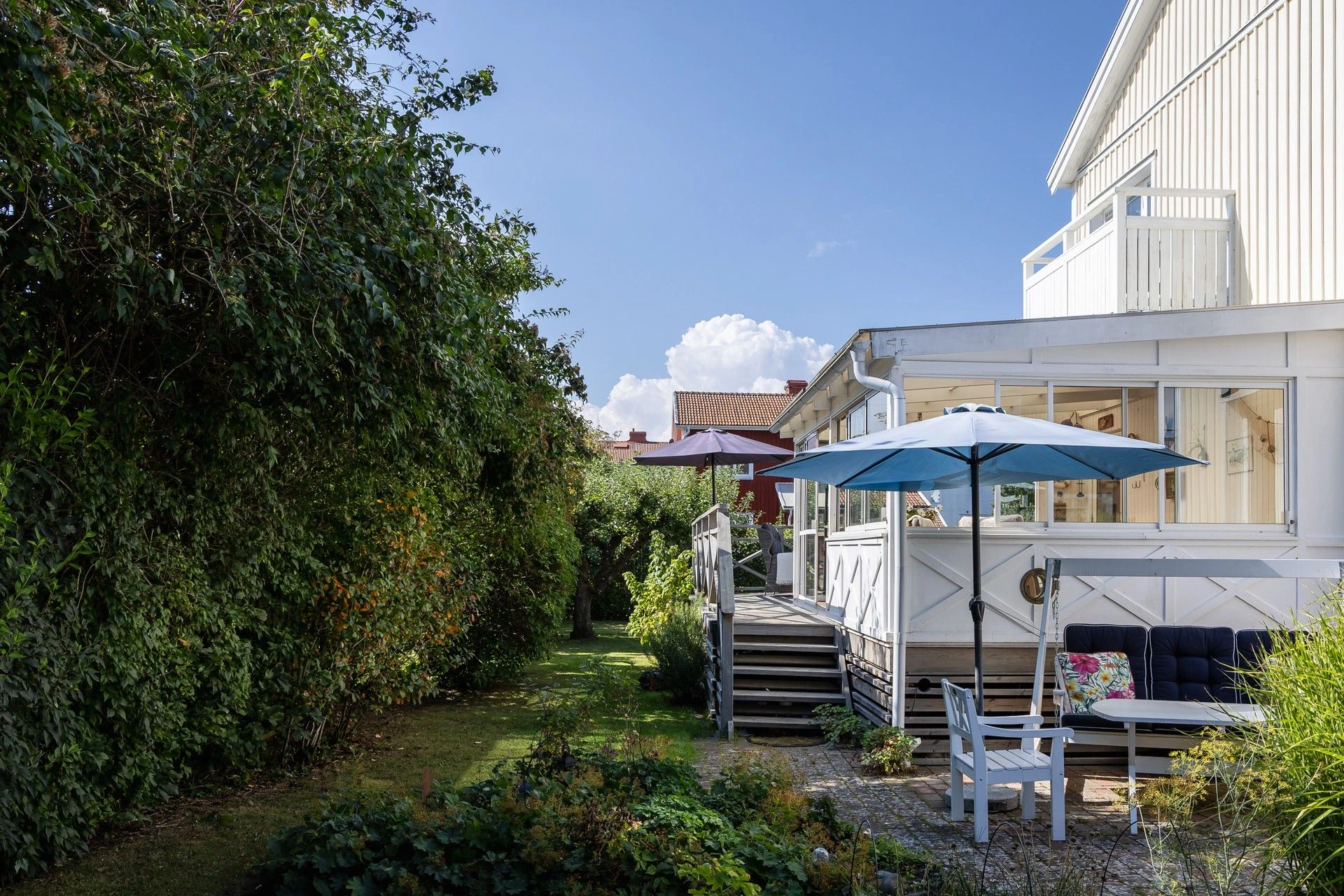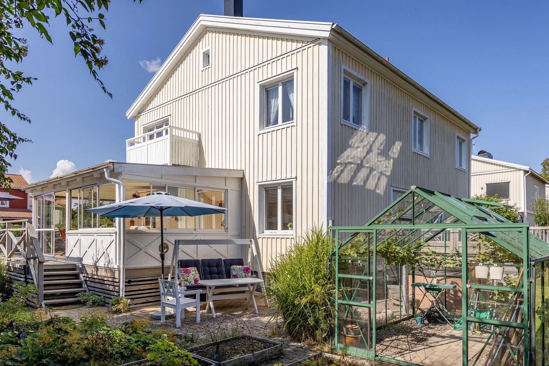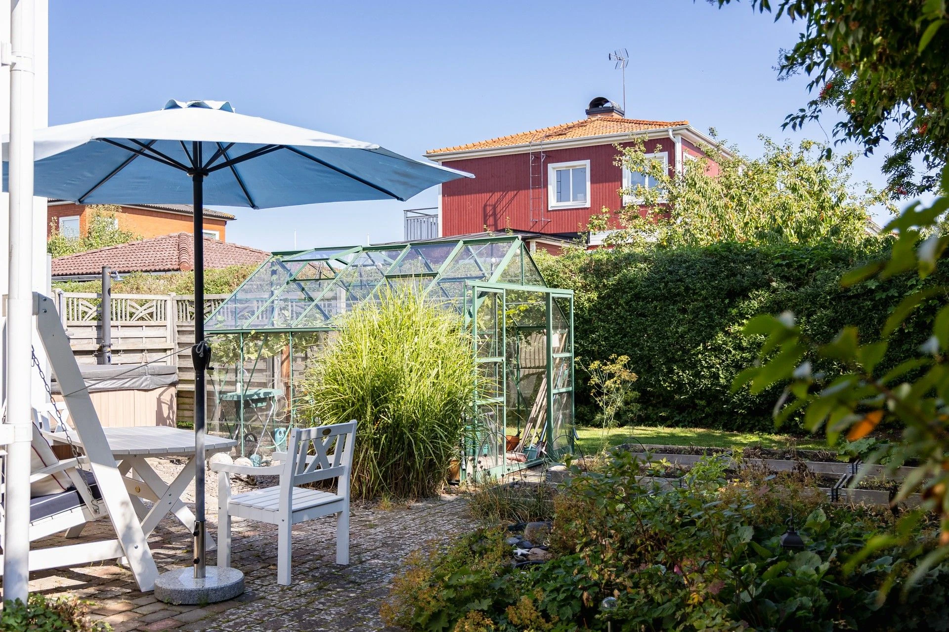 Lummig och grönskande tomt med fint insynsskydd. Uterum med skön kvällssol, kanalplast i tak, energiglas och isolerat golv med golvvärme och klinker som förlänger säsongen. Växthus för gröna fingrar, spabad för svalkande eller värmande dopp. Huset har flera stora renoveringar genomförda. Skönt att slippa tänka på takrenovering, bergvärmepump, dränering och stambyte! Via bergvärmepumpen och täljstensspisen med fläkt håller ni enkelt nere driftskostnaden och får ett mysigt klimat hela året!