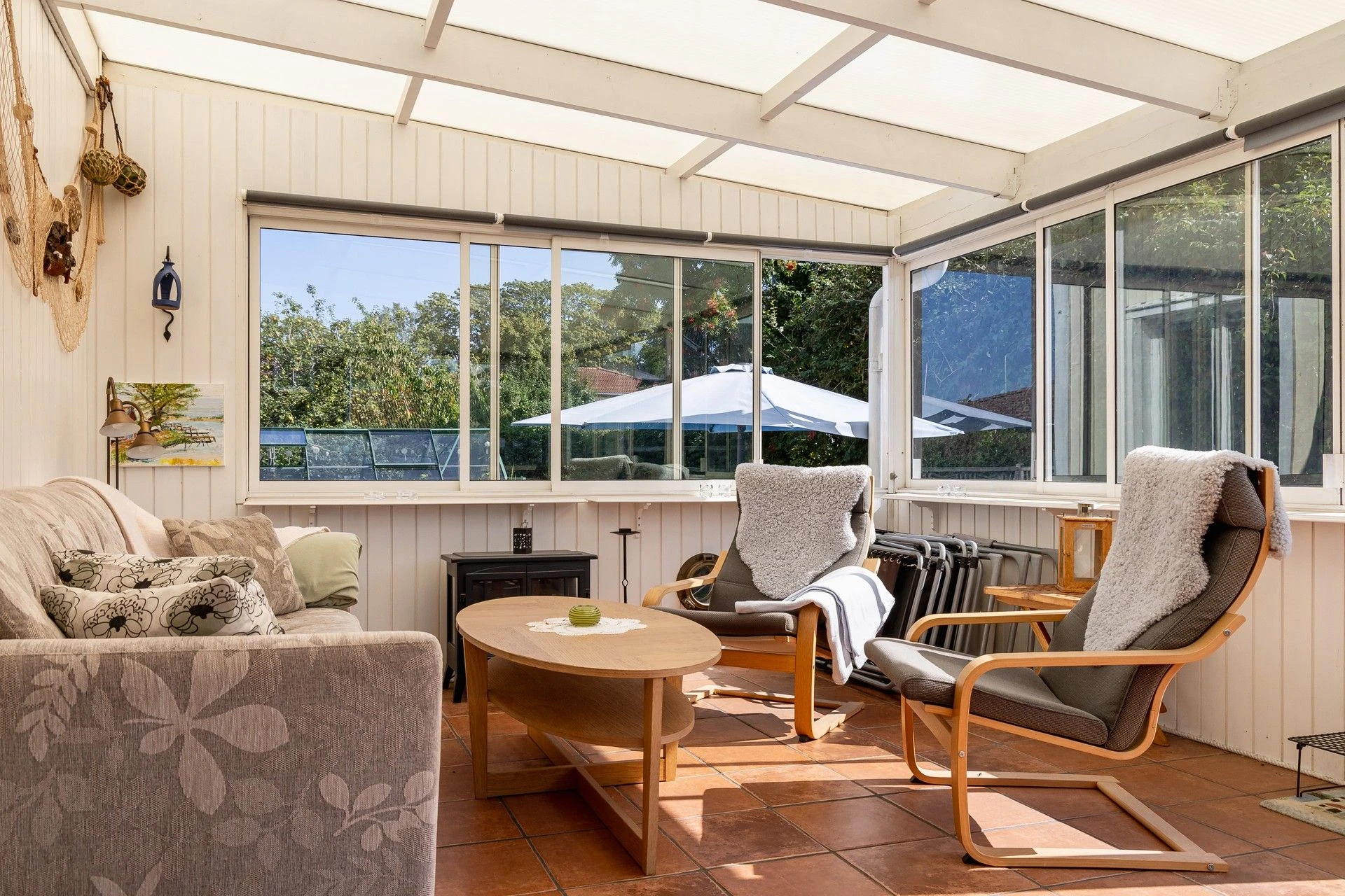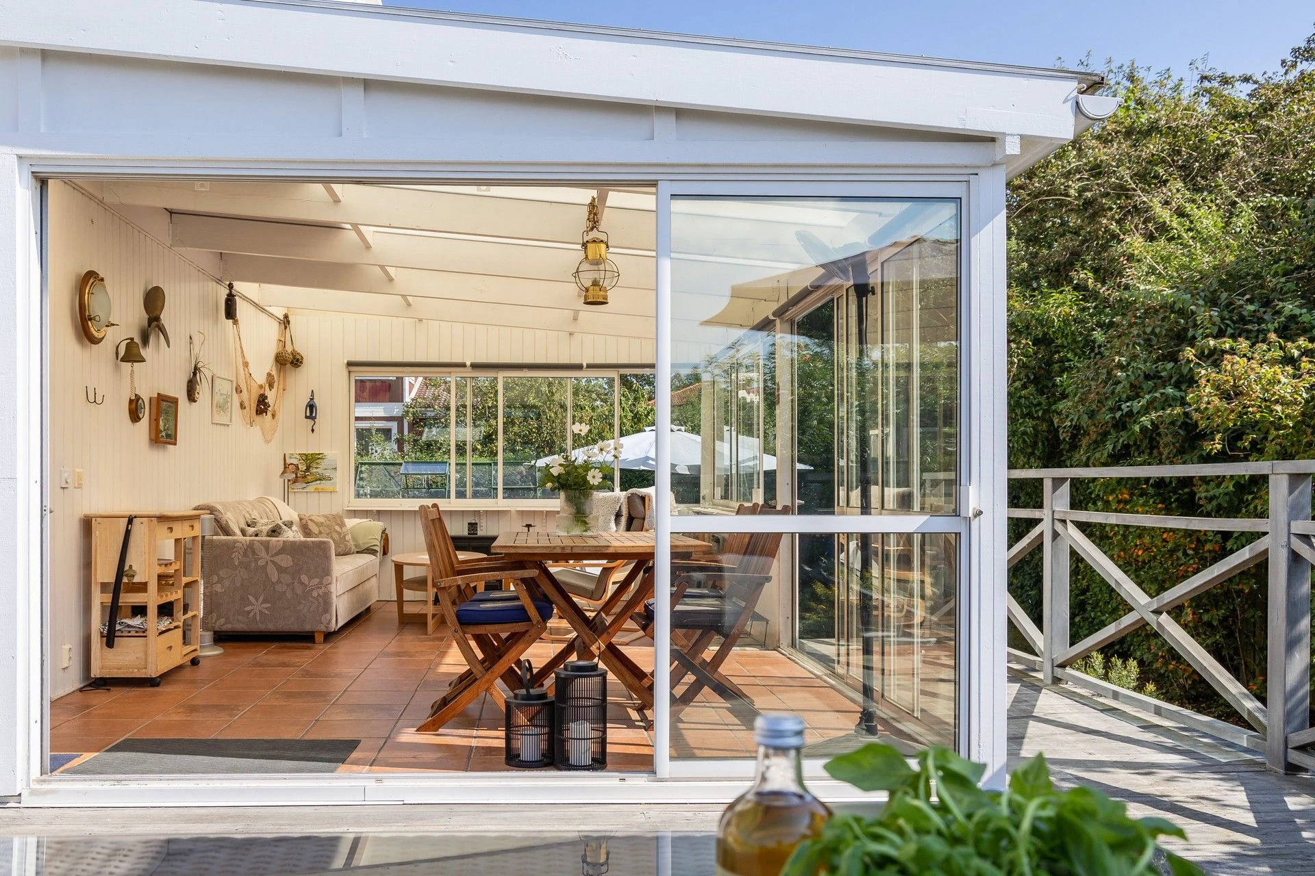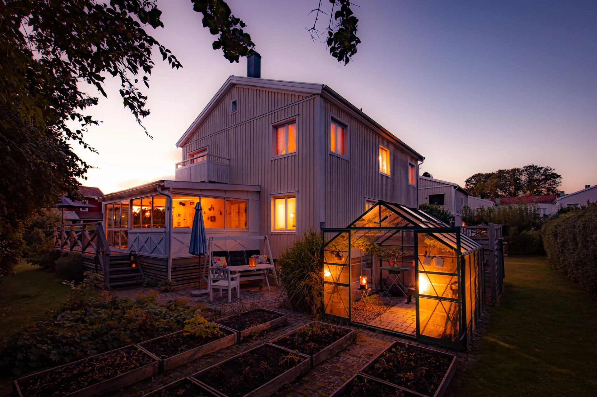 Lummig och grönskande tomt med fint insynsskydd. Uterum med skön kvällssol, kanalplast i tak, energiglas och isolerat golv med golvvärme och klinker som förlänger säsongen. Växthus för gröna fingrar, spabad för svalkande eller värmande dopp. Huset har flera stora renoveringar genomförda. Skönt att slippa tänka på takrenovering, bergvärmepump, dränering och stambyte! Via bergvärmepumpen och täljstensspisen med fläkt håller ni enkelt nere driftskostnaden och får ett mysigt klimat hela året!