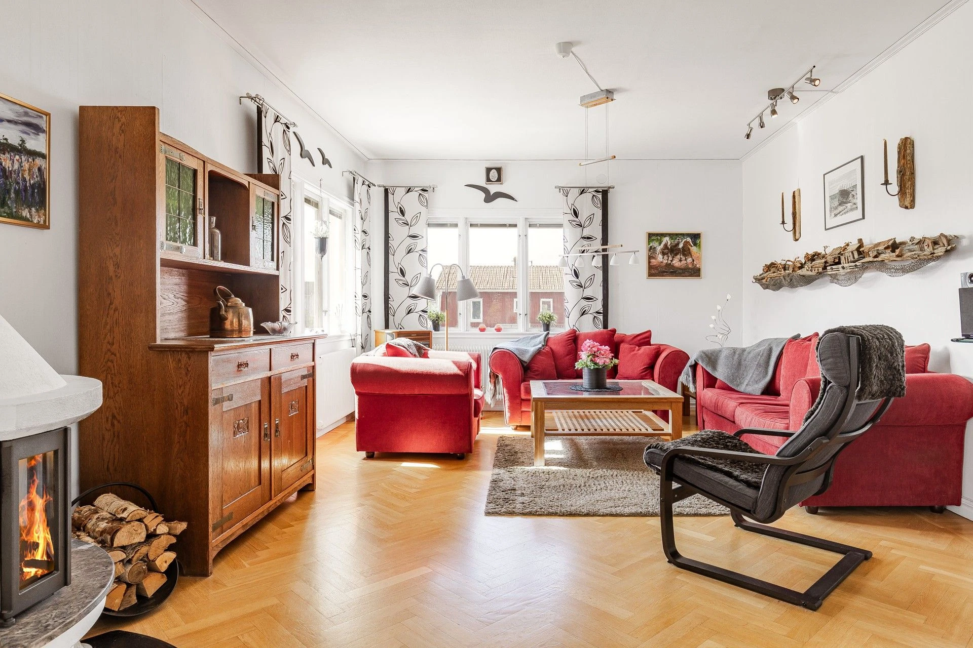 Uppvärmning: Bergvärme och kompletterande luft/luftvärmepump och kamin.