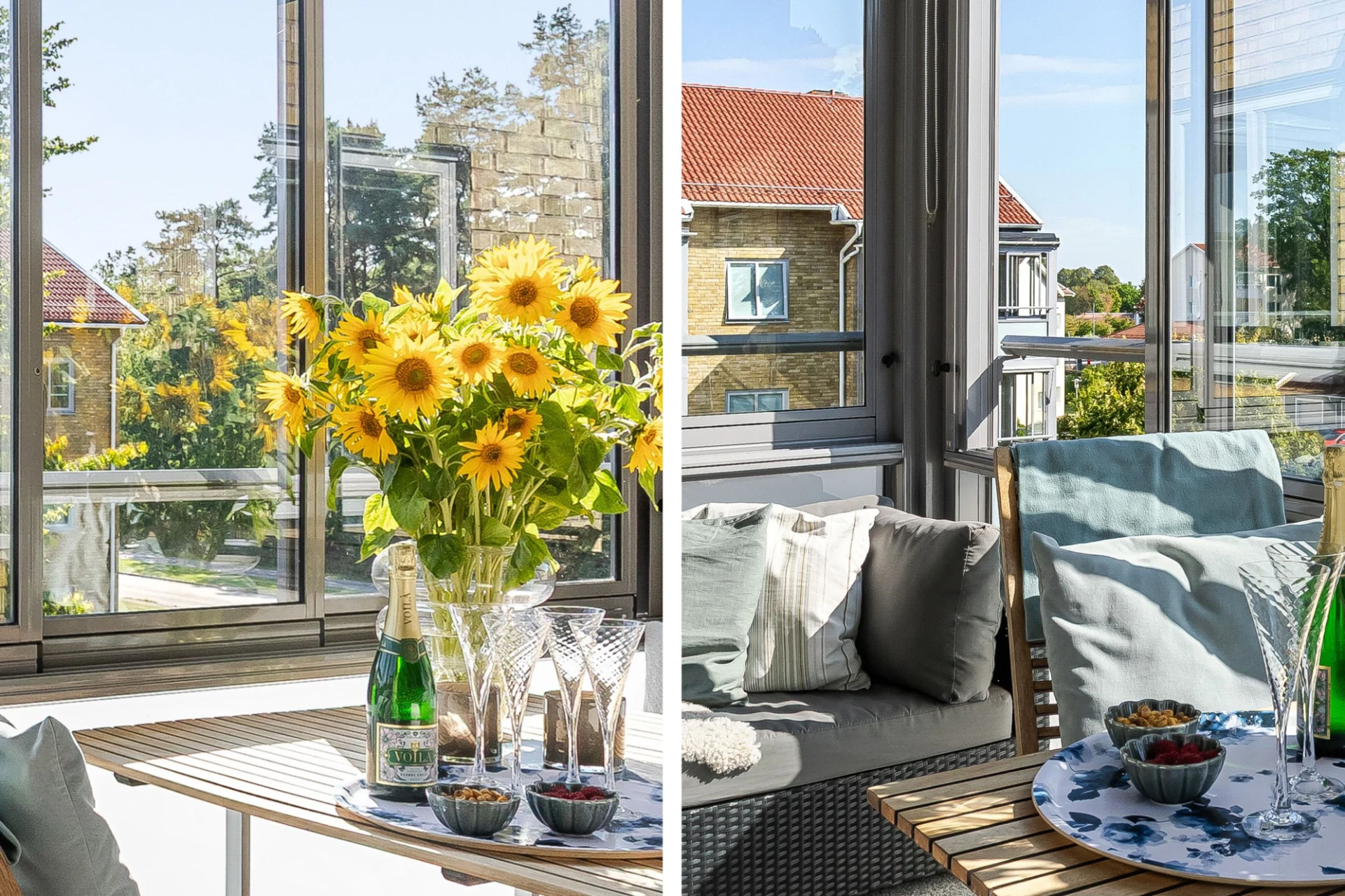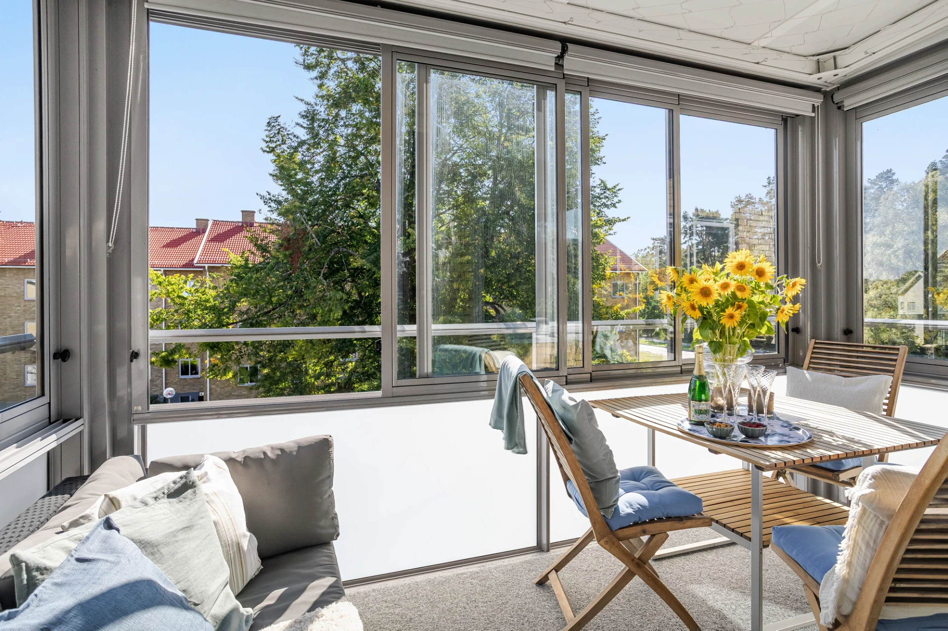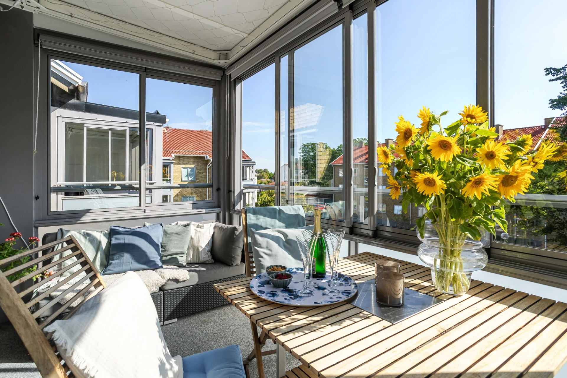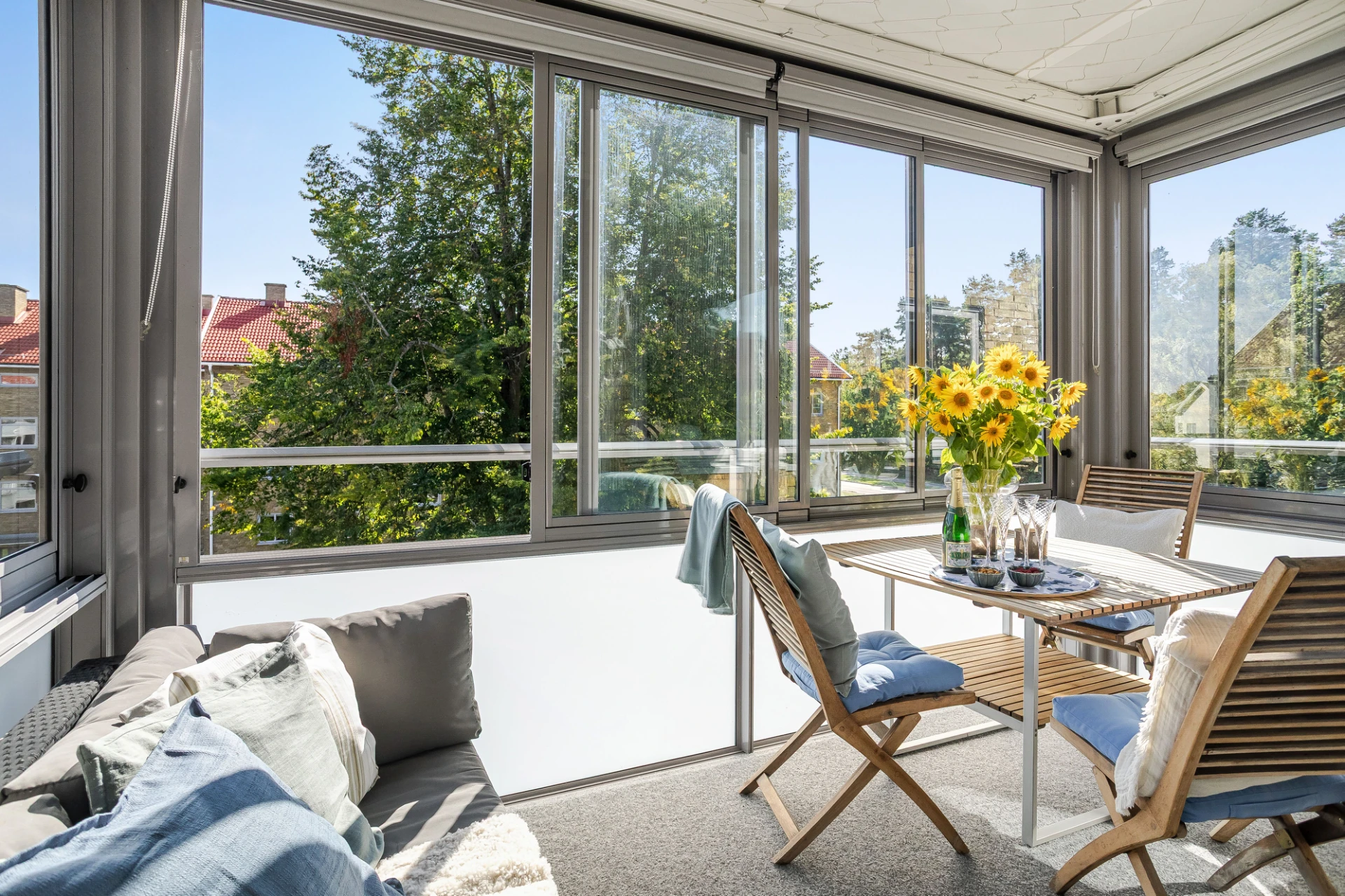 Vardagsrummet är väl tilltaget, här inryms såväl matsalsmöbel, den stora favoritsoffan samt en större förvaringsmöbel/tv-bänk. Här är det endast fantasin som sätter gränser för hur du önskar möblera. Det är också härifrån som du når den härliga inglasade balkongen som förlänger sommarsäsongen såväl vår som höst. Här kan du njuta av alla dagens måltider och/eller bara känna av lugnet efter en arbetsdag i loungemöbeln med en härlig bok.