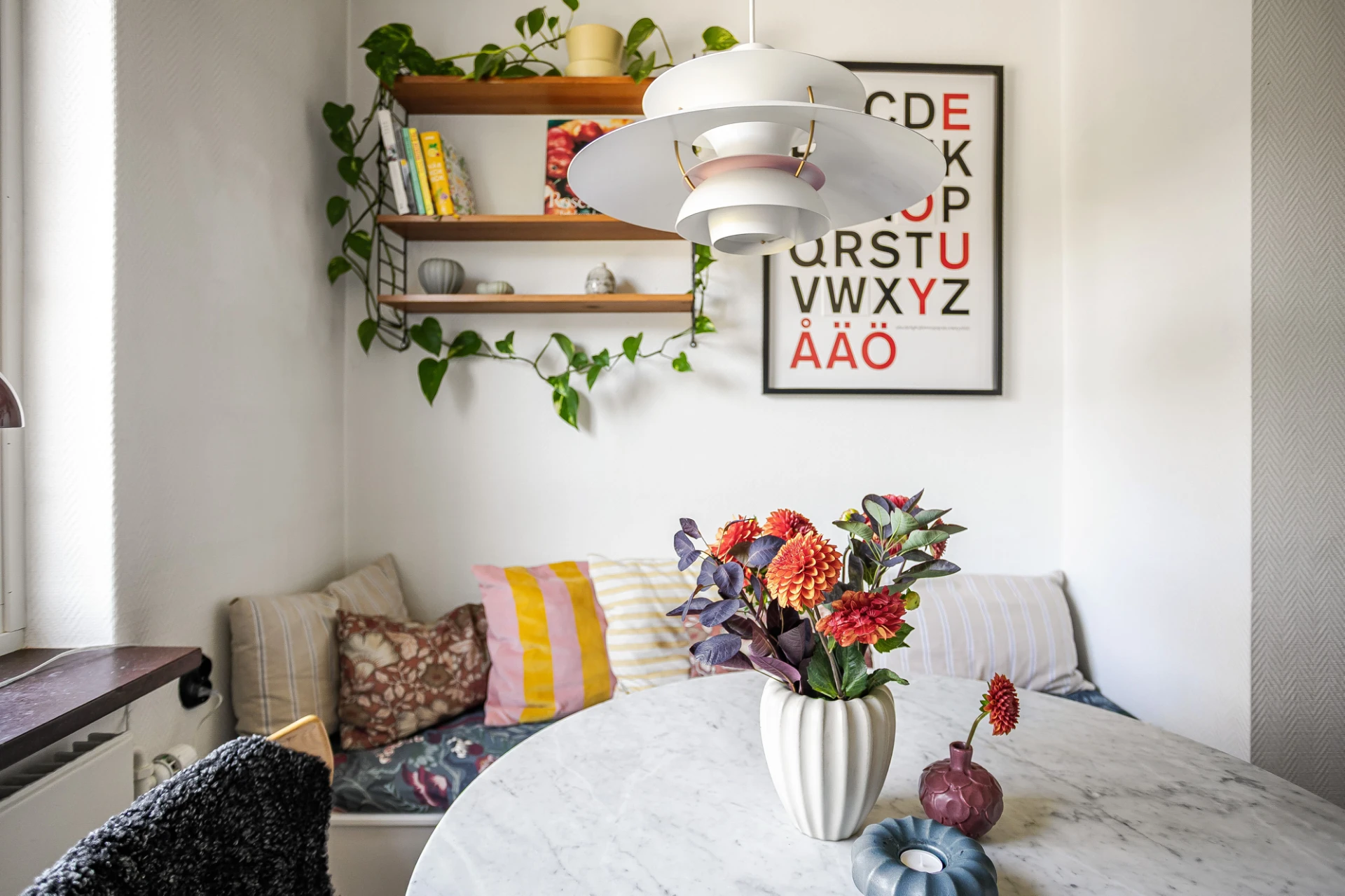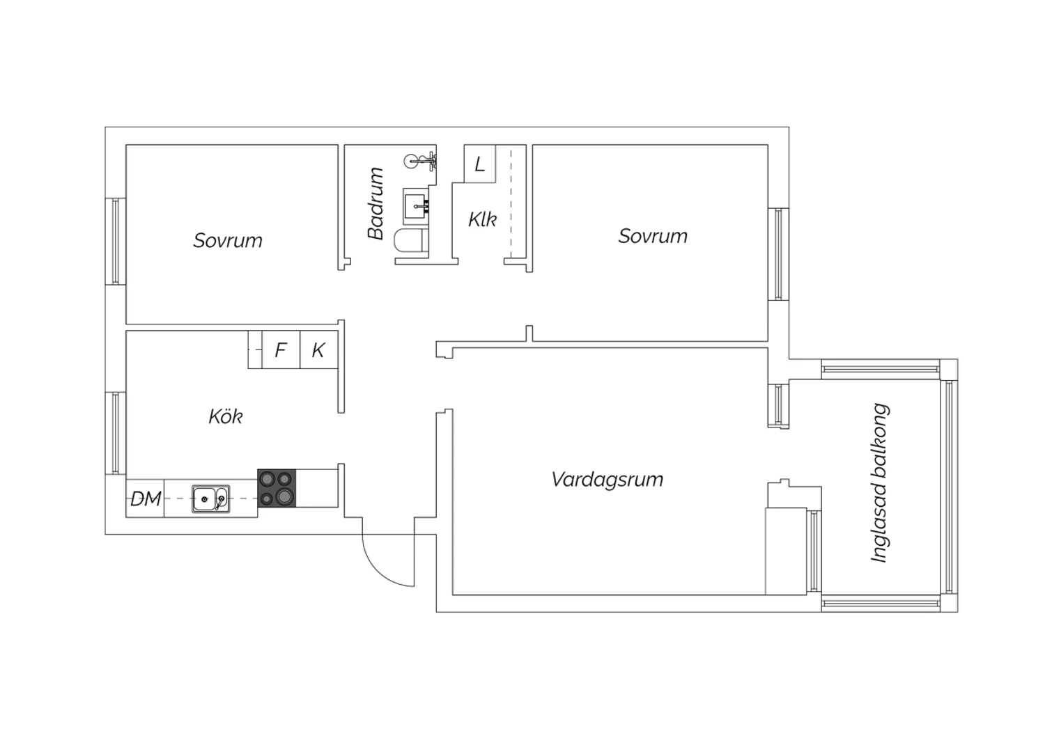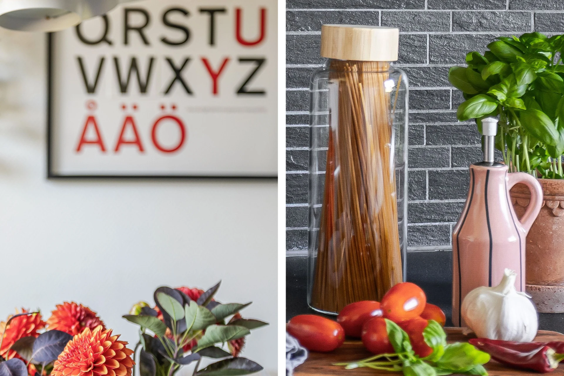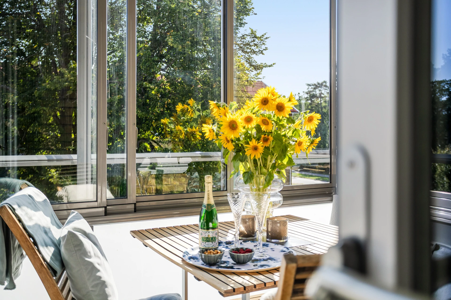 Vardagsrummet är väl tilltaget, här inryms såväl matsalsmöbel, den stora favoritsoffan samt en större förvaringsmöbel/tv-bänk. Här är det endast fantasin som sätter gränser för hur du önskar möblera. Det är också härifrån som du når den härliga inglasade balkongen som förlänger sommarsäsongen såväl vår som höst. Här kan du njuta av alla dagens måltider och/eller bara känna av lugnet efter en arbetsdag i loungemöbeln med en härlig bok.
