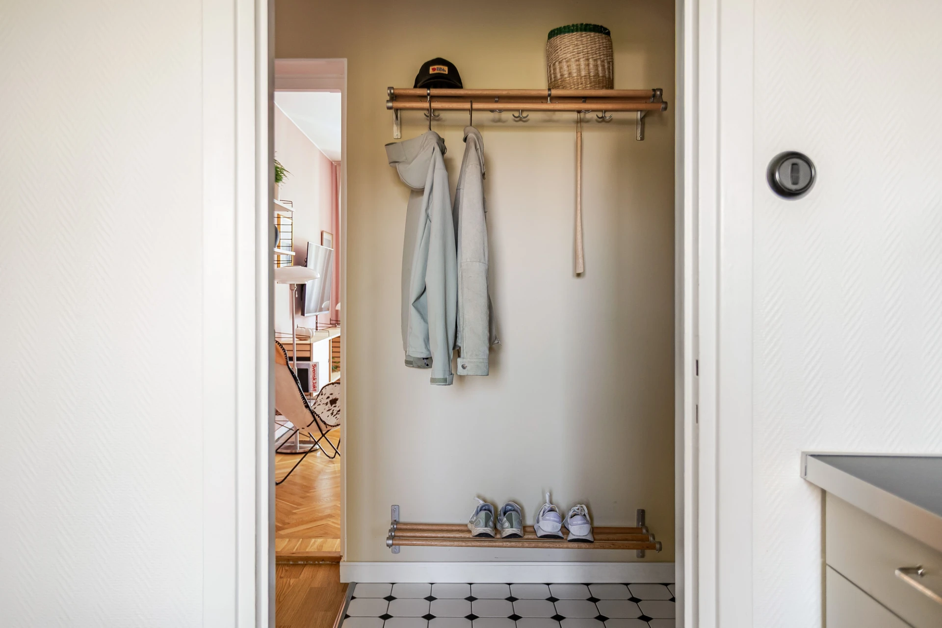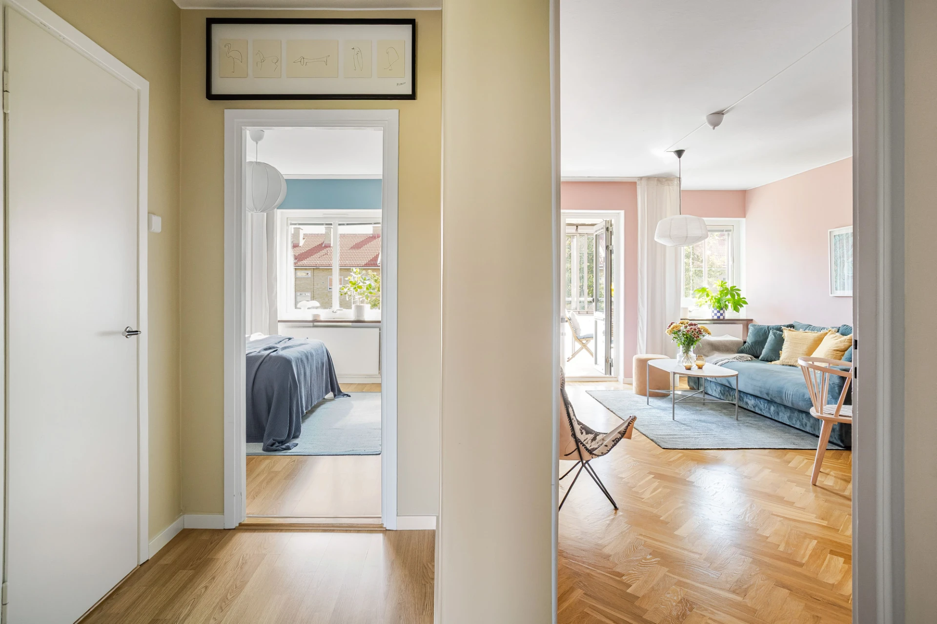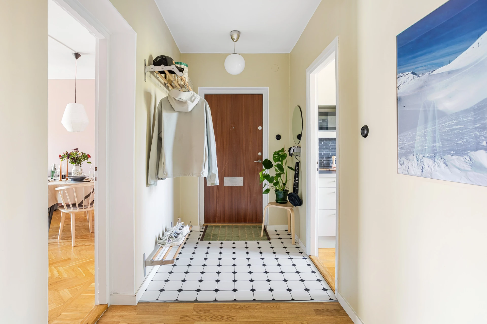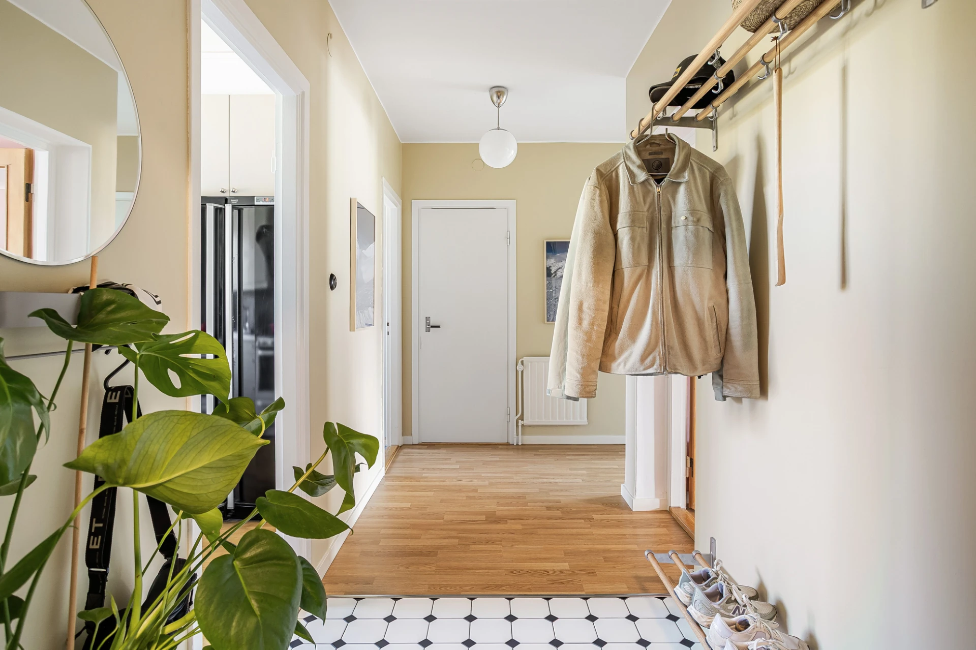 Vacker hall med praktisk elegant klinker som övergår träliknande laminatgolv. Samma golv som sedan löper fint in i båda sovrummen. Väggarna är ljust gula och i den inre hallen finns en praktisk klädkammare för förvaring.