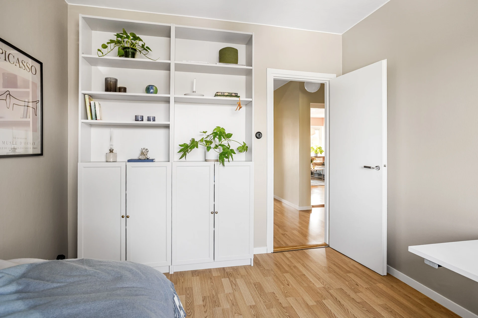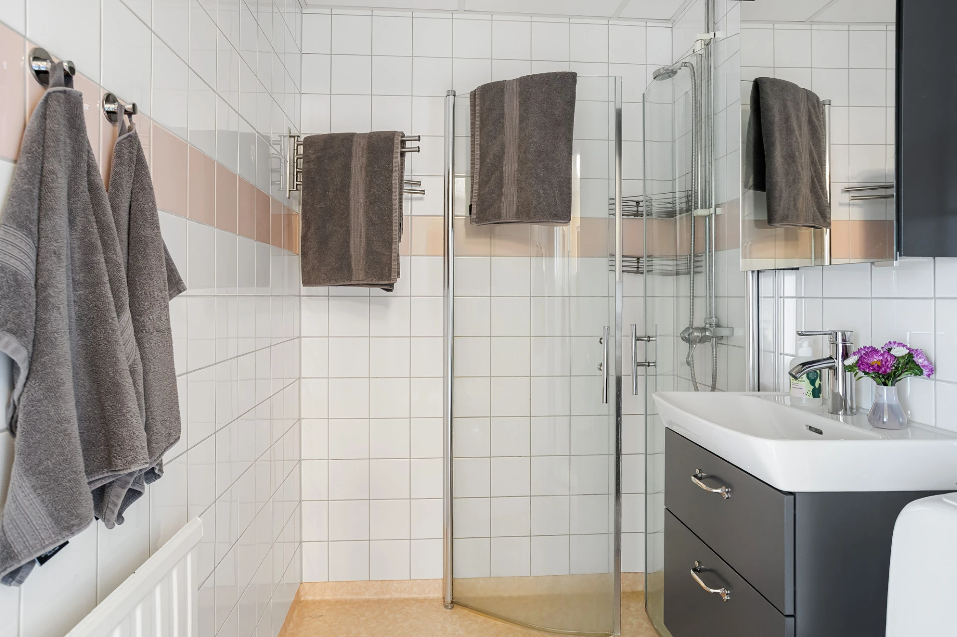 Sovrummen är rymliga och ligger bra avskiljt från varandra. Extra lyxigt med flertalet garderober med skjutpartier är verkligen guld värt när det gäller förvaring. På tal om förvaring så finns det en större klädkammare i den inre delen av hallen. Badrummet är delvis kaklat och här finns dusch med glasdörrar, handfat med kommod, spegelskåp, wc och handdukstork.
