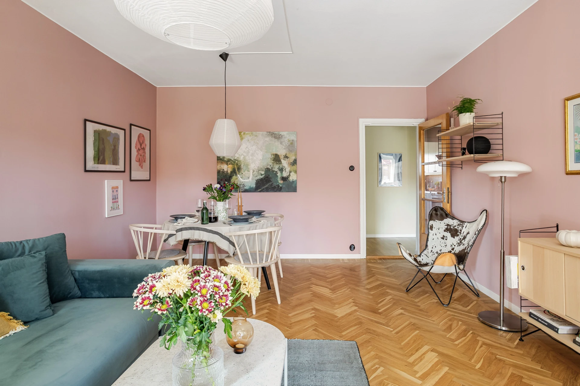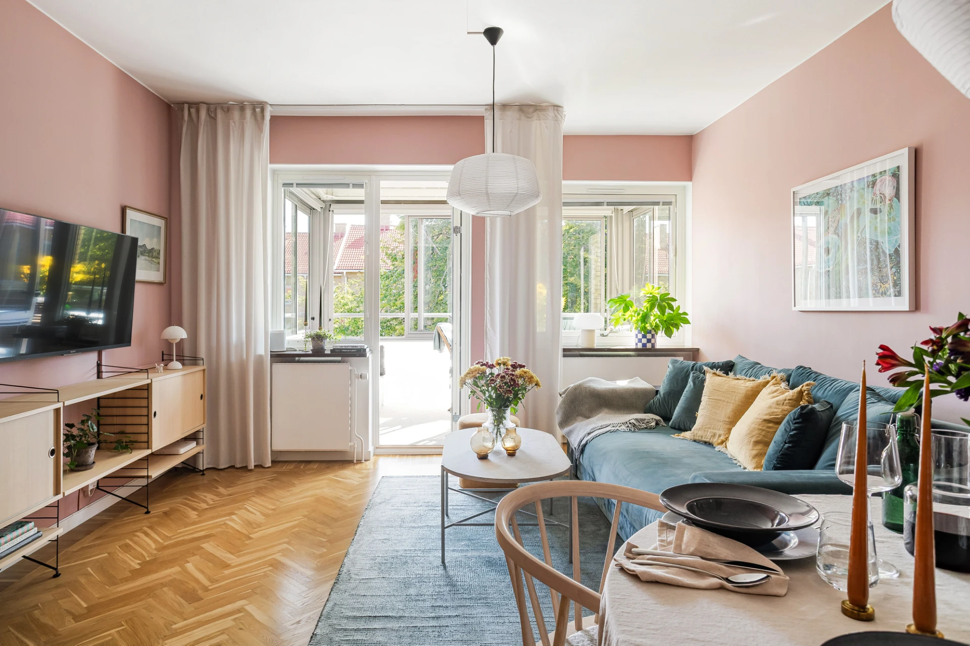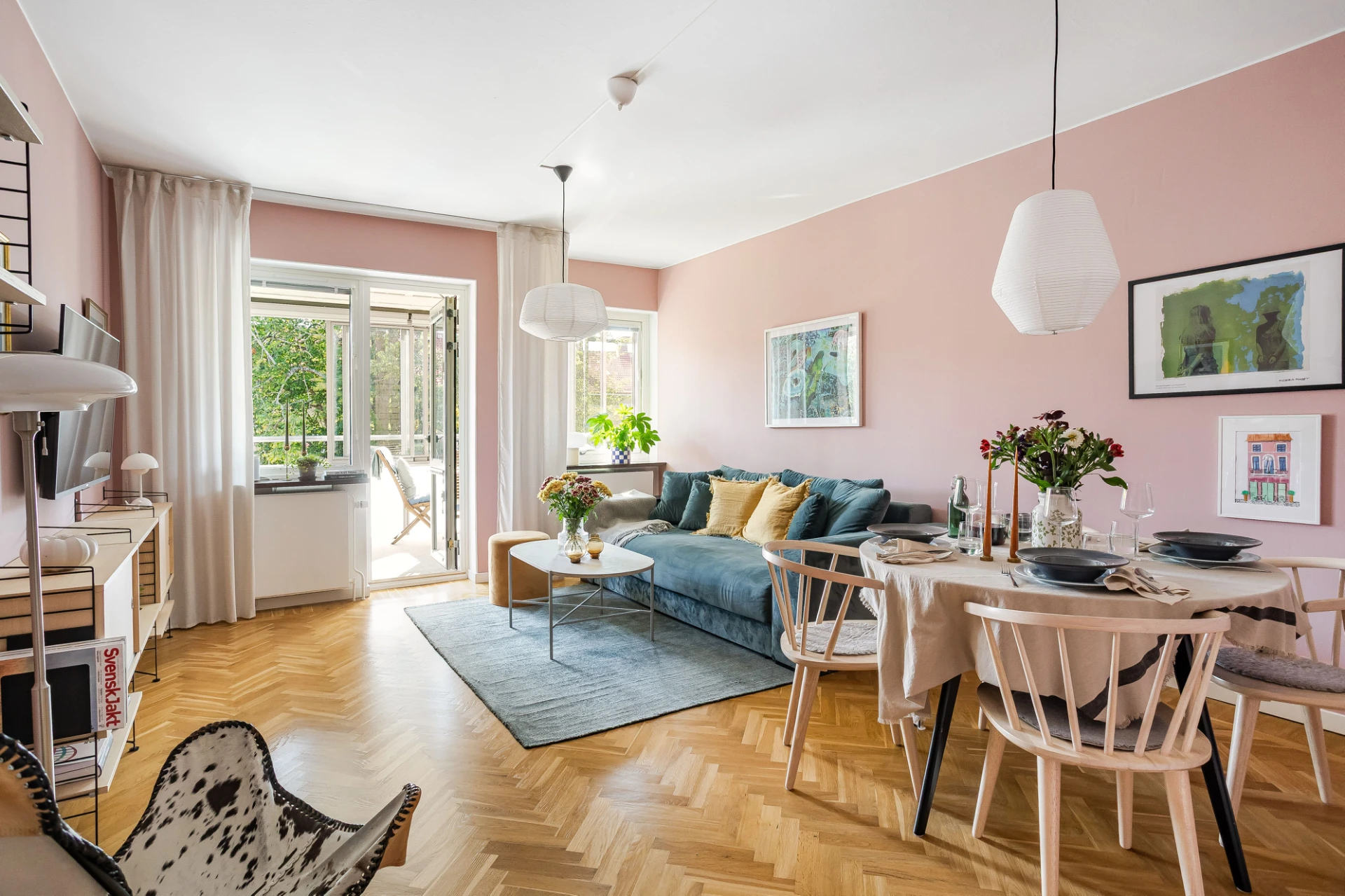 Stort härligt vardagsrum med väggar i härlig gammelrosa färg, vilket ger en otrolig värme och karaktär till den vackra fiskbensparketten som är kvar sedan begynnelsen. Detta rum möjliggör många olika möbleringar för olika tillfällen. Det är också härifrån som ni når den härligt inglasade balkongen.