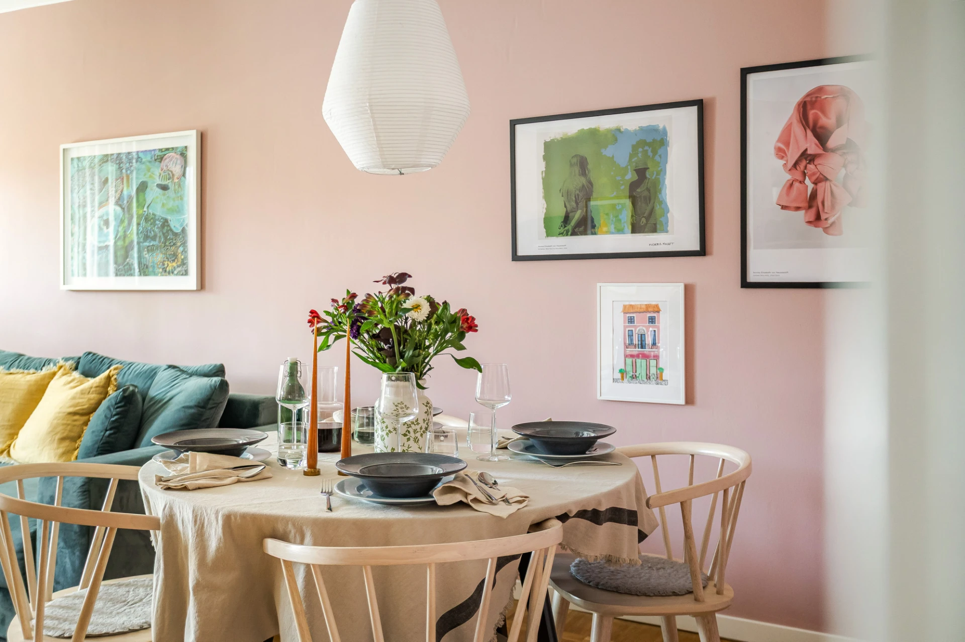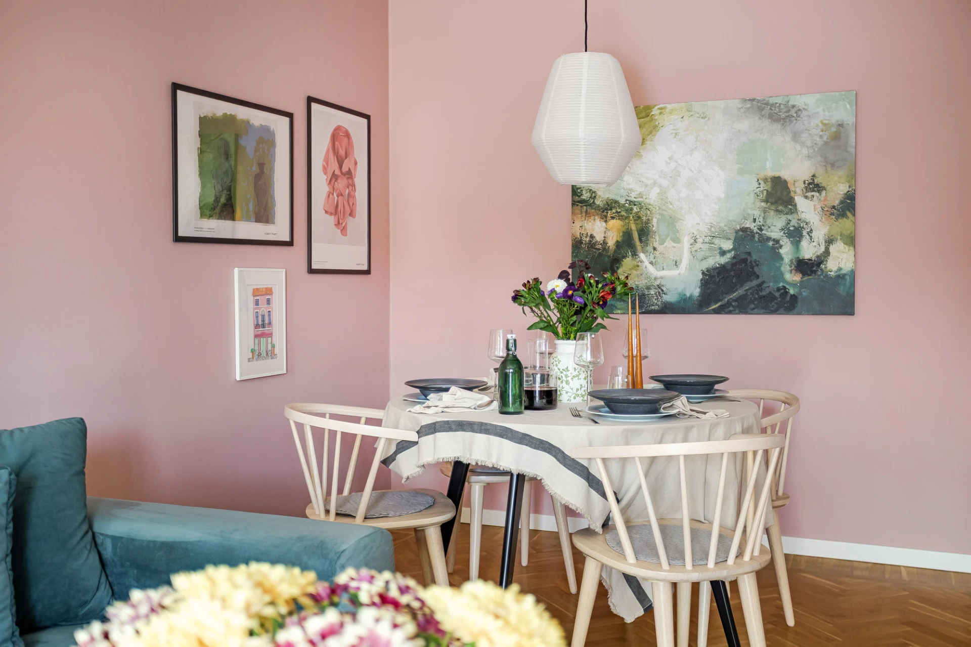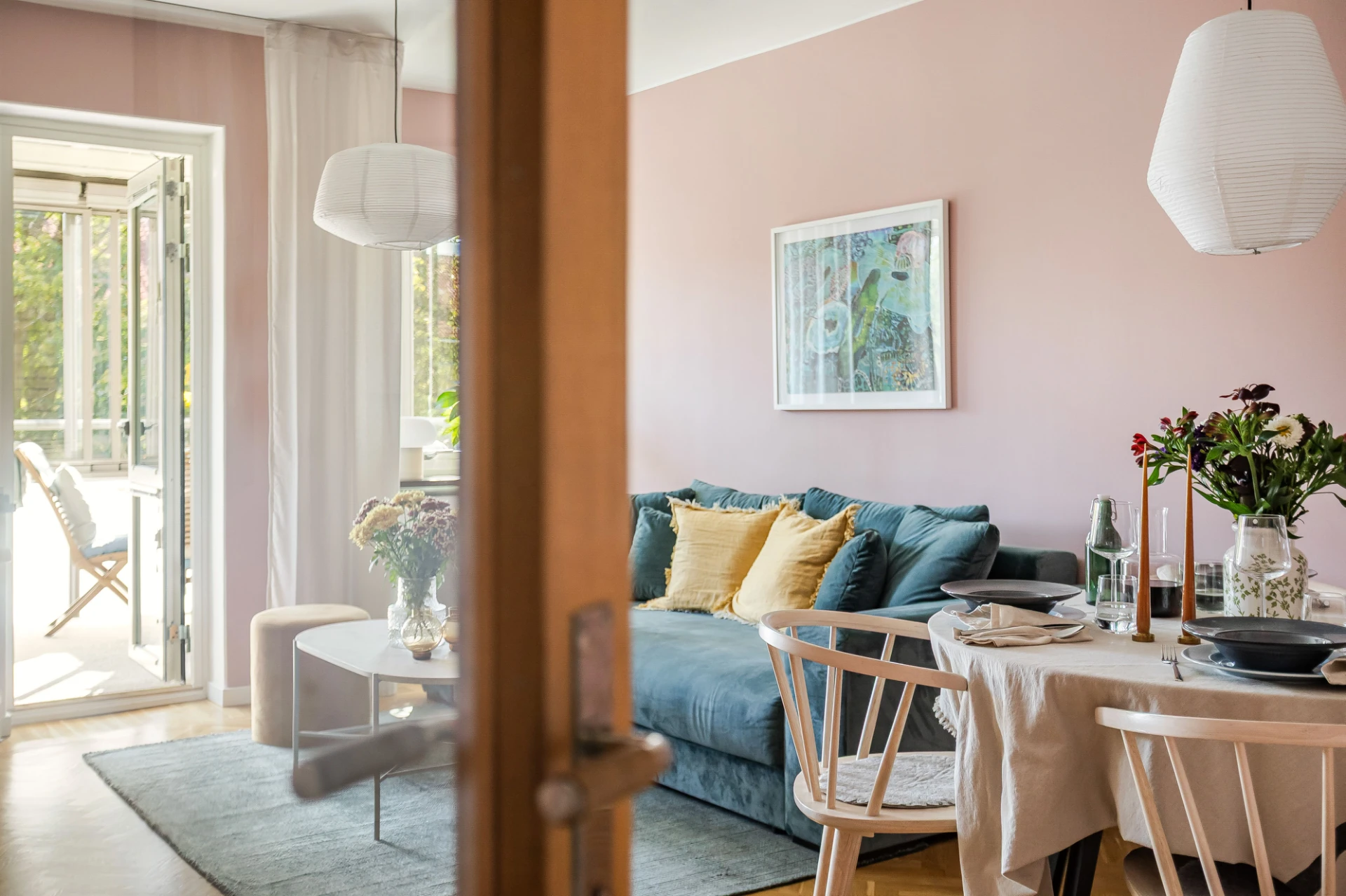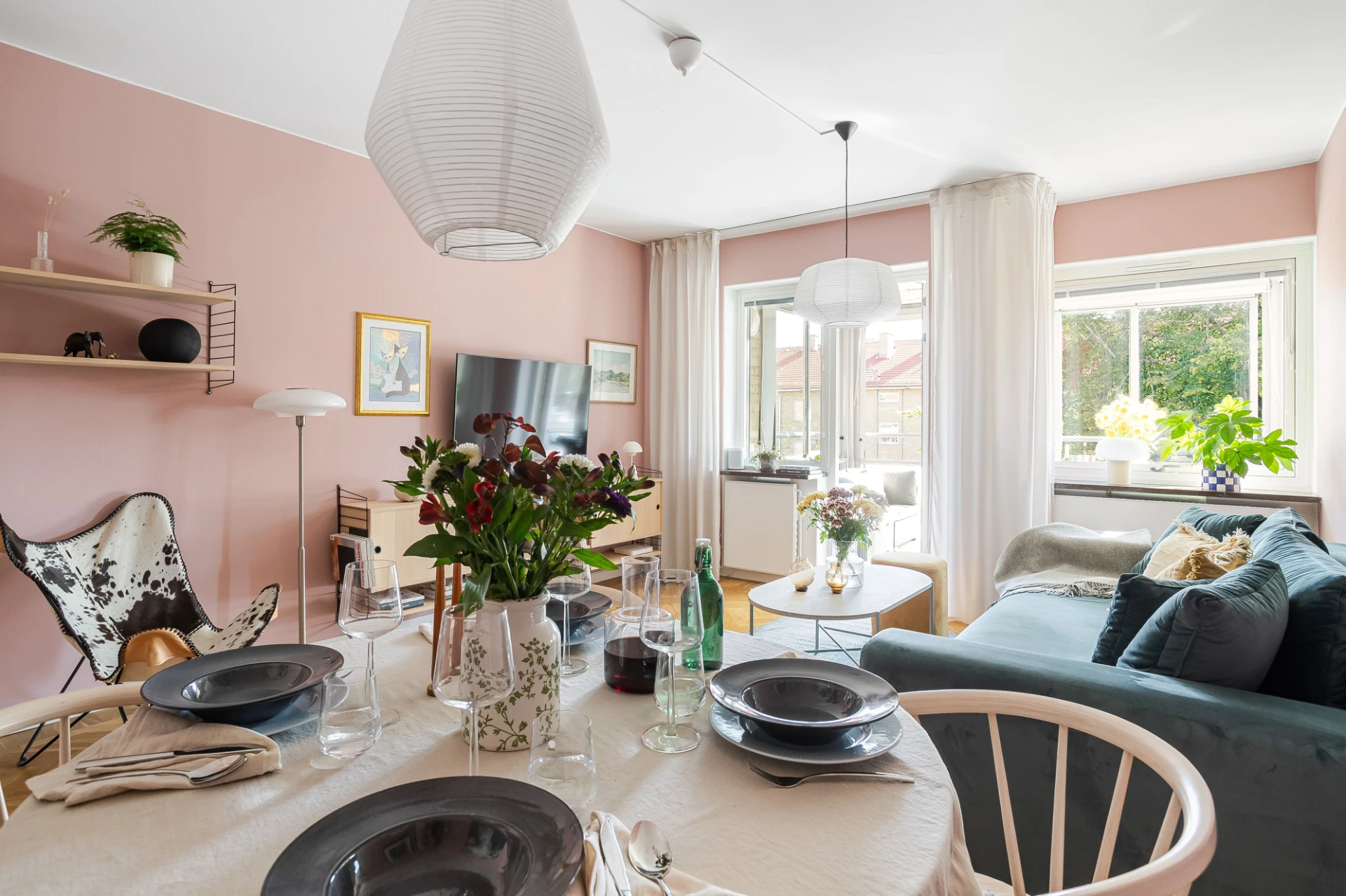 Stort härligt vardagsrum med väggar i härlig gammelrosa färg, vilket ger en otrolig värme och karaktär till den vackra fiskbensparketten som är kvar sedan begynnelsen. Detta rum möjliggör många olika möbleringar för olika tillfällen. Det är också härifrån som ni når den härligt inglasade balkongen.