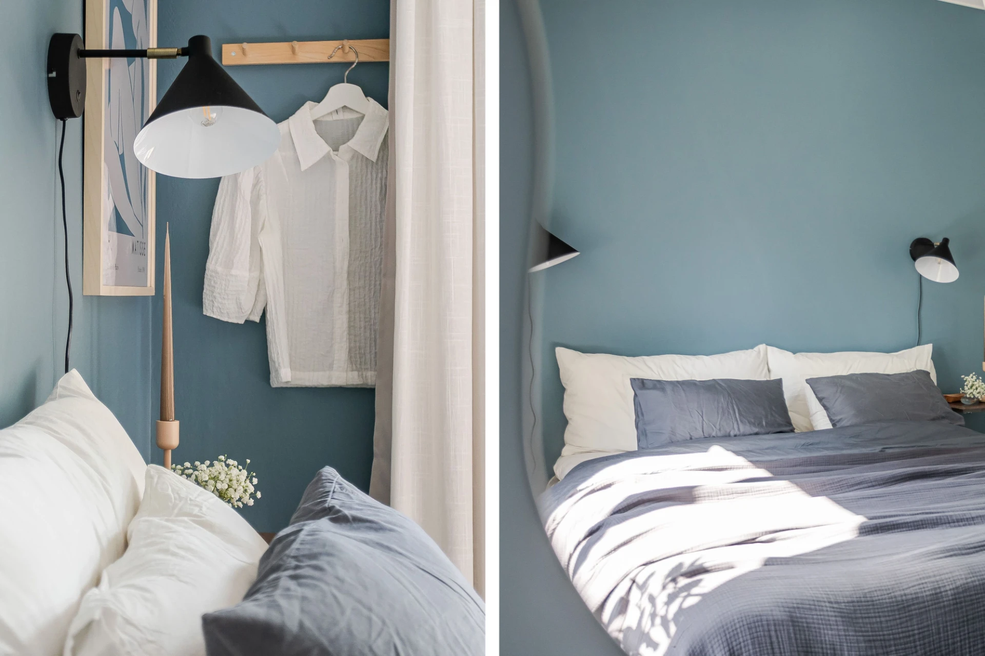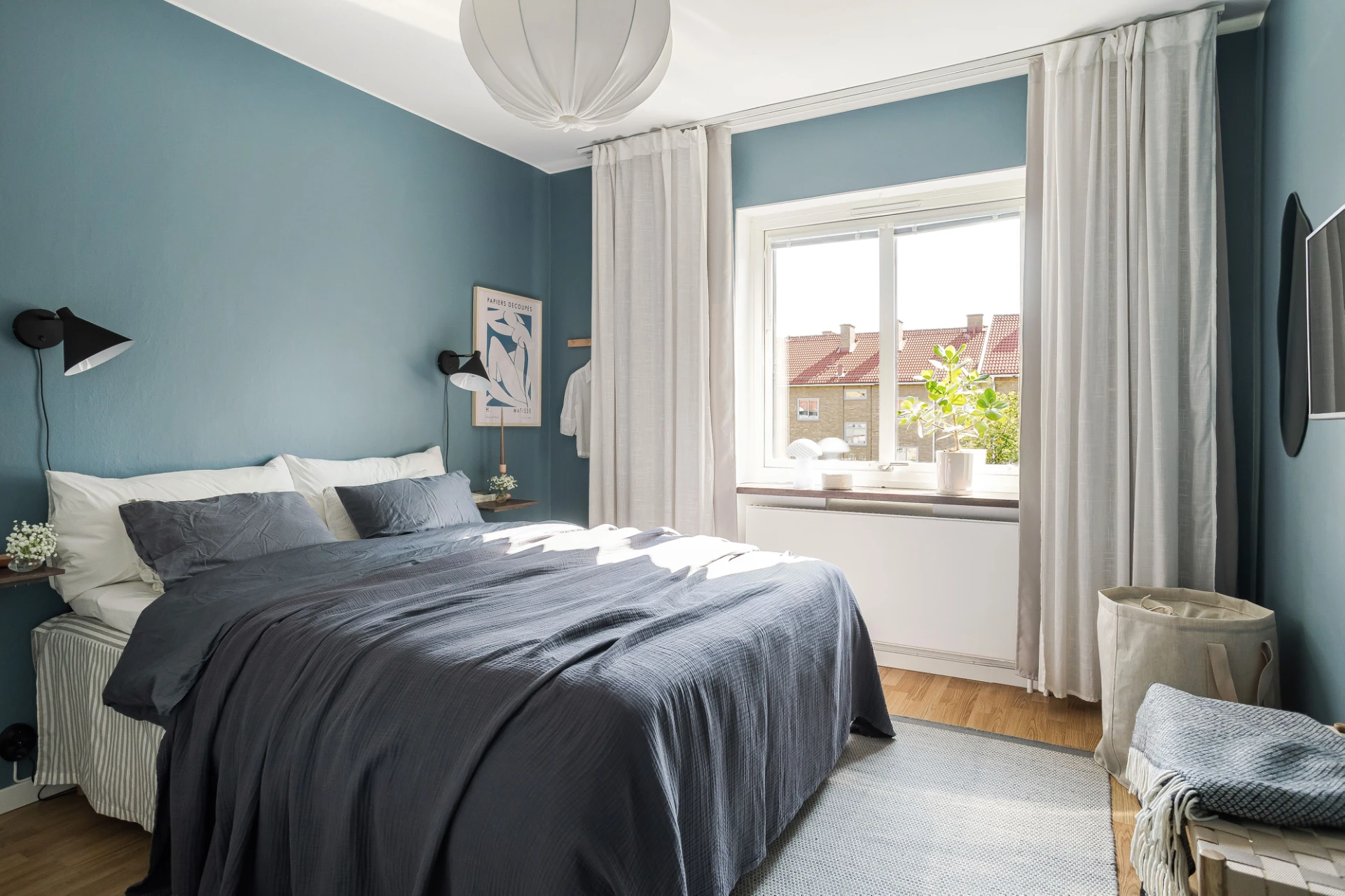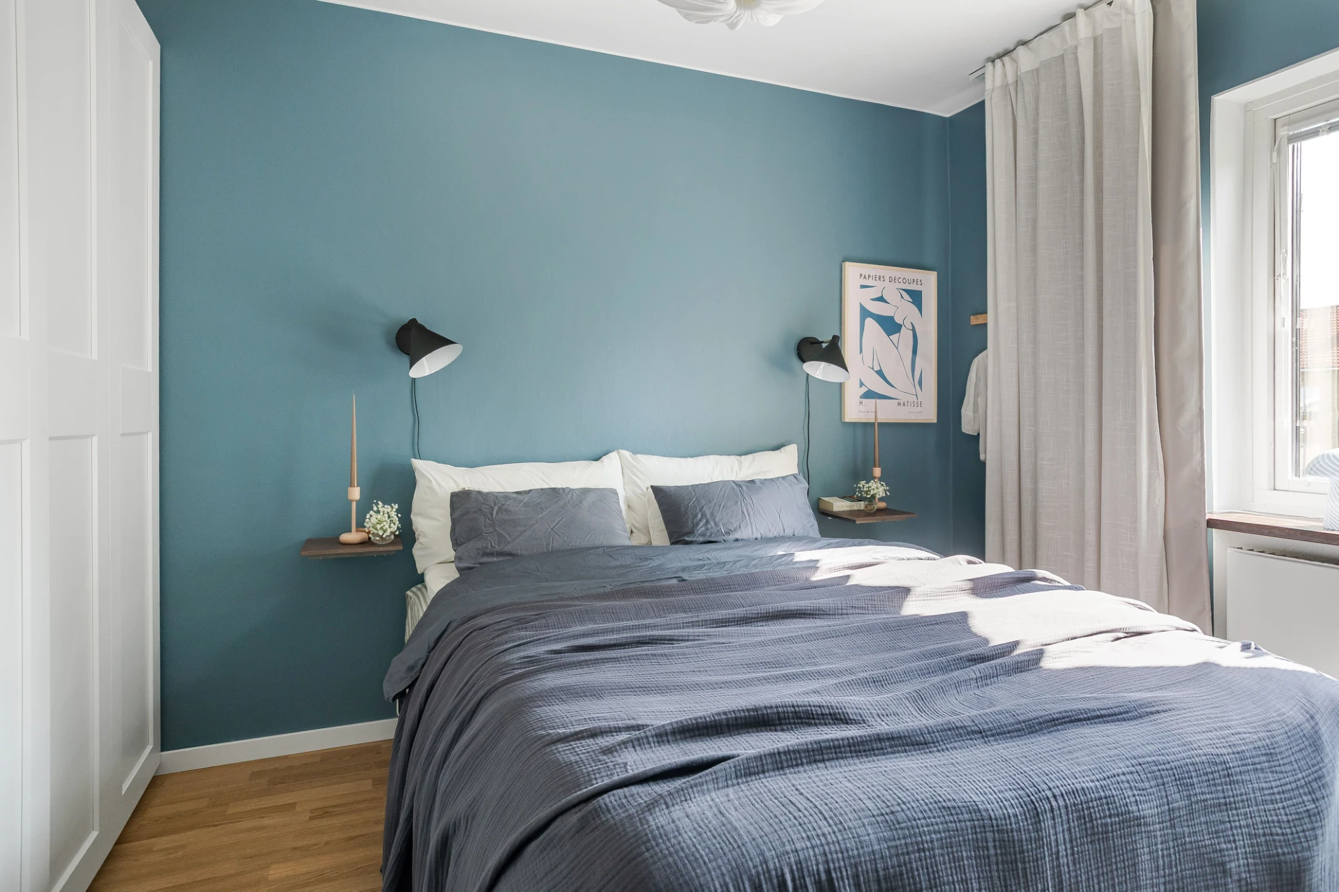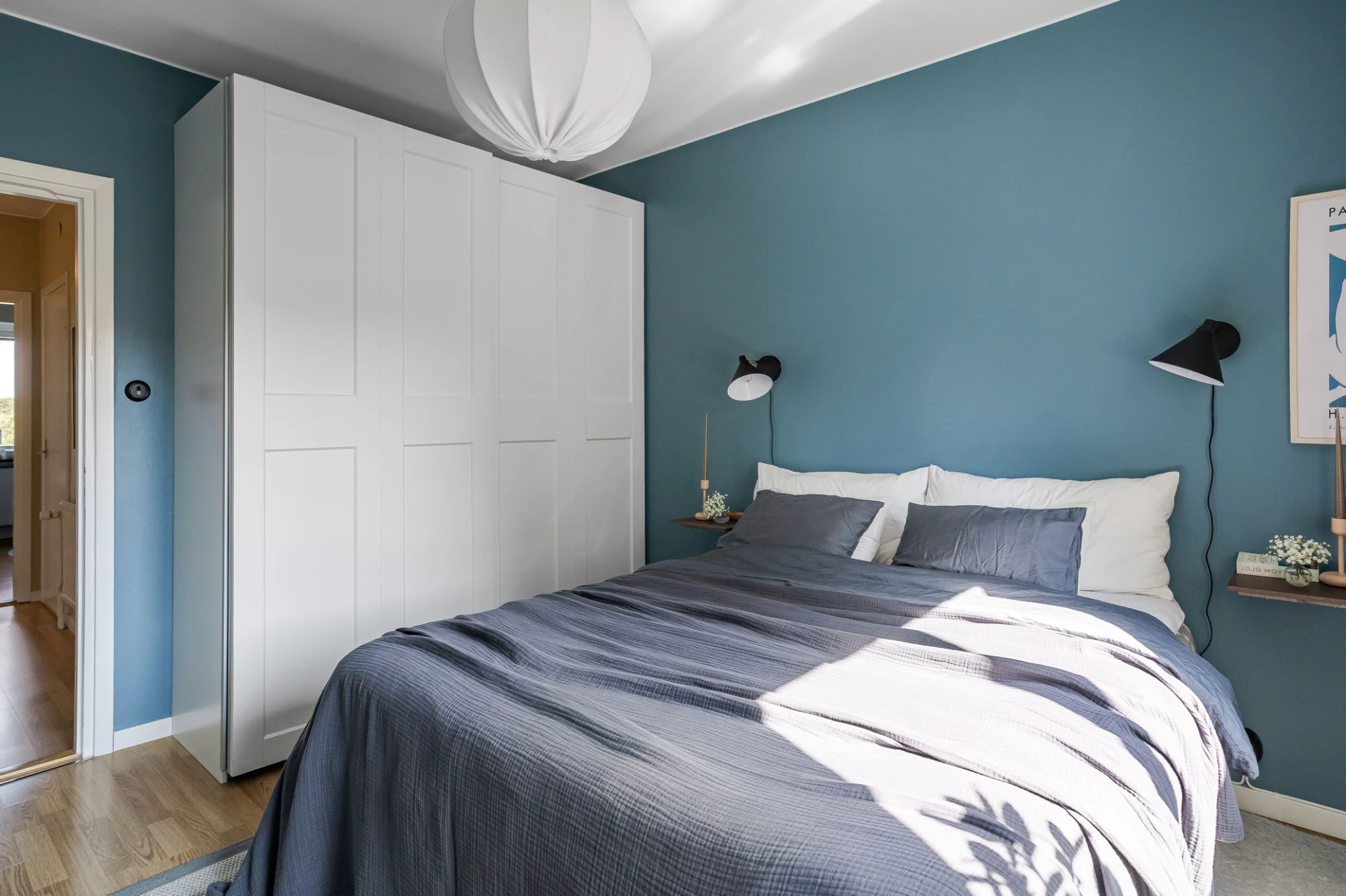 Stort sovrum med väggarna i petroleum. Här finns samma laminatgolv som i hall och även det andra sovrummet. Här finns också flertalet garderober bakom snygga skjutpartier.