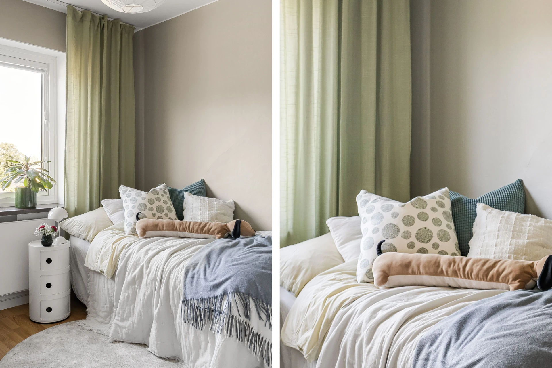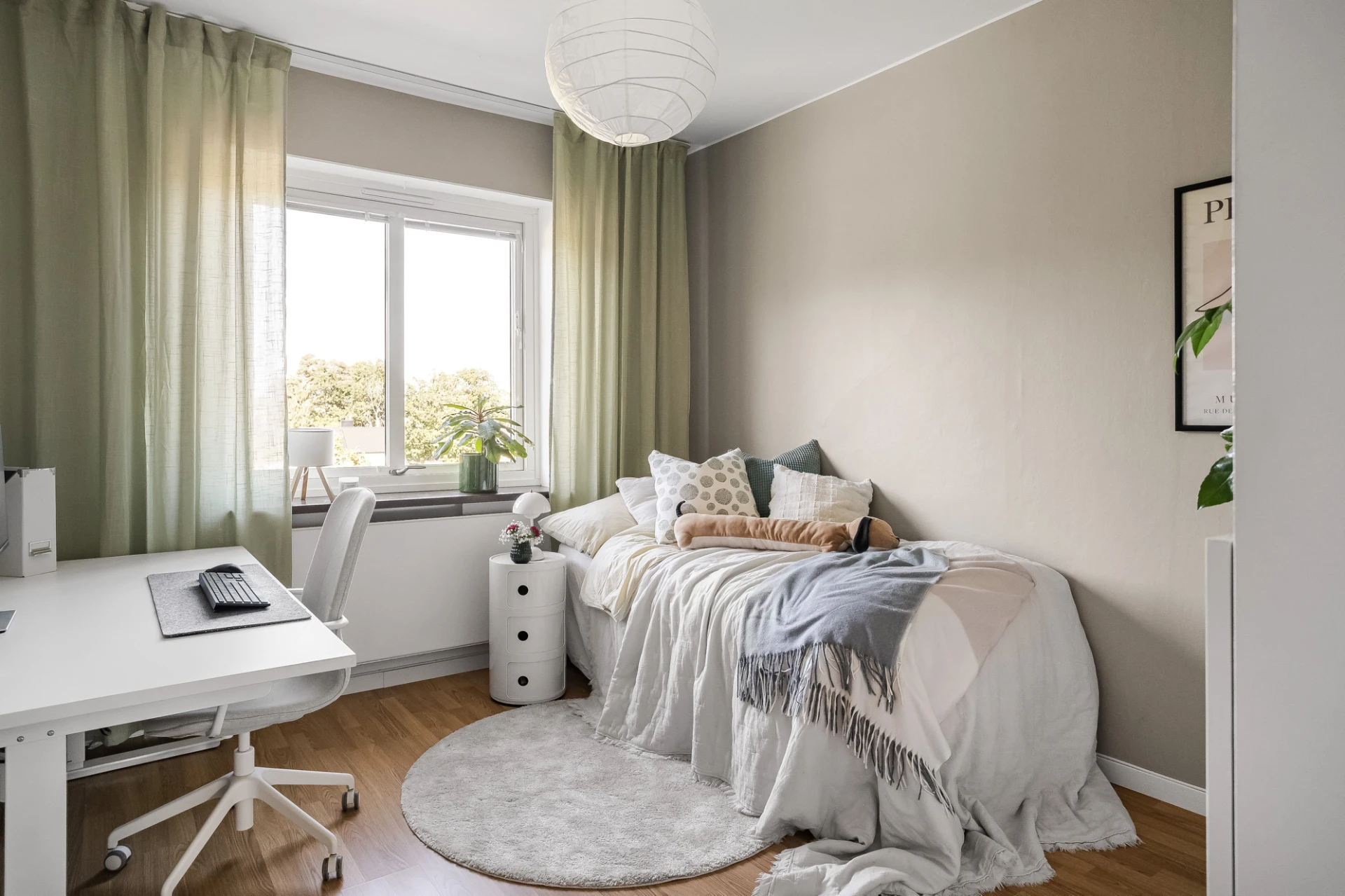 Rymligt sovrum med beiga väggar samma golv som i hall och i det andra sovrummet och hall.