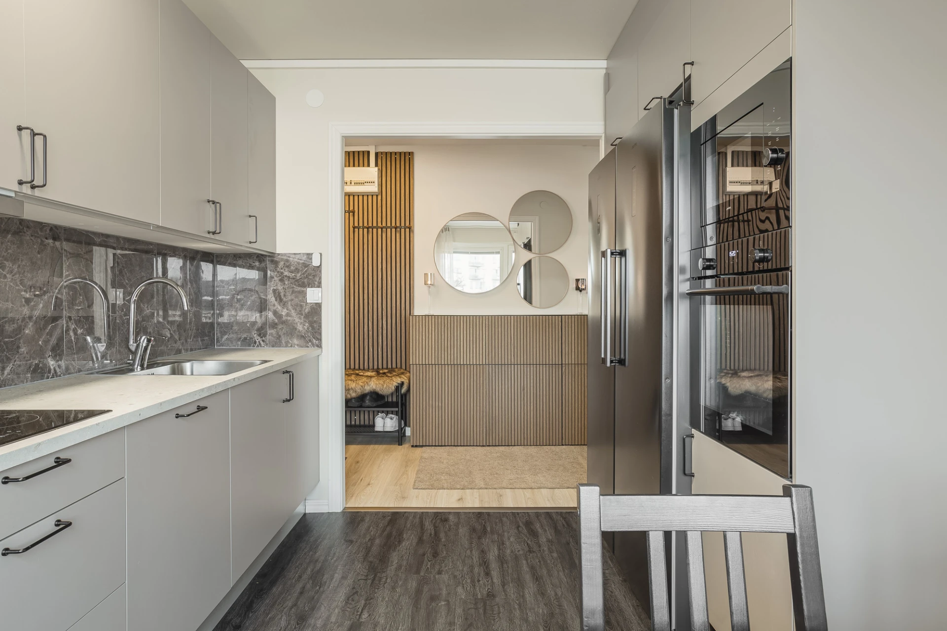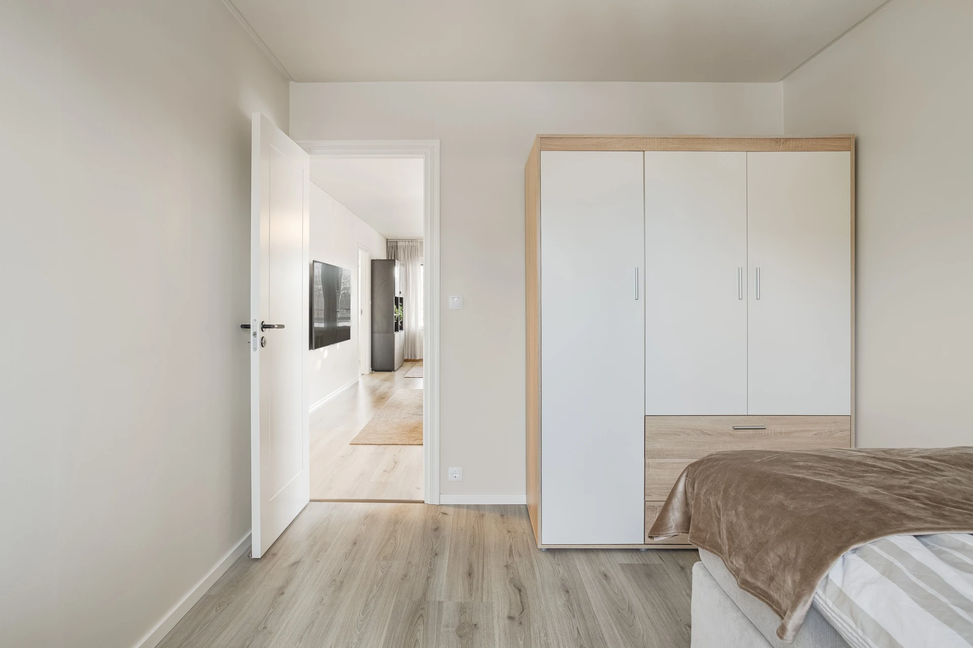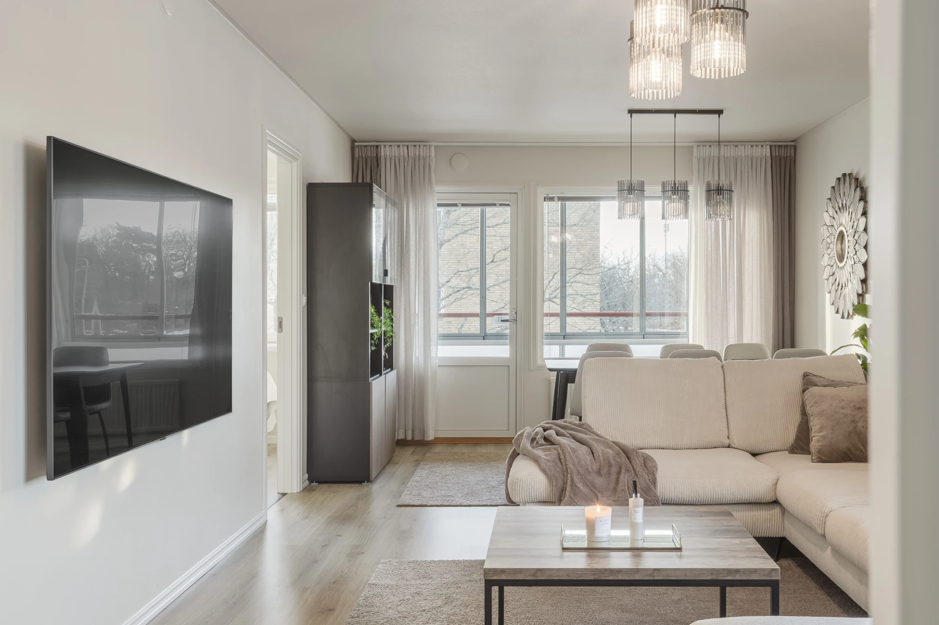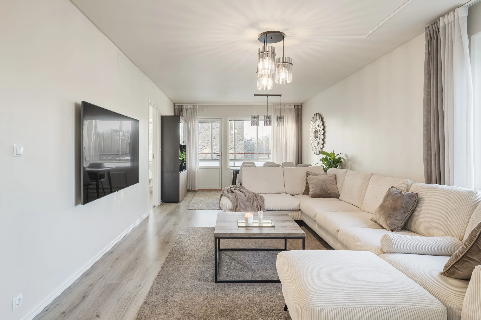 Redan innanför dörren får du känslan av nytt och fräscht! Här har inget lämnats åt slumpen, bostaden är totalrenoverad. Alla väggar har en behaglig beige ton och det är samma golv i hela lägenheten.