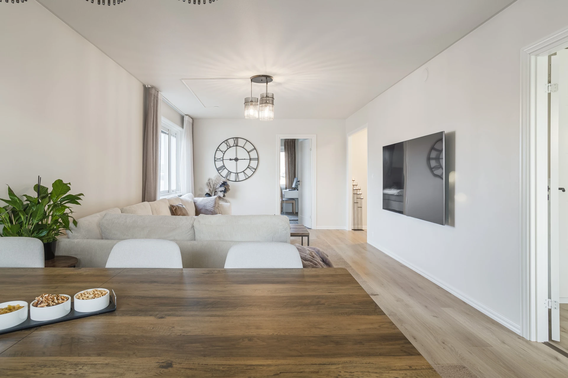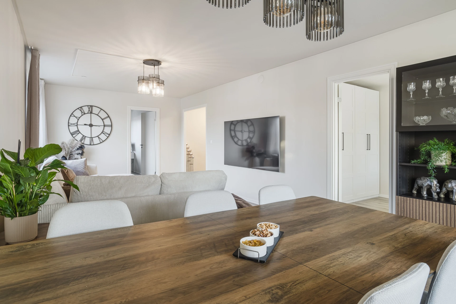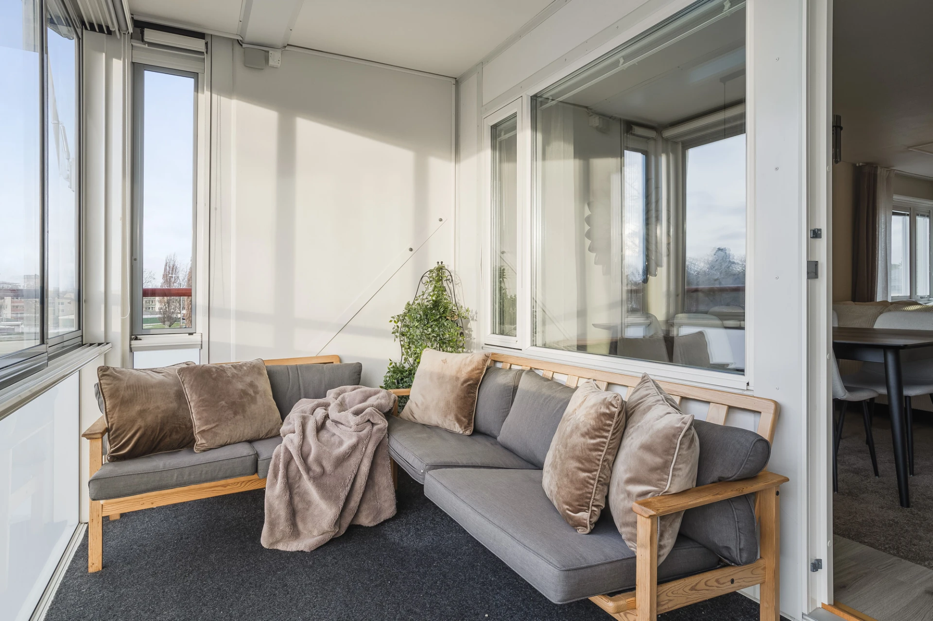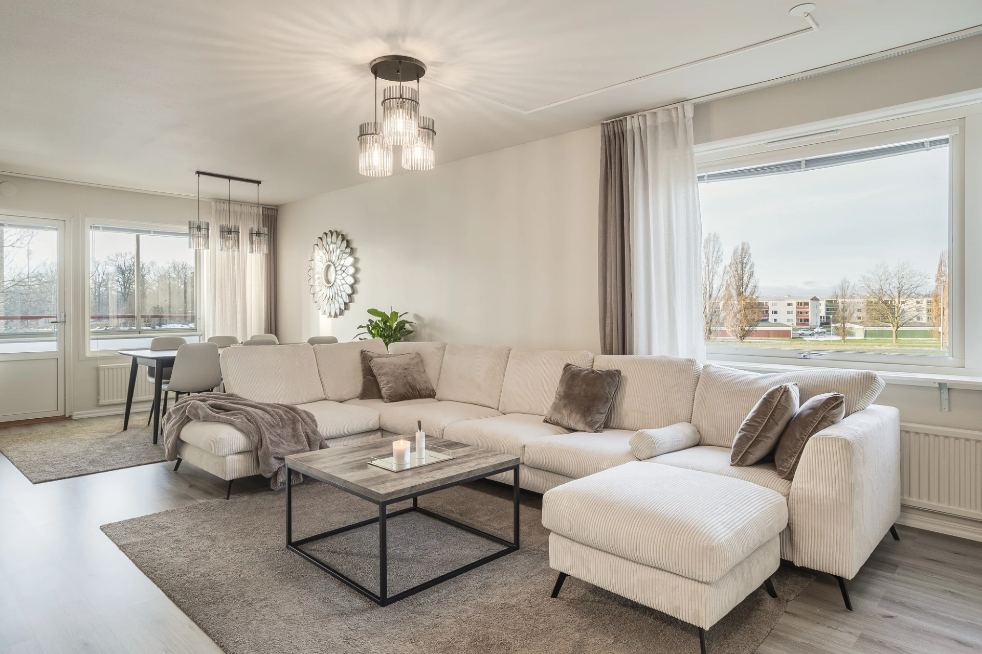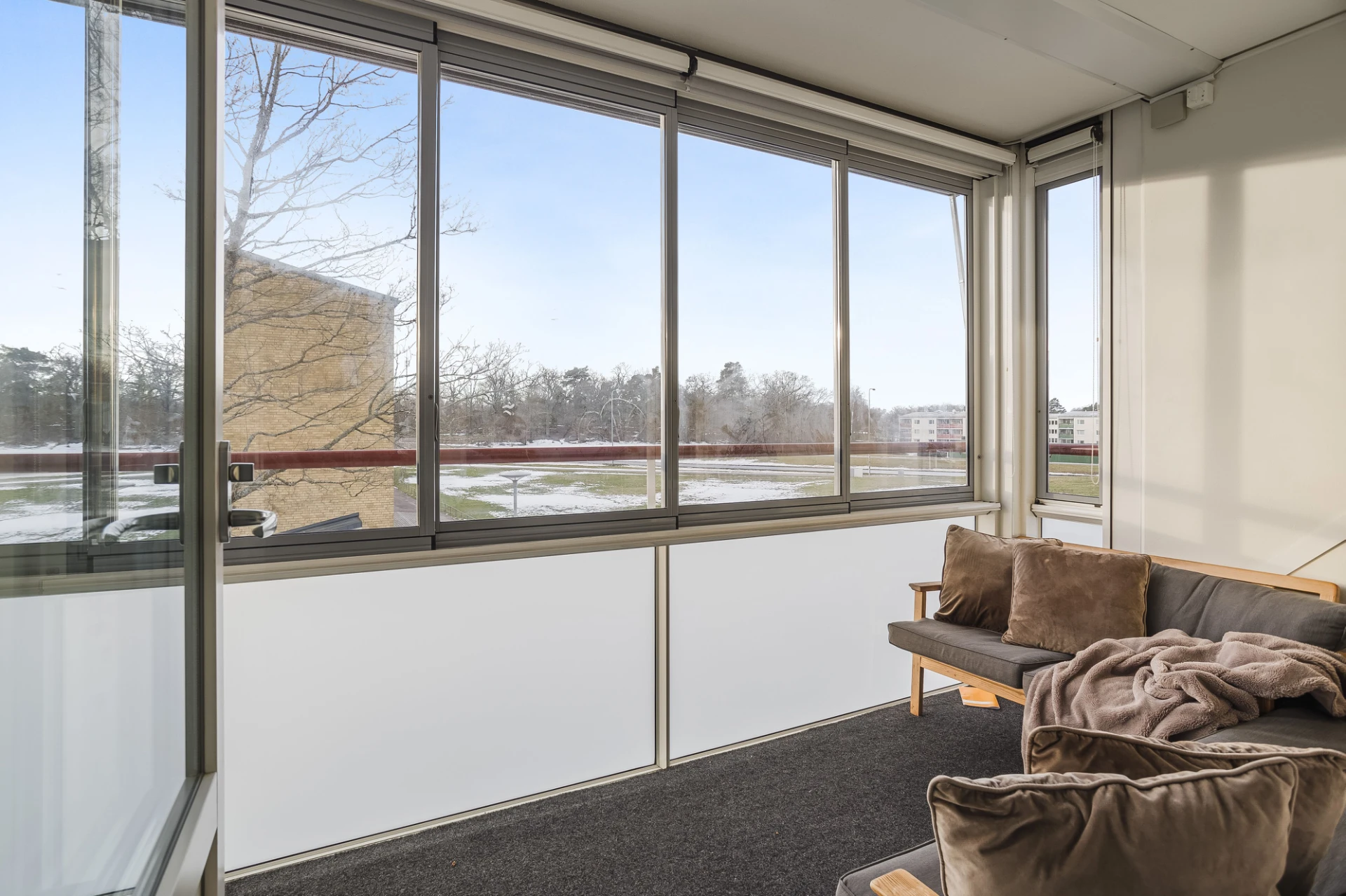 Vardagsrummet är stort, här är det egentligen du själv som bestämmer hur du önska möblera. Den större soffgruppen får enkelt plats och tack vare gavelläget och vid fönstret inryms enkelt en rejäl matsalsgrupp medans andra önskar en avslappnande läshörna. Du avgör! Det är också från vardagsrummet vi kommer ut på den generöst tilltagna inglasade balkongen. Detta är verkligen som ett extra rum som förlänger sommarsäsongen såväl vår som höst. Tänk dig själv att avnjuta första koppen kaffe på morgonen till att hänga med familj eller vänner under eftermiddagen och kvällen.