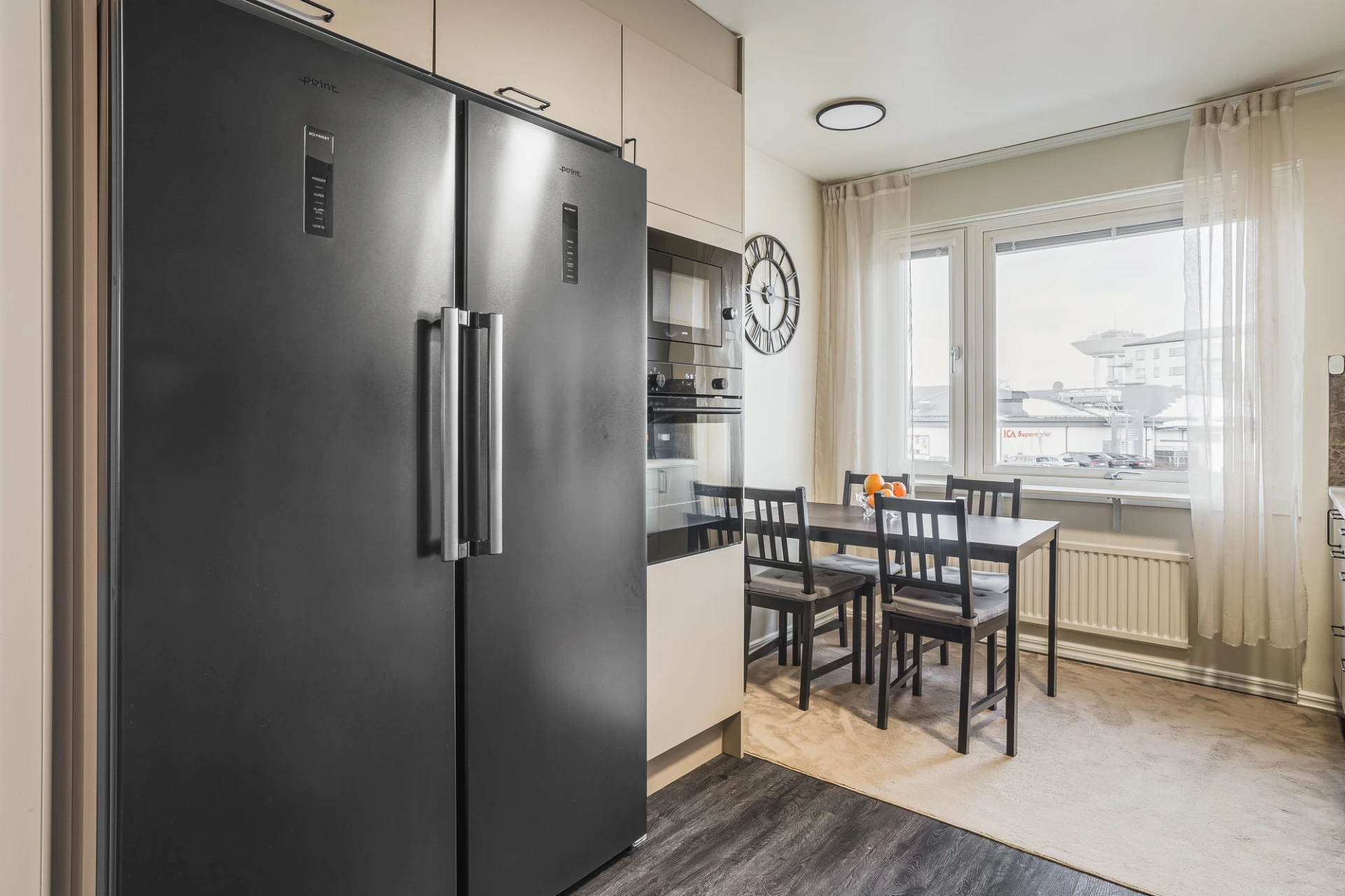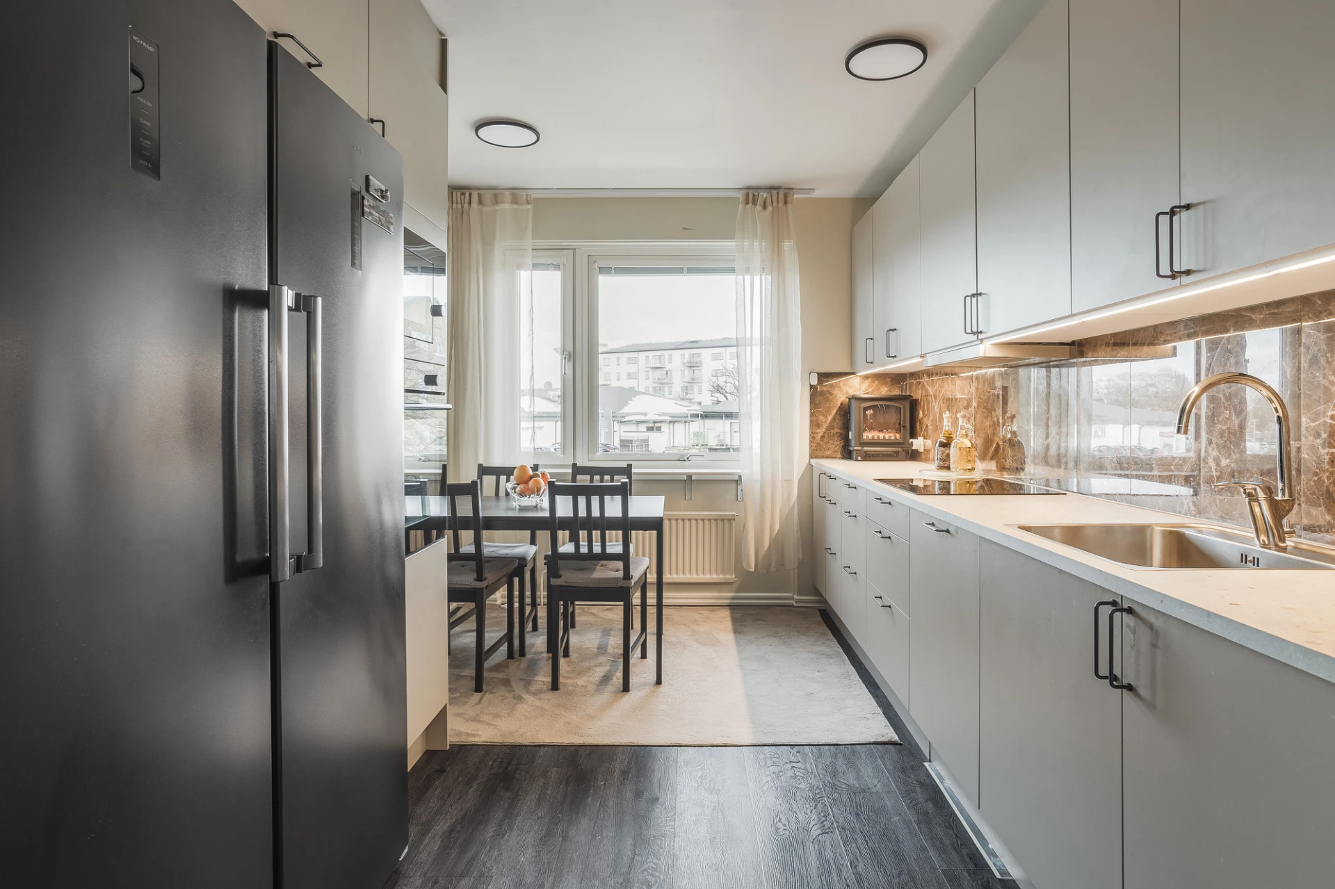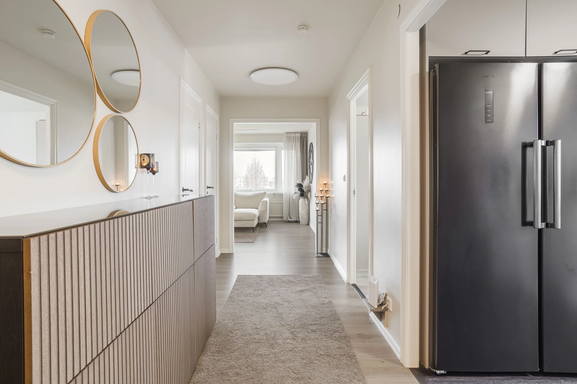 Trevlig, modern och välkomnade hall med gott om förvaring. Ljusa golv och beiga väggar. Direkt till höger finner vi det rymliga moderna köket från HTH. Beiga luckor med svarta handtag. Ljusare bänkskiva och mörkare tapet bakom glasskiva som stänkskydd. Den moderna utrustning iform av indukationshäll, integrerad diskmaskin, hel kyl och frys samt inbyggnadsugn och inbyggnadsmicro. Vidare in i bostaden finner vi två praktiska sovrum i bra storlek. Samma beiga färg som på övriga väggar i bostaden och samma golv. Detta ger verkligen ett rofyllt intryck för hela bostaden. Därefter önskar jag att hälsa er välkomna till det väl tilltagna vardagsrummet. Här slås vi av ljuset från två håll tack vare gavelläget. Här får ni plats med allt ni önskar, matsalsbord, vitrinskåp, tv-möbel, soffa och soffbord. Det är också härifrån ni når den stora inglasade balkongen som kommer förlänga sommarsäsongen vår som höst. Väggarna i vardagsrummet har samma färg som övriga väggar i bostaden och även golvet är detsamma. Från vardagsrummet når man det tredje sovrummet. Även det med samma golv och färg på väggarna. Bostaden har två badrum, en gästtoalett och ett lite större badrum. Båda är helkaklade sedan stambytet. Det större har dusch, handfat, spegelskåp och wc.