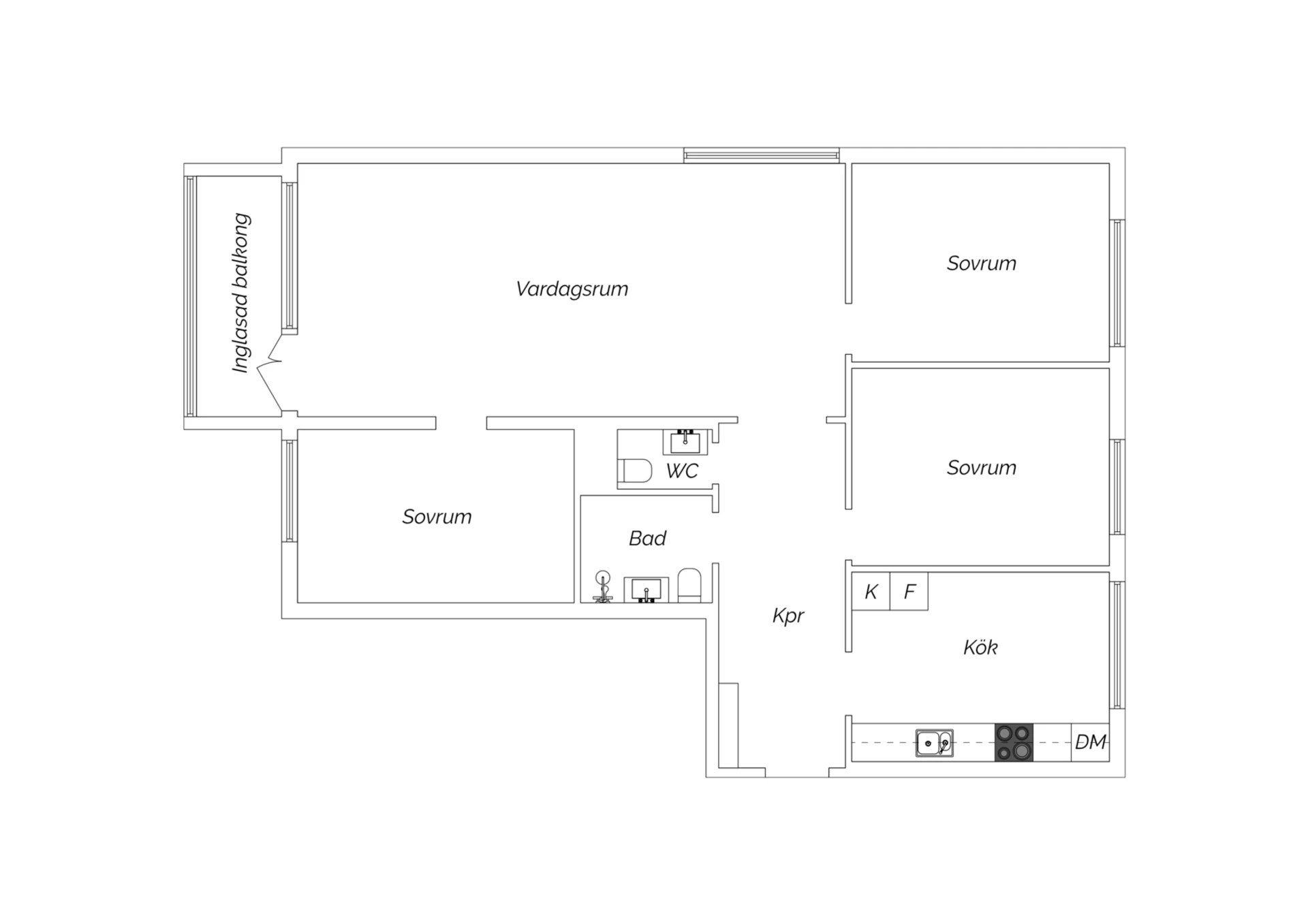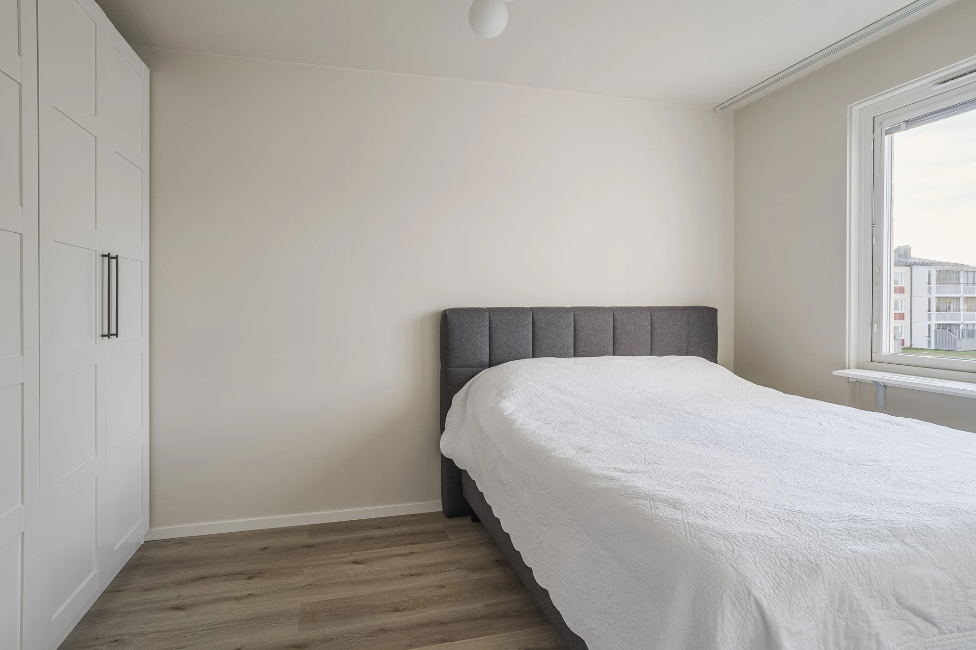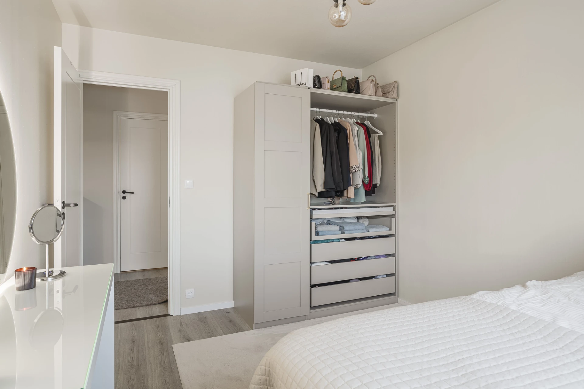 Trevlig, modern och välkomnade hall med gott om förvaring. Ljusa golv och beiga väggar. Direkt till höger finner vi det rymliga moderna köket från HTH. Beiga luckor med svarta handtag. Ljusare bänkskiva och mörkare tapet bakom glasskiva som stänkskydd. Den moderna utrustning iform av indukationshäll, integrerad diskmaskin, hel kyl och frys samt inbyggnadsugn och inbyggnadsmicro. Vidare in i bostaden finner vi två praktiska sovrum i bra storlek. Samma beiga färg som på övriga väggar i bostaden och samma golv. Detta ger verkligen ett rofyllt intryck för hela bostaden. Därefter önskar jag att hälsa er välkomna till det väl tilltagna vardagsrummet. Här slås vi av ljuset från två håll tack vare gavelläget. Här får ni plats med allt ni önskar, matsalsbord, vitrinskåp, tv-möbel, soffa och soffbord. Det är också härifrån ni når den stora inglasade balkongen som kommer förlänga sommarsäsongen vår som höst. Väggarna i vardagsrummet har samma färg som övriga väggar i bostaden och även golvet är detsamma. Från vardagsrummet når man det tredje sovrummet. Även det med samma golv och färg på väggarna. Bostaden har två badrum, en gästtoalett och ett lite större badrum. Båda är helkaklade sedan stambytet. Det större har dusch, handfat, spegelskåp och wc.