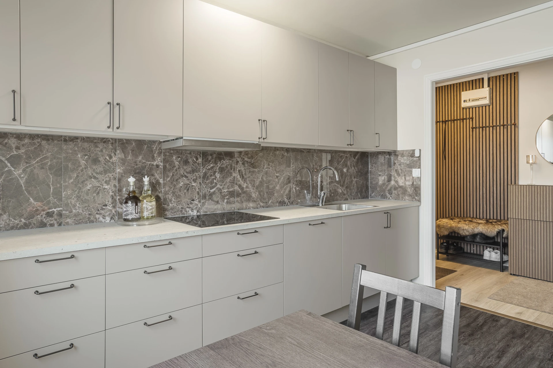 I hallen slås du av ljuset dels från vardagsrummet, tack vare gavelläget och från köksfönstret. Det är kanske lika bra att börja där. Köket kommer från HTH och är modert beiget med svarta handtag. En ljusare bänkskiva och glasskiva som stänkskydd. Här vill man sätta igång med matlagningen direkt och ni kan enkelt hjälpas åt med middagen då det finns gott om arbetsytor och sittplatser för att senare servera middagen.