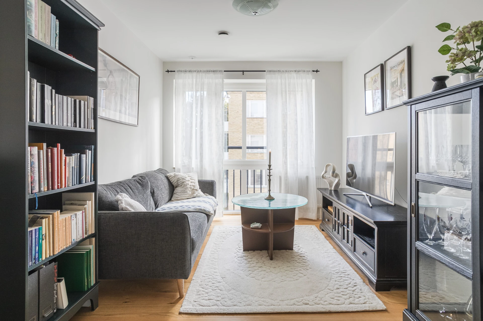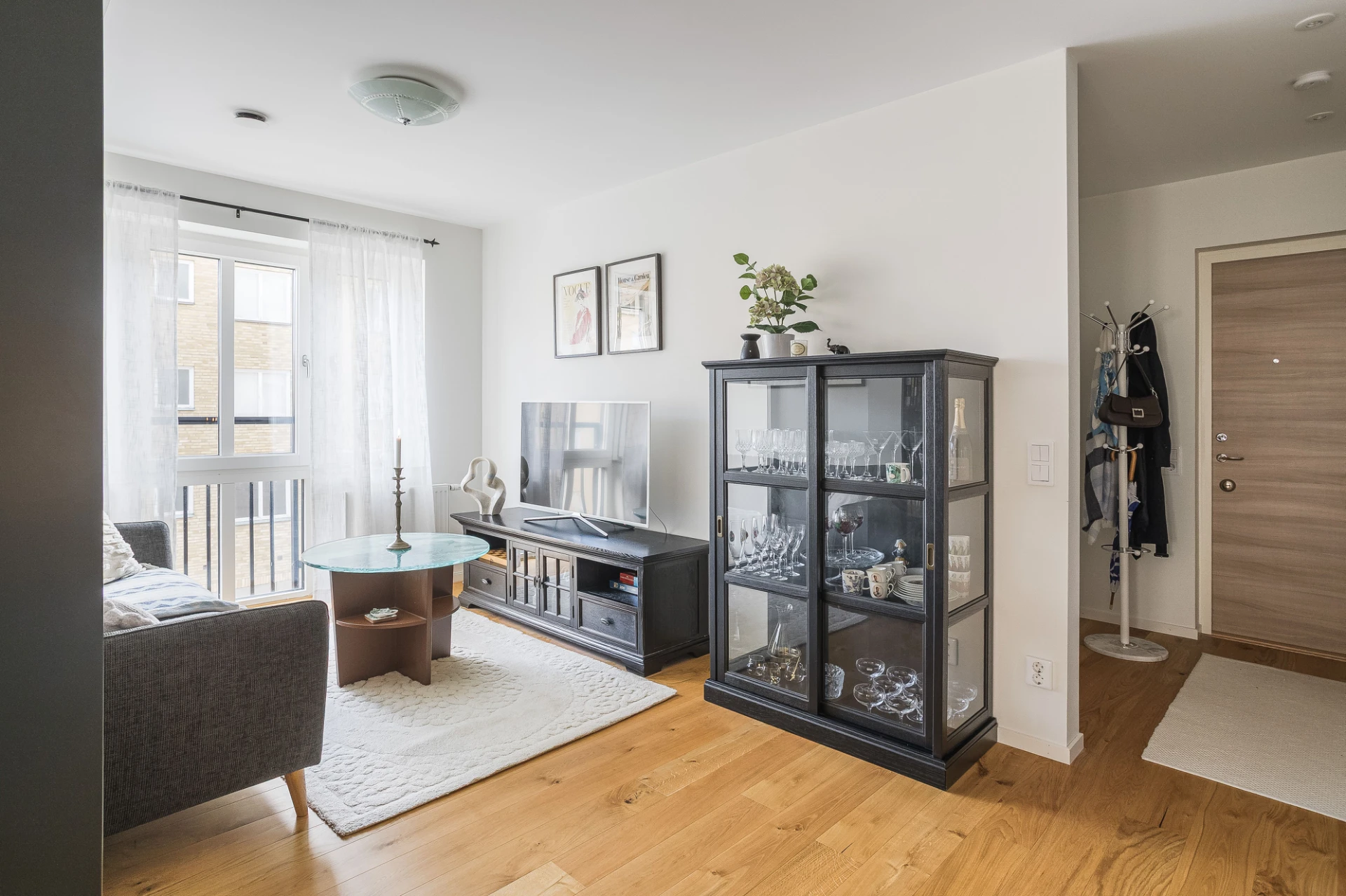 Mysigt vardagsrum med plats för soffa och tv. Det stora fönsterpartiet och den franska balkongen åt söder ger ett härligt ljusinsläpp.