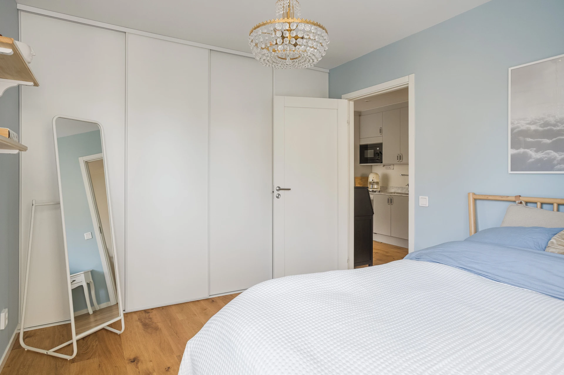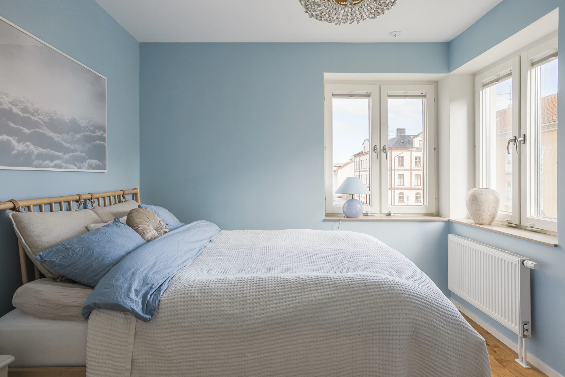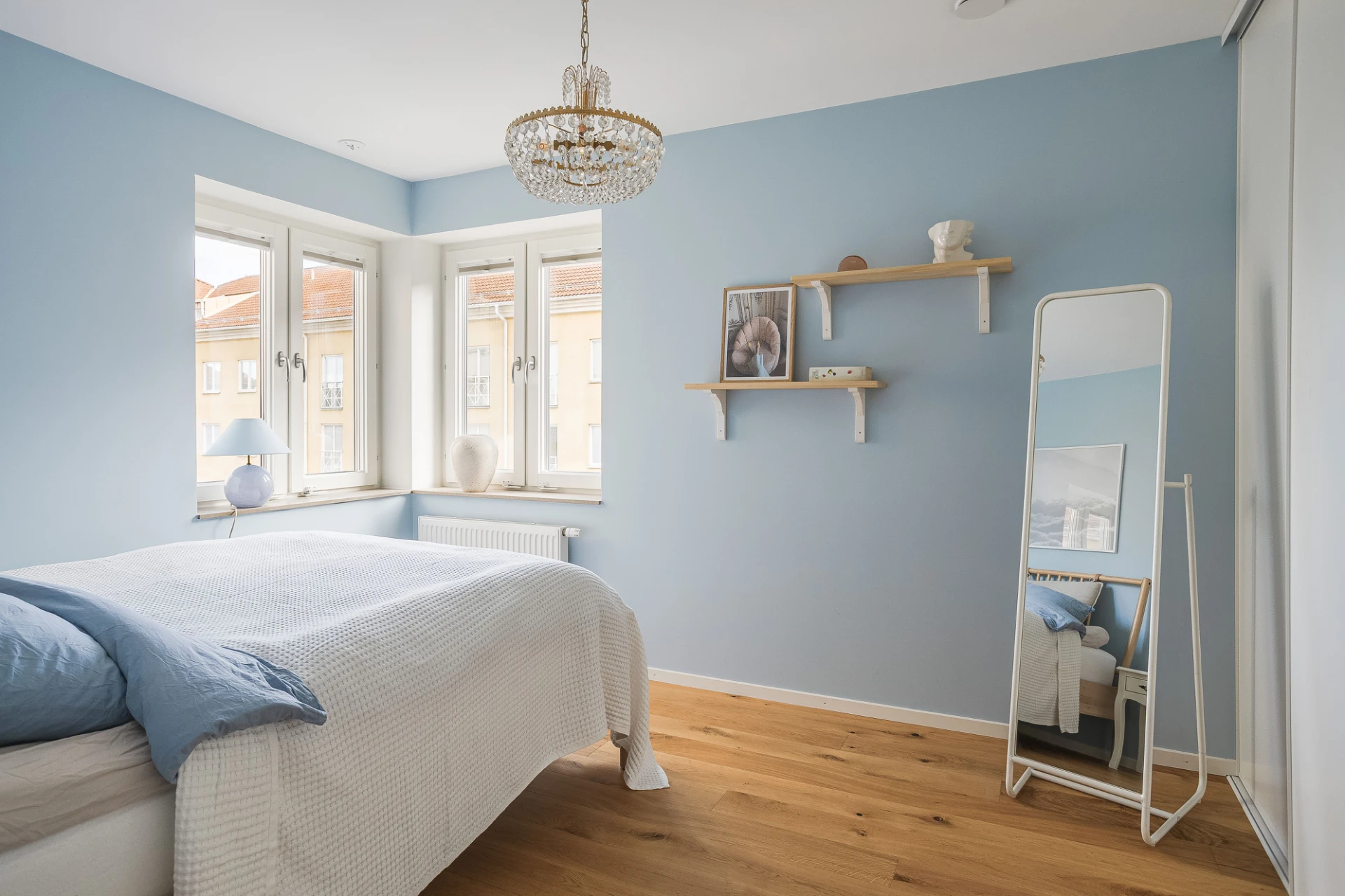 Rymligt sovrum med fönster åt både öster och söder. Generös klädförvaring i garderobsvägg med skjutdörrar.