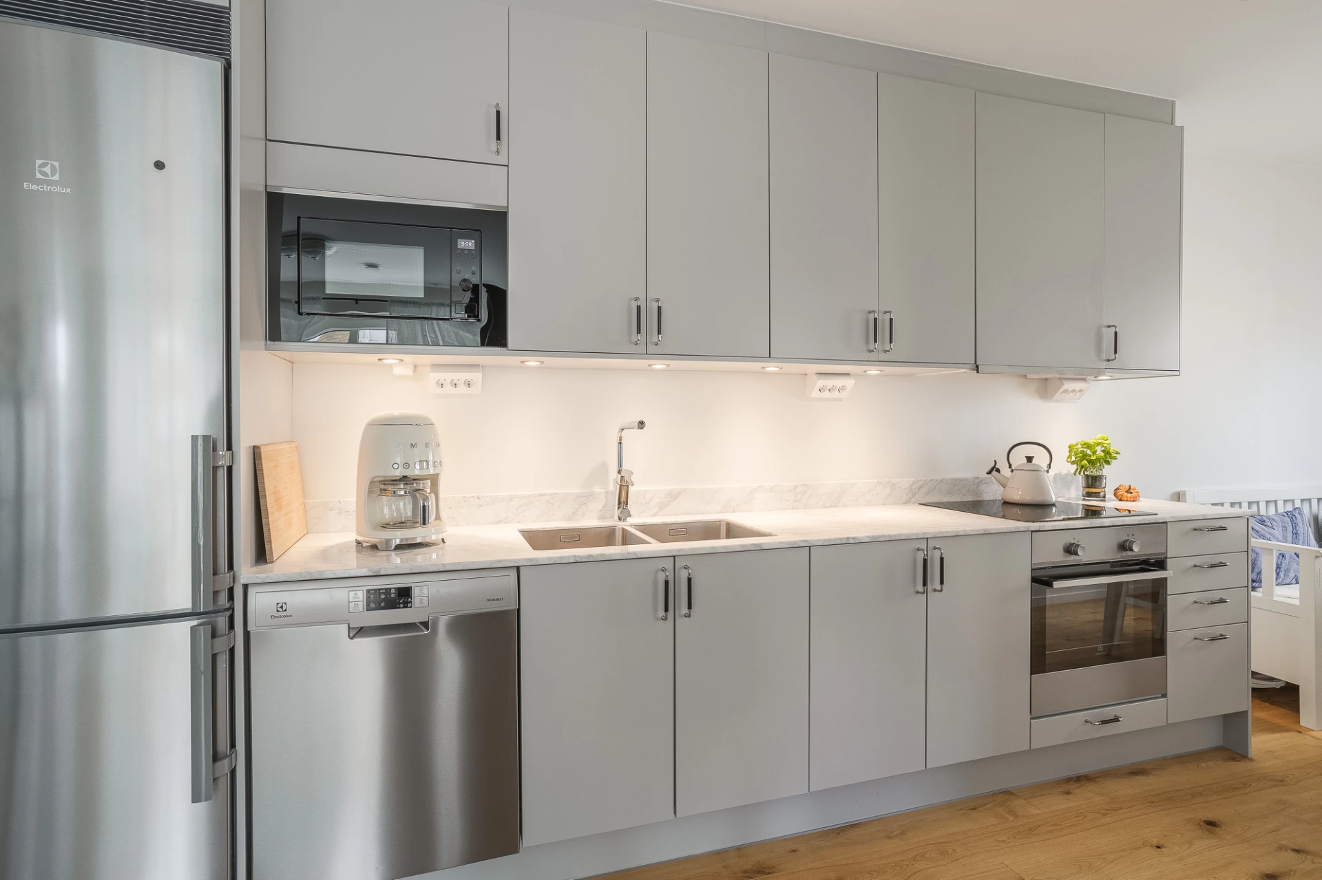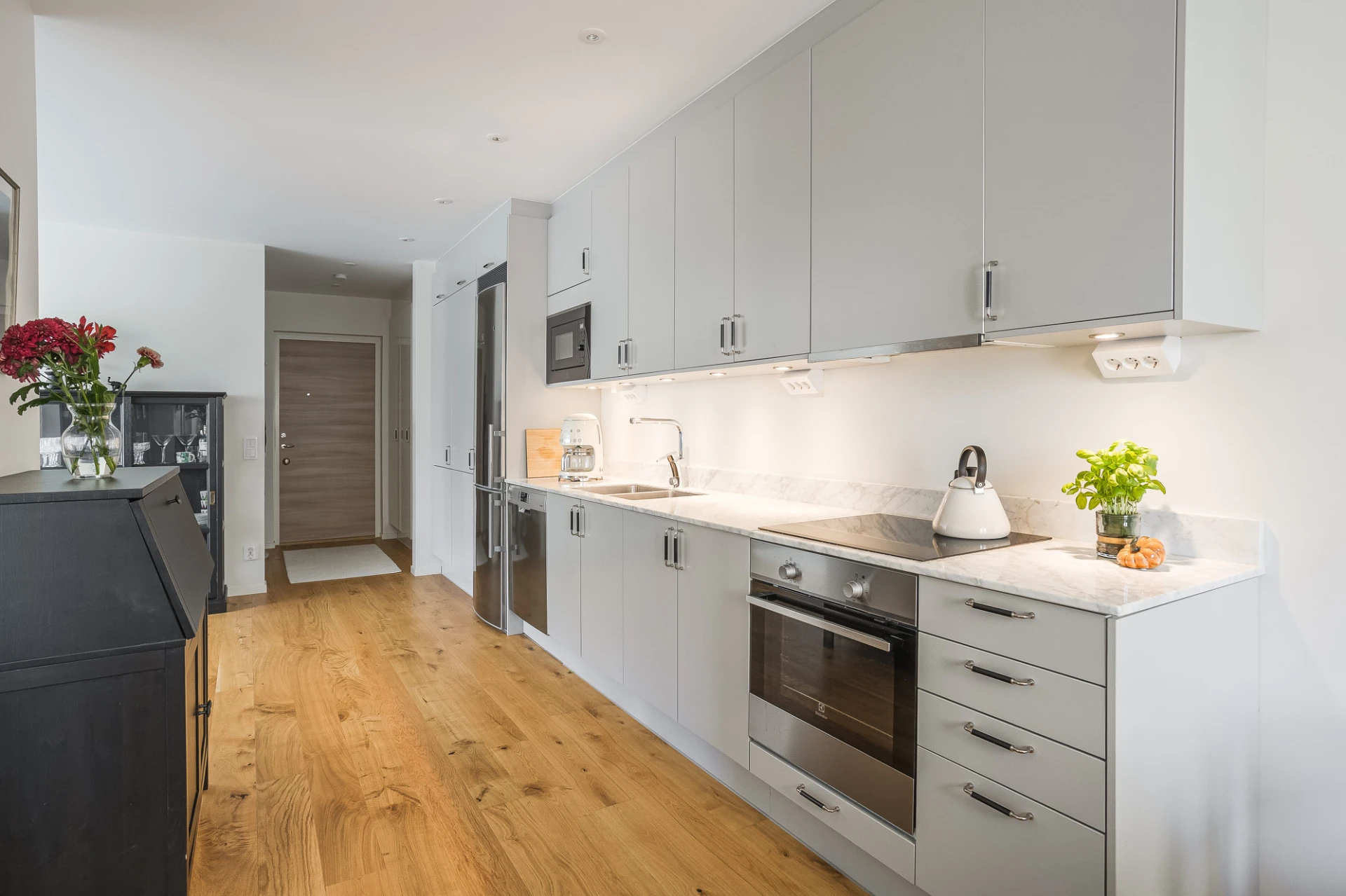 Snyggt kök från Sentens i grå toner. Köket erbjuder bra förvaring och arbetsytor i marmorskiva. Välutrustat med kyl/frys, inbyggd micro, diskmaskin, inbyggnadsugn, induktionshäll och fläkt. Fint utrymme för köksbord vid fönster åt öster. Den öppna planlösningen mot vardagsrumsdelen skapar en trivsam rymd.